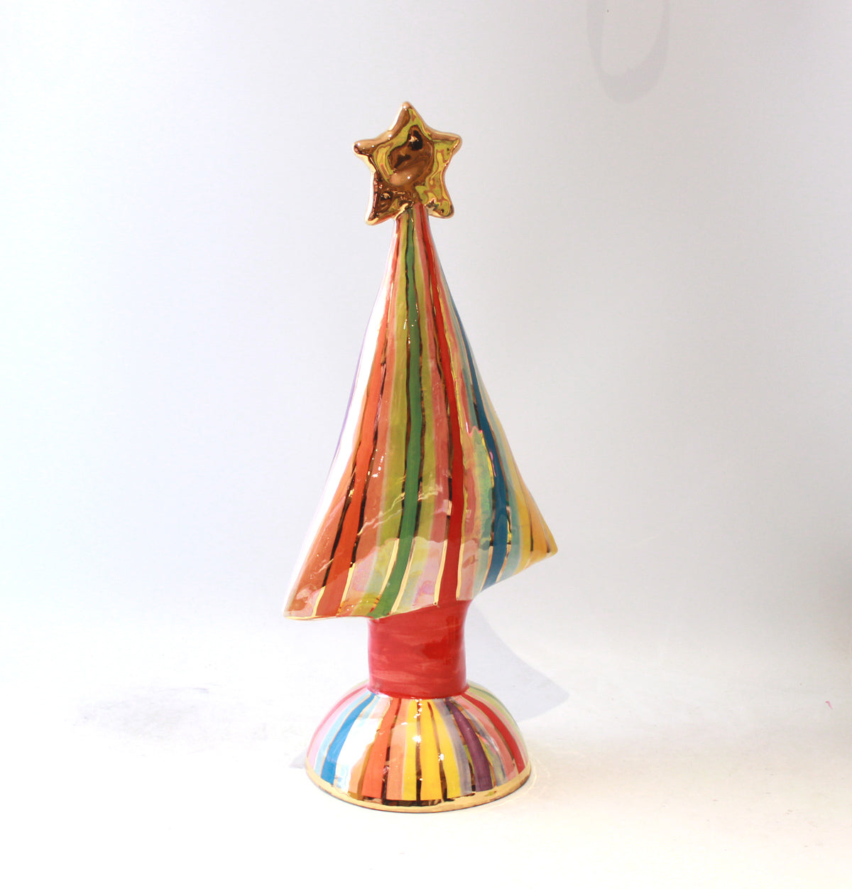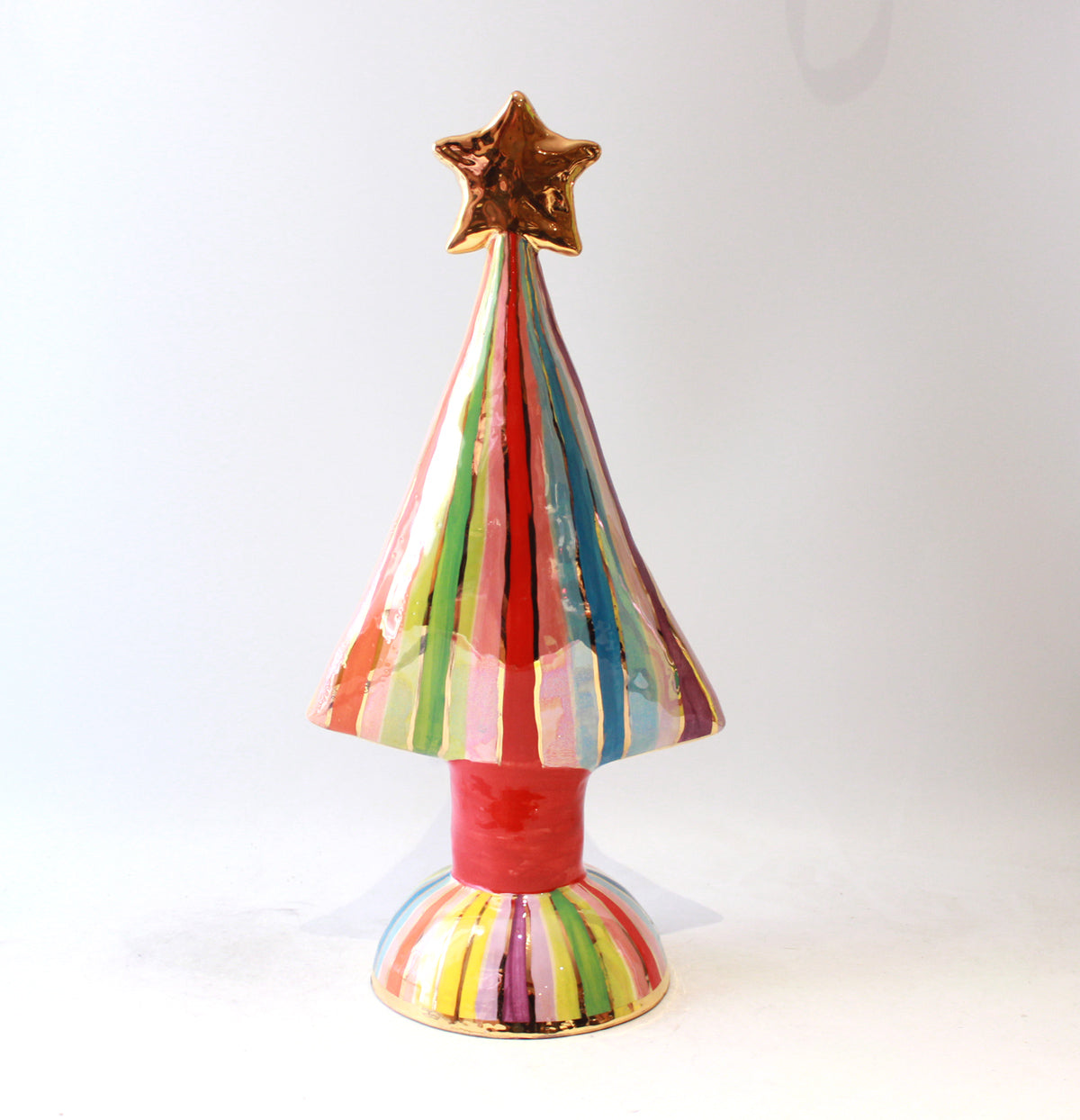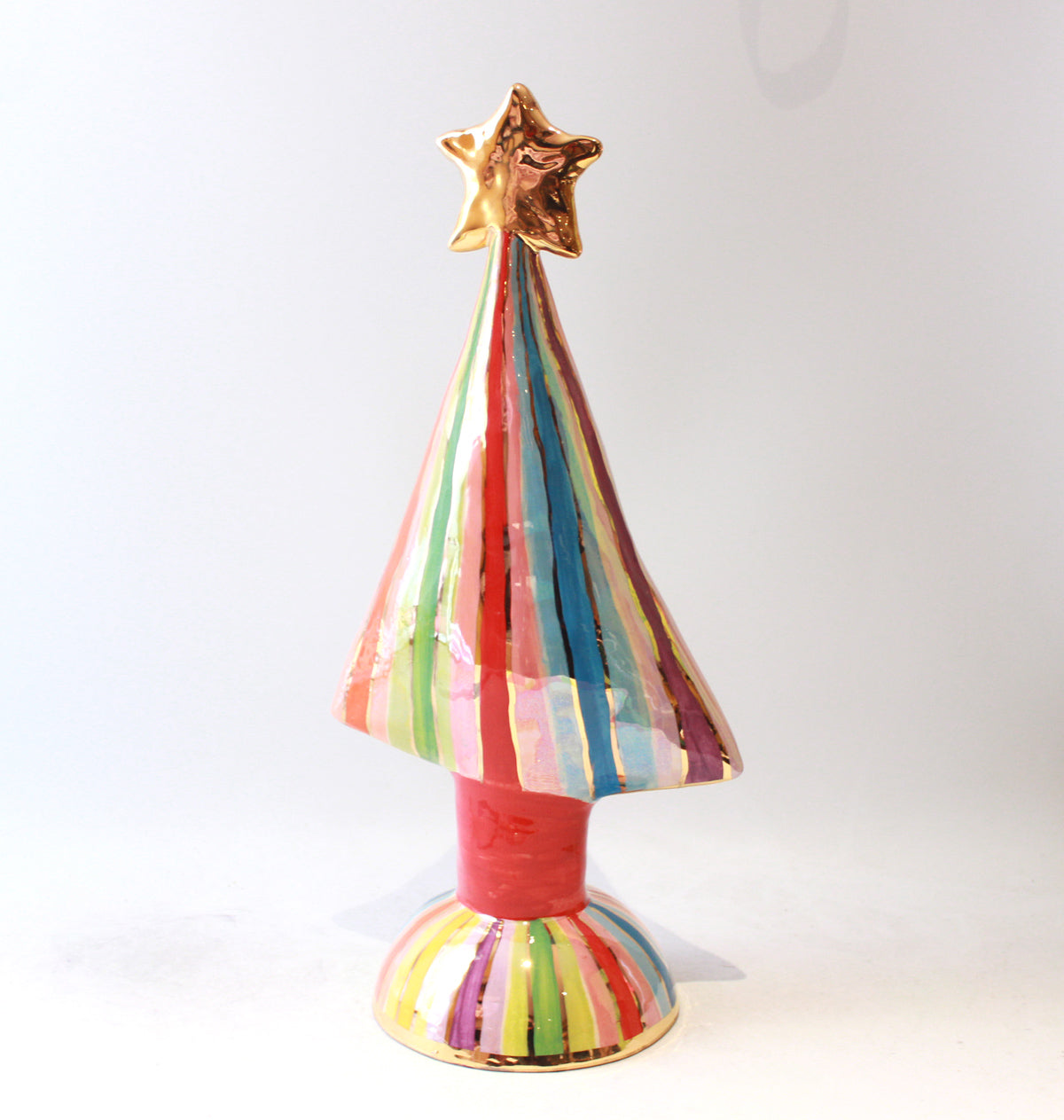 What better way to bring in the festivities than a Mary Rose Young Christmas Tree...? This one, being one of the largest made by Mary Rose, stands around 20 inches in height and is painted in the very dramatic "Lustred Stripe" design, where colourful stripes are broken up by accents of 24 carat gold...the base is painted to match, and a shining 24 carat gold star is placed at its peak just for good measure!