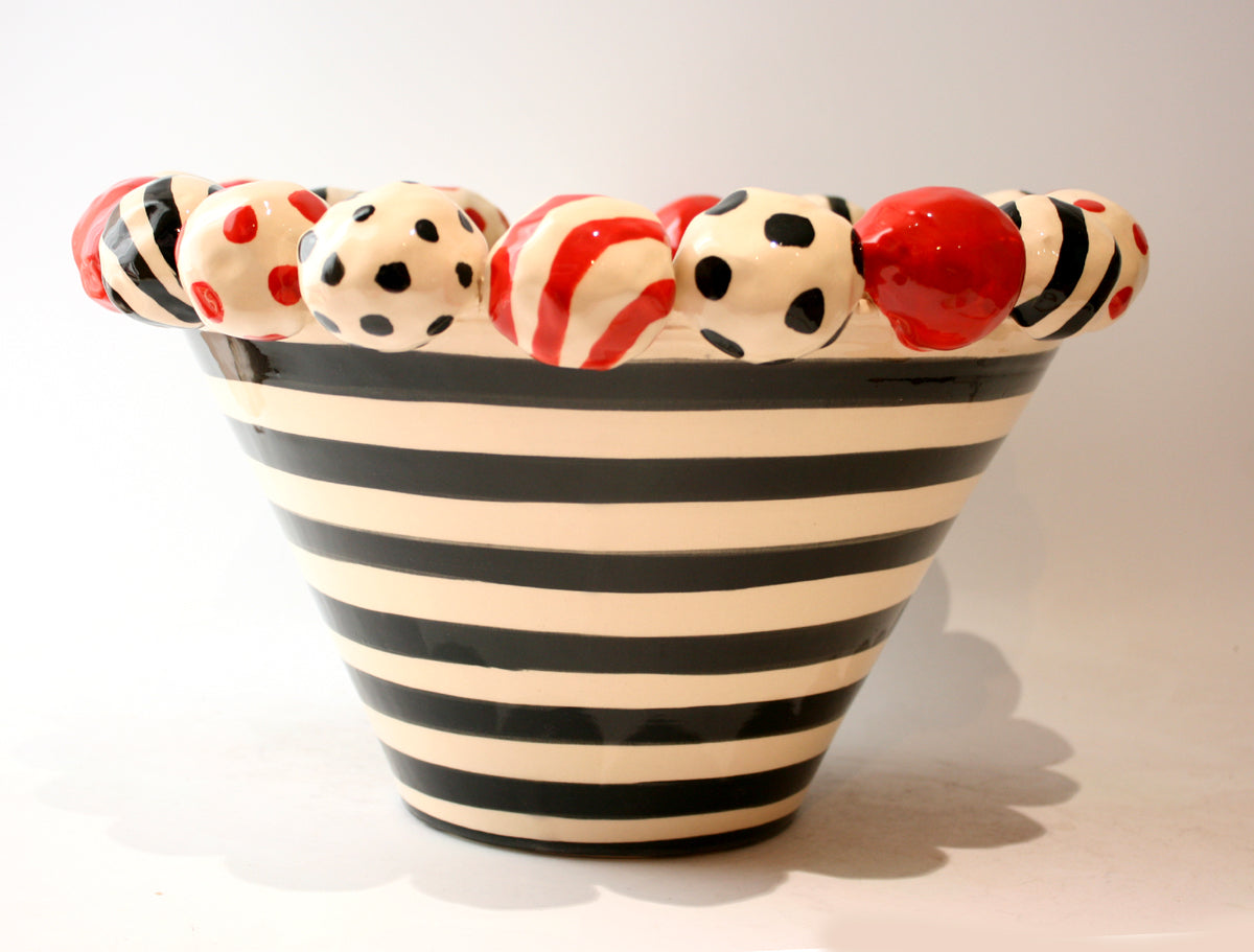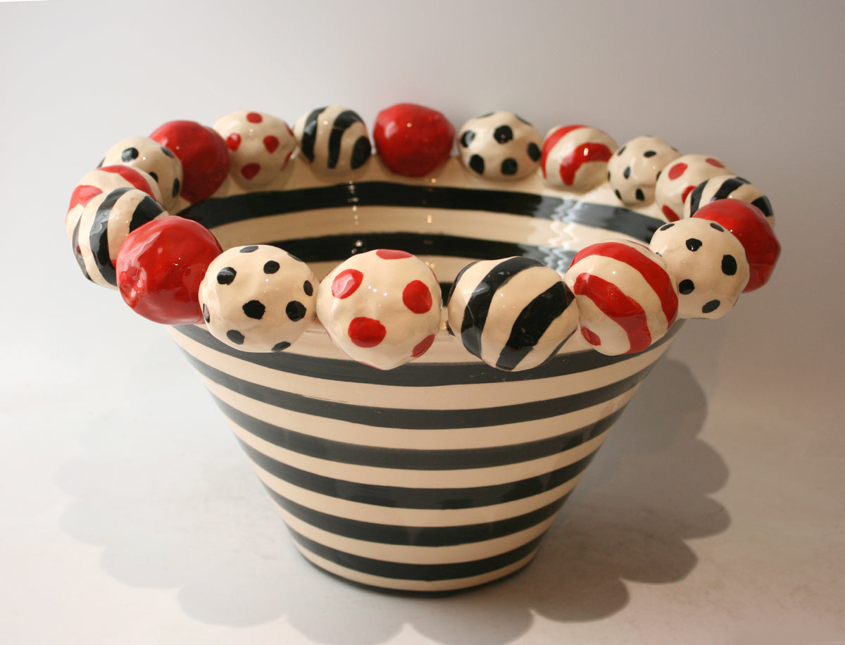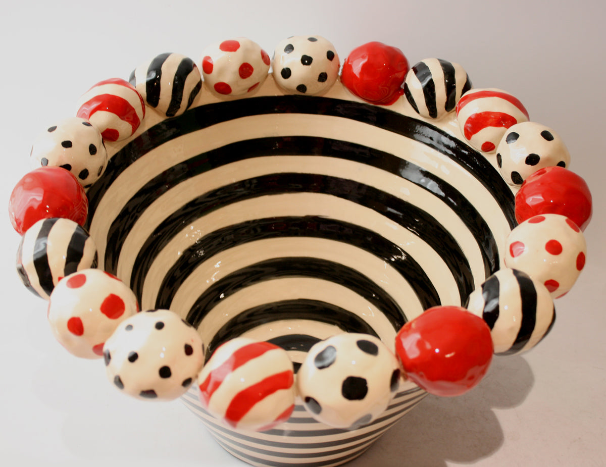 This striking Mary Rose Young creation measures around 15 inches in diameter and will certainly steal the show wherever it is placed! It is painted in monochrome stripes and features a row of ceramic beads of red and black atop its rim...