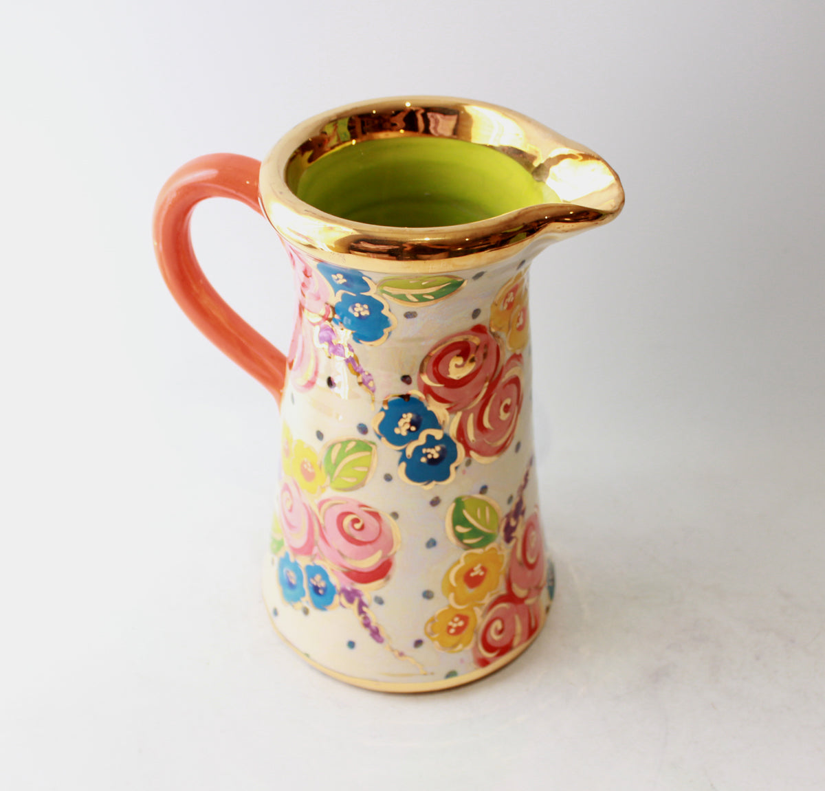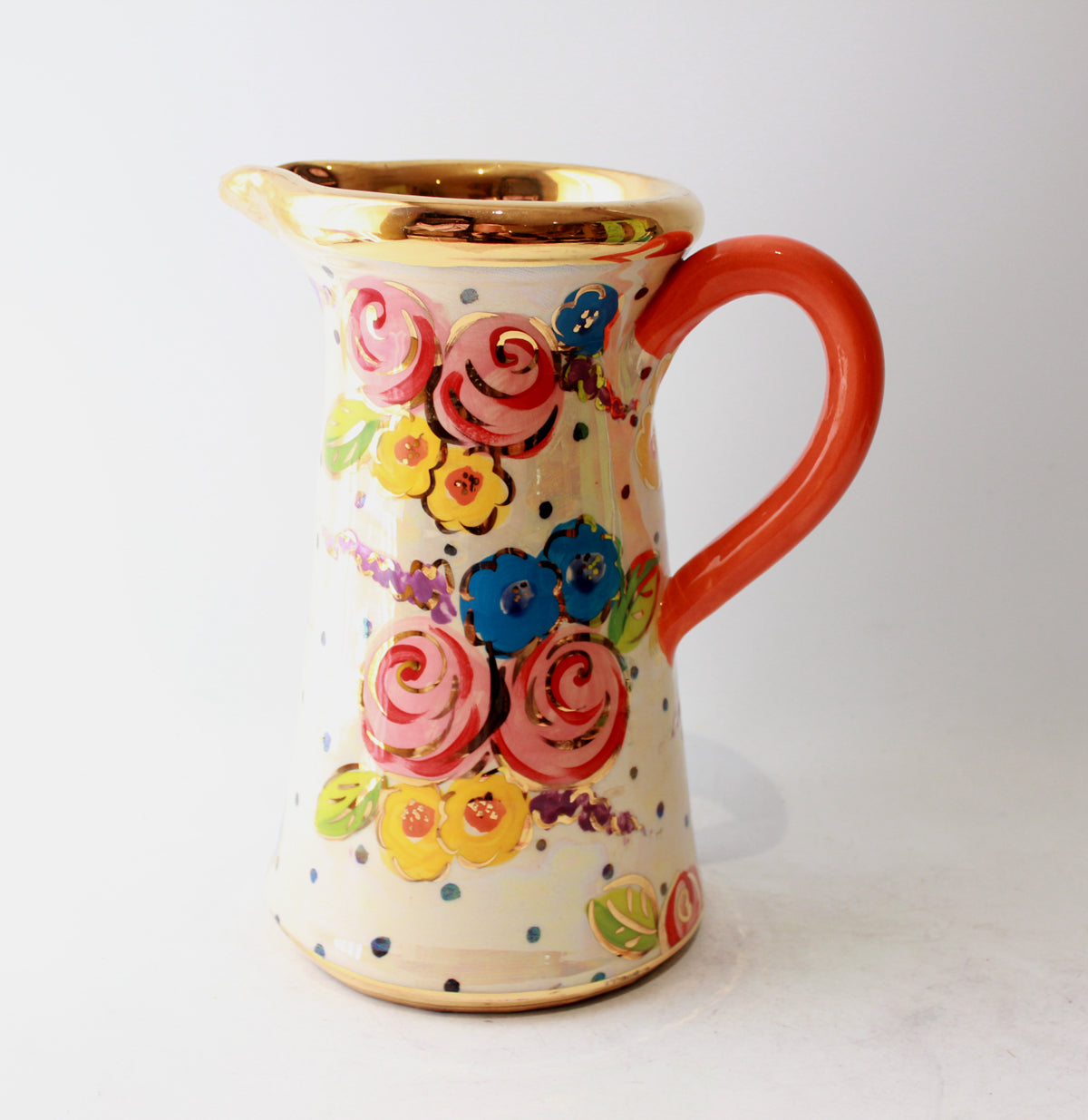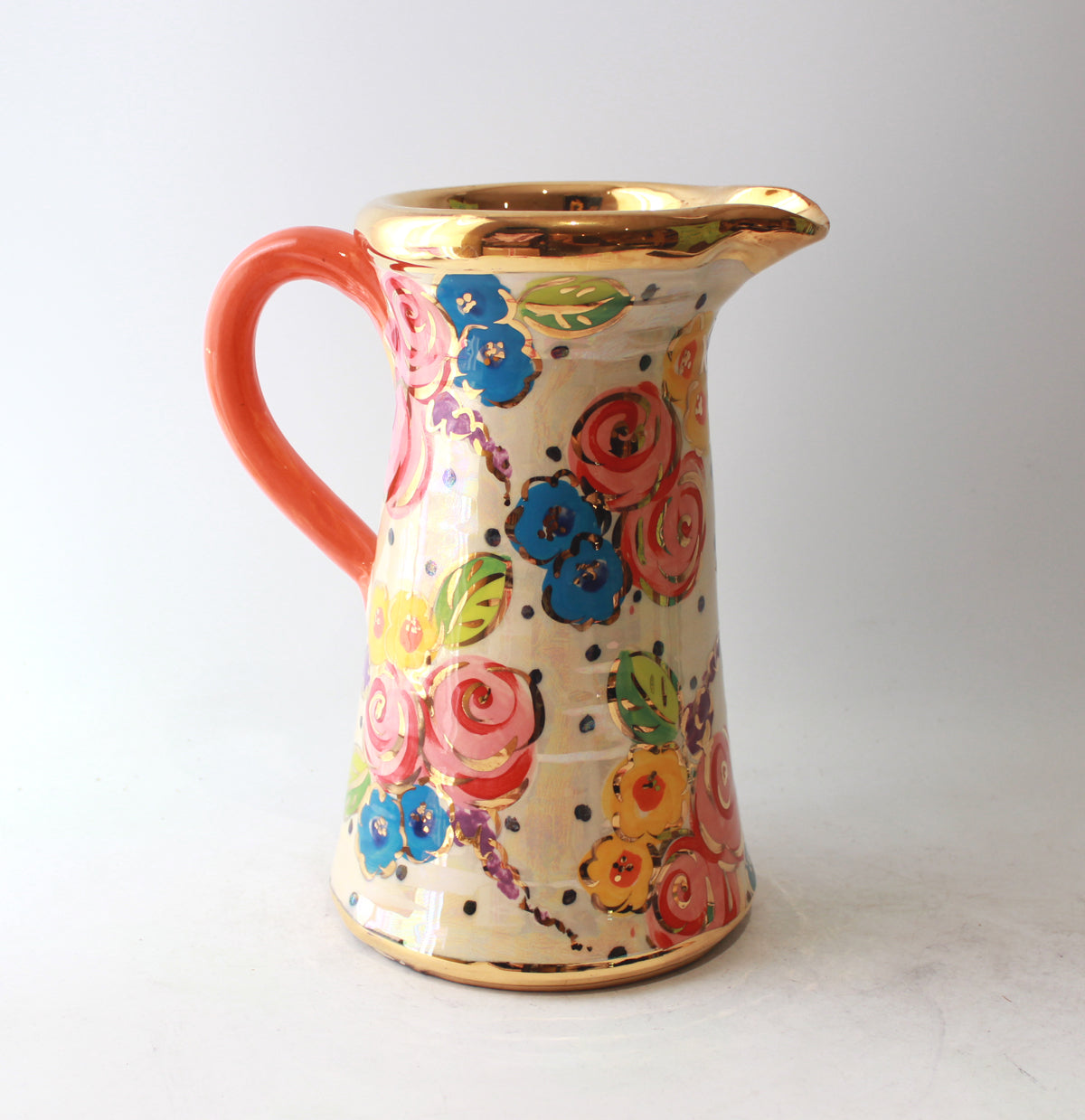 A Large Conical Jug made by Mary Rose stands around 10 inches tall and will gladly contain whatever liquid you decide to fill it with! This one is decorated in "Vintage Floral" design, with accents of 24 carat gold throughout...