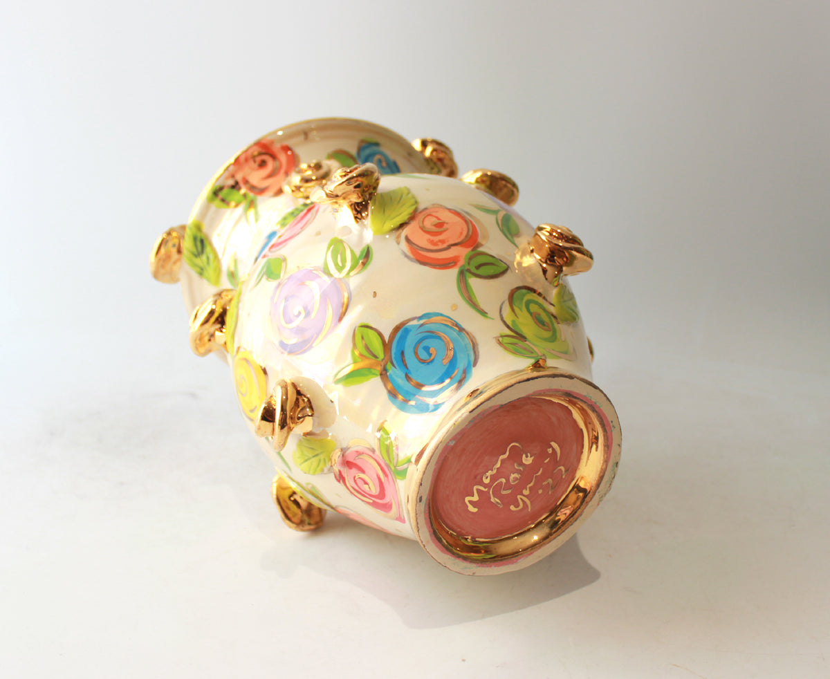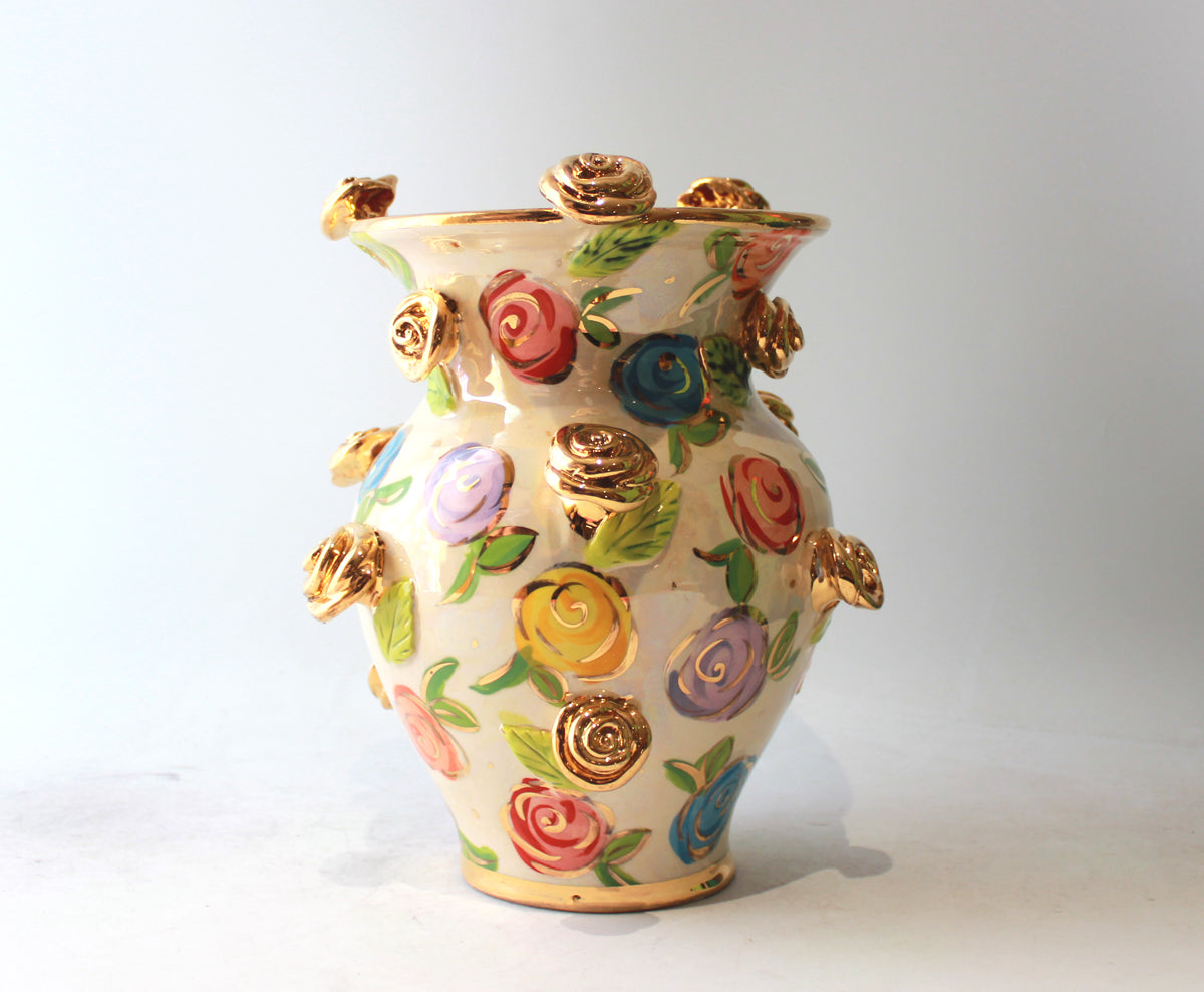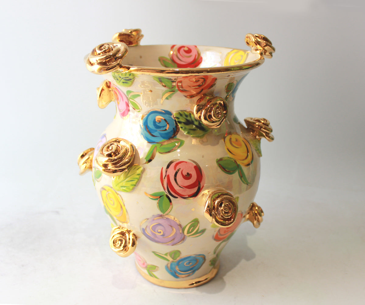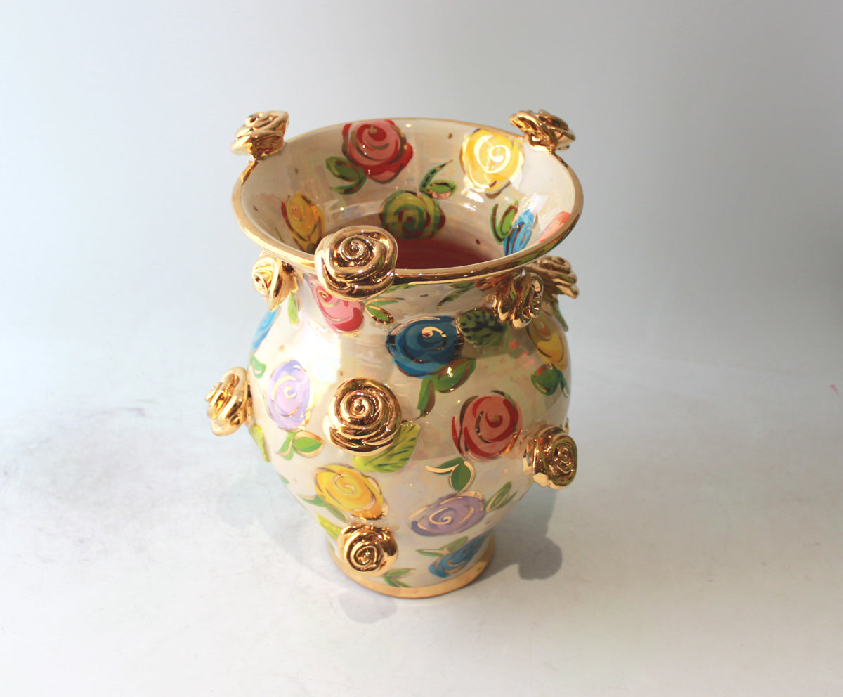 Mary Rose's Large Fat Vases stand around 12 inches tall and make the most magnificent display pieces! This one is painted in "Rosebud", where colourful roses sit upon an iridescent Mother of Pearl background flecked with accents of 24 carat gold...it also features many ceramic gold roses which have been "stuck" all over its surface and give the most magical effect...