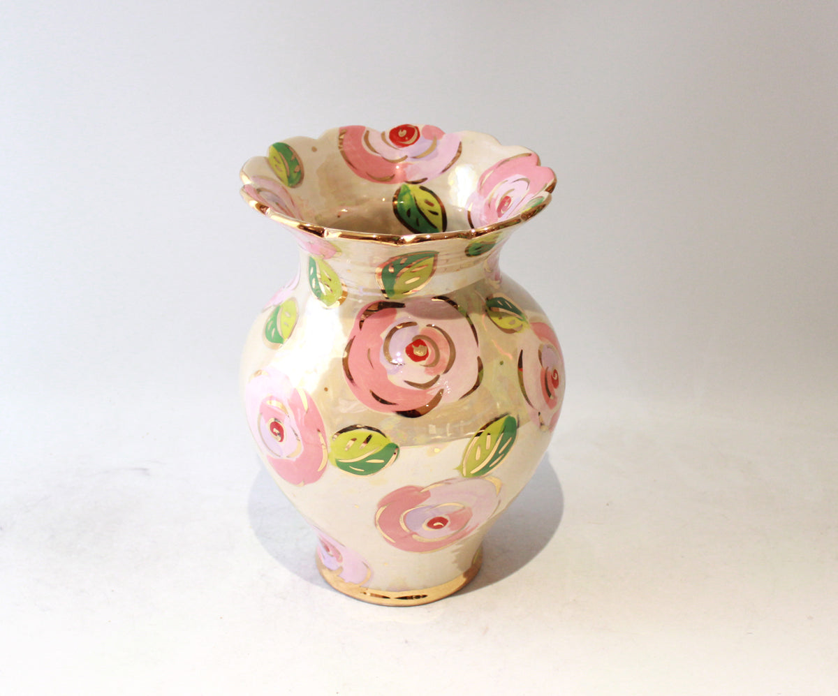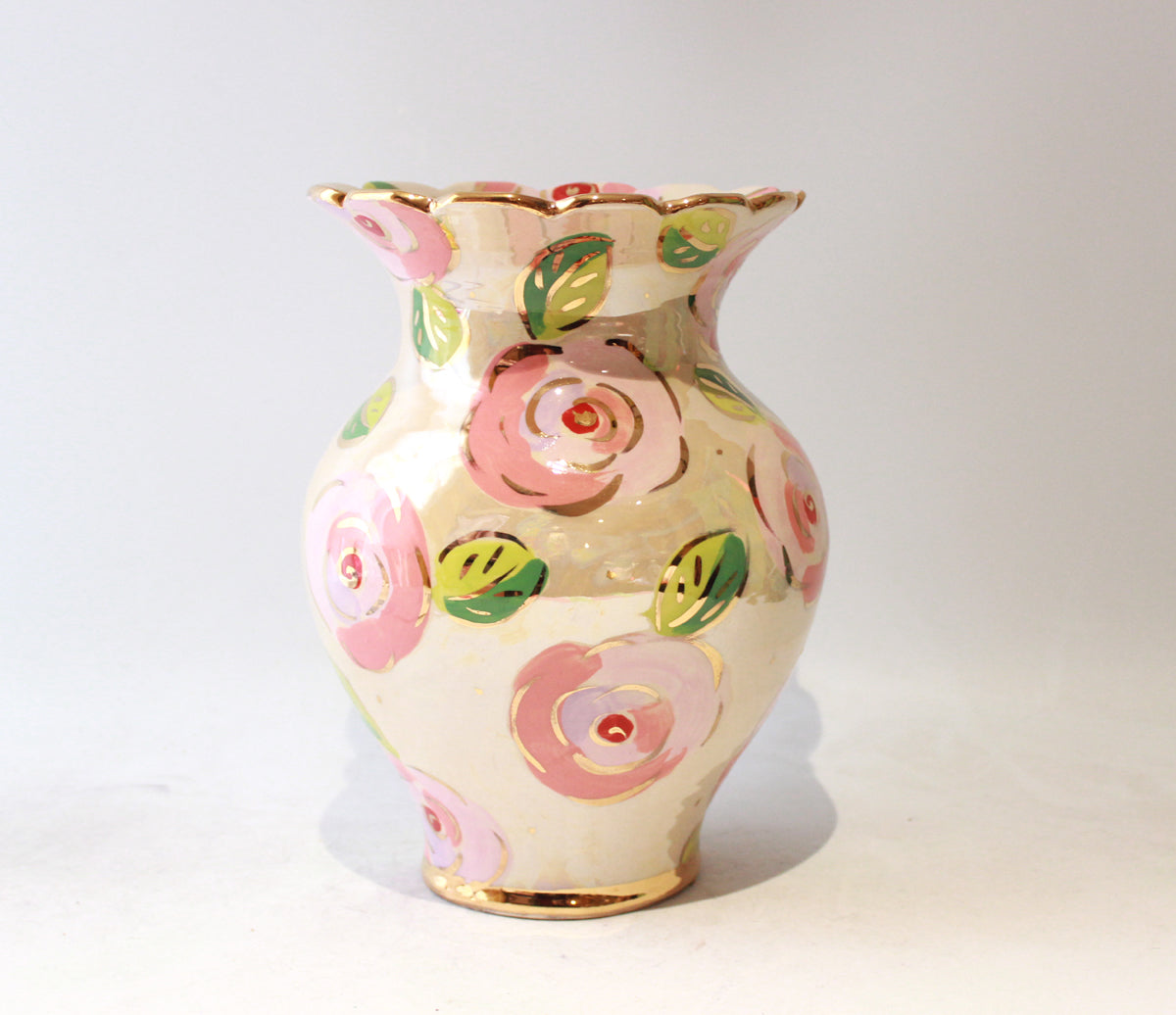 A Large Fat Vase made by Mary Rose stands around 12 inches in height and will make the most wonderful display piece...this one is painted in "Gold New Rose Pink" on an iridescent Mother of Pearl background with accents of 24 carat gold throughout and adorning its "Fluted" rim!