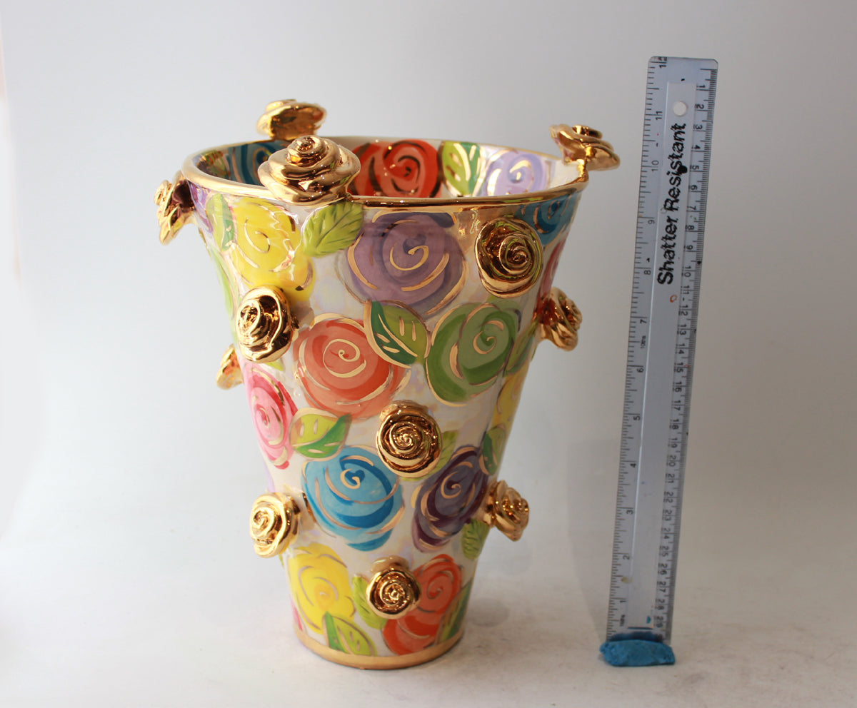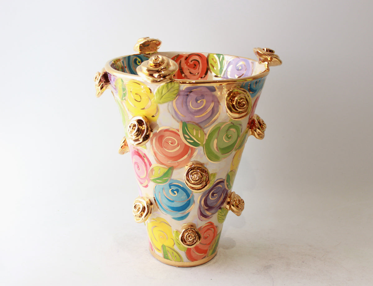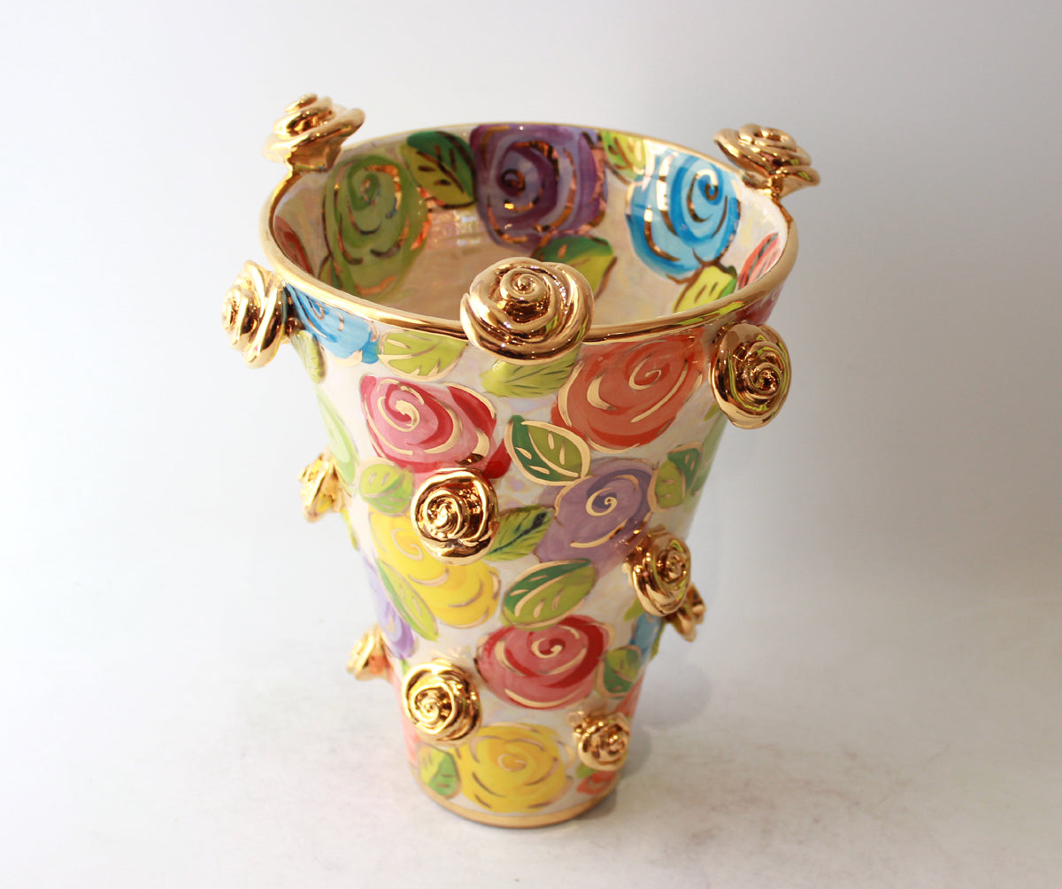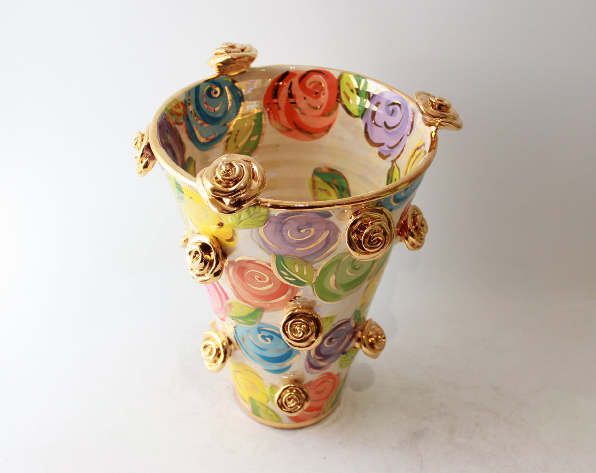 This rather eye-catching Flared Vase stands around 11 inches tall and has been "studded" with gold ceramic roses...it showcases one of Mary Rose's newest designs, Pastel Block Rose, which features brightly coloured roses flecked with gold on a background of iridescence