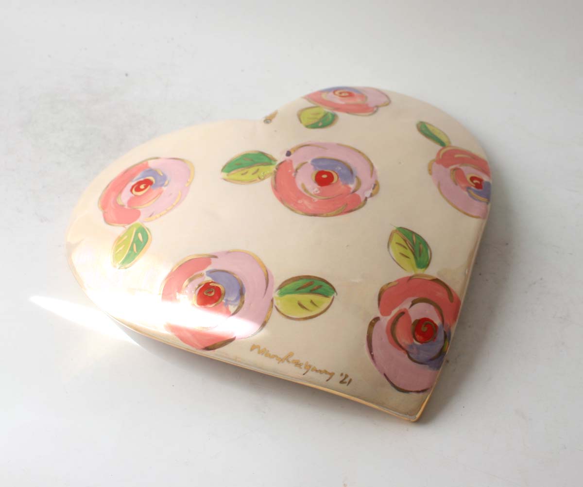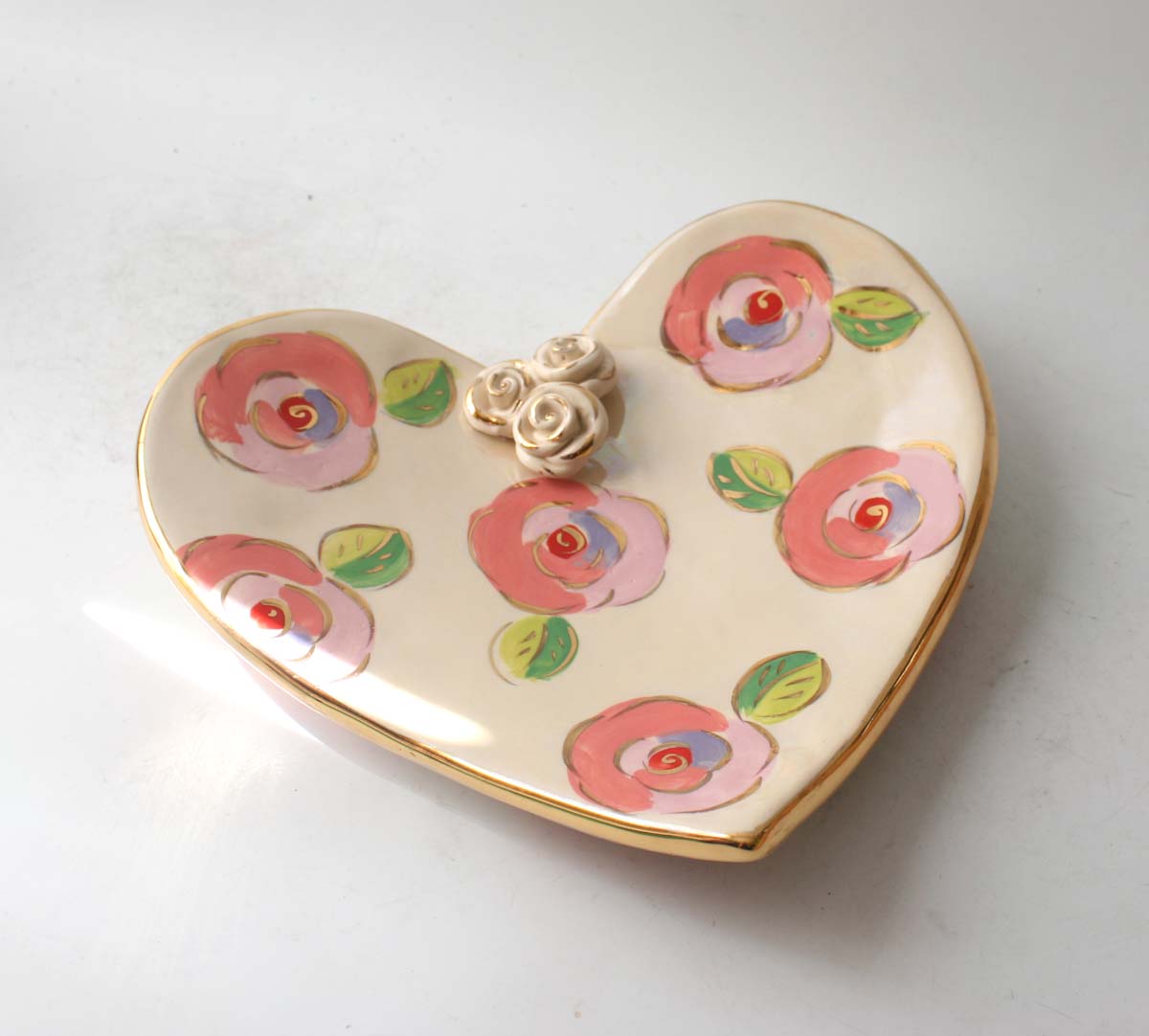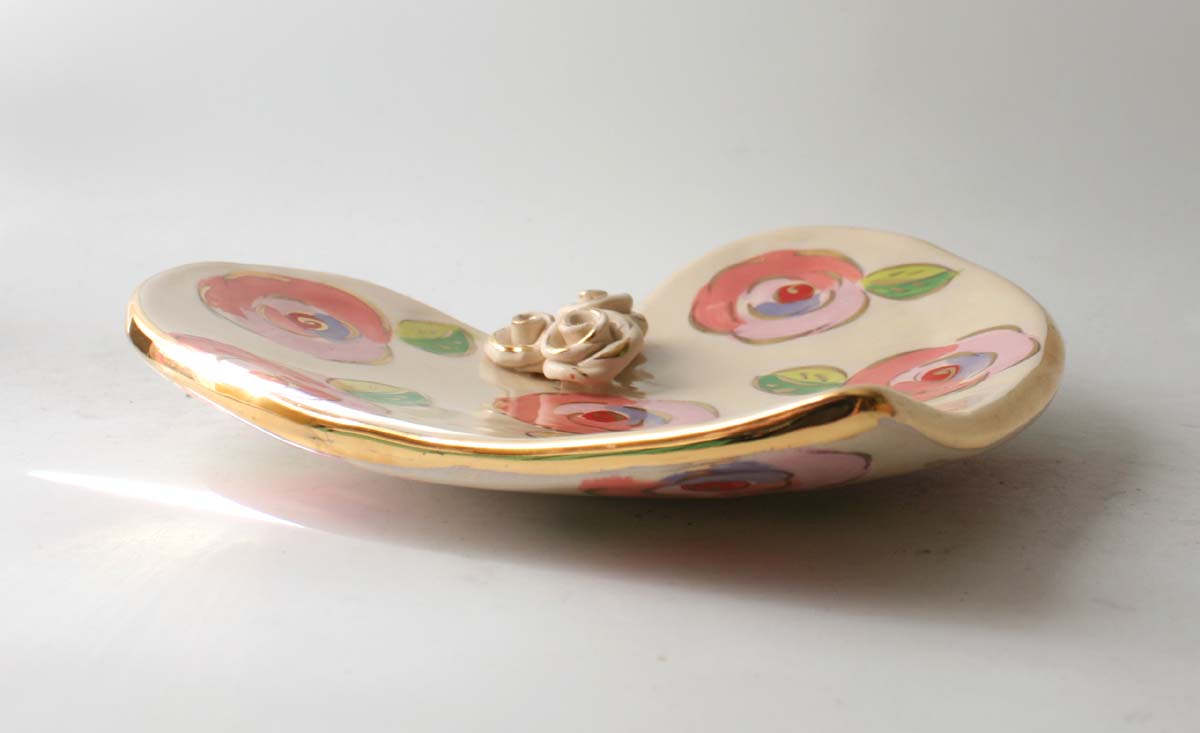 Mary Rose's Heart Shaped Soap Dishes have sized up, as this one measures around 8 inches in diameter! It is painted in "Gold New Rose" with a beautifully iridescent white background and accents of 24 carat gold on the piece, around its edge and adorning the three ceramic roses in its centre...