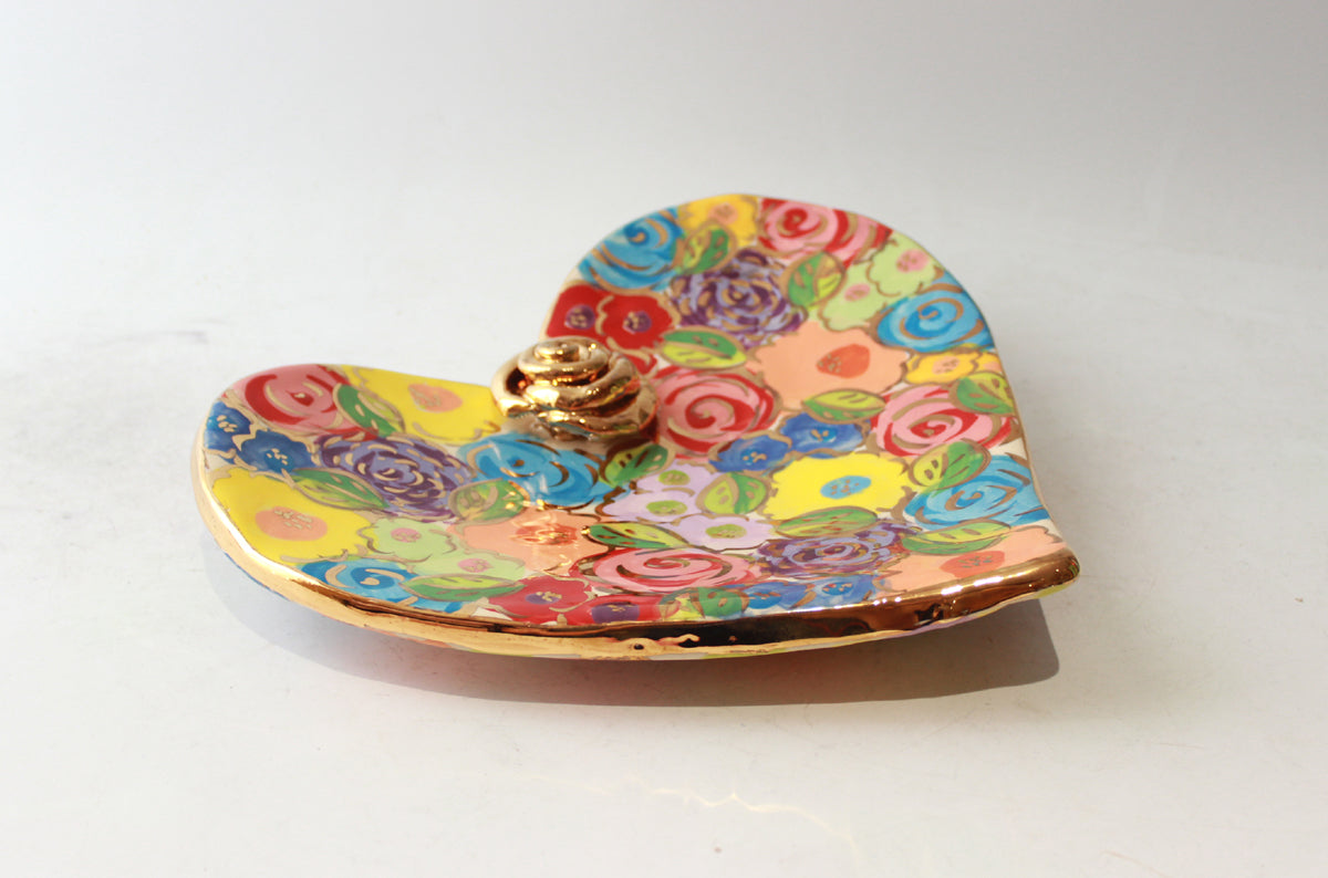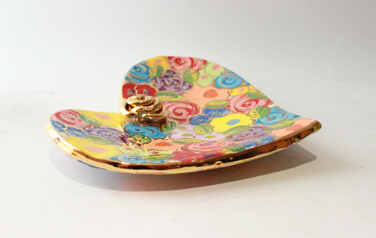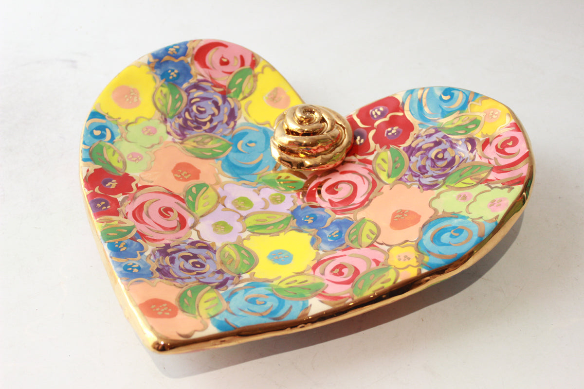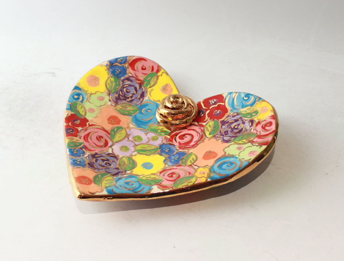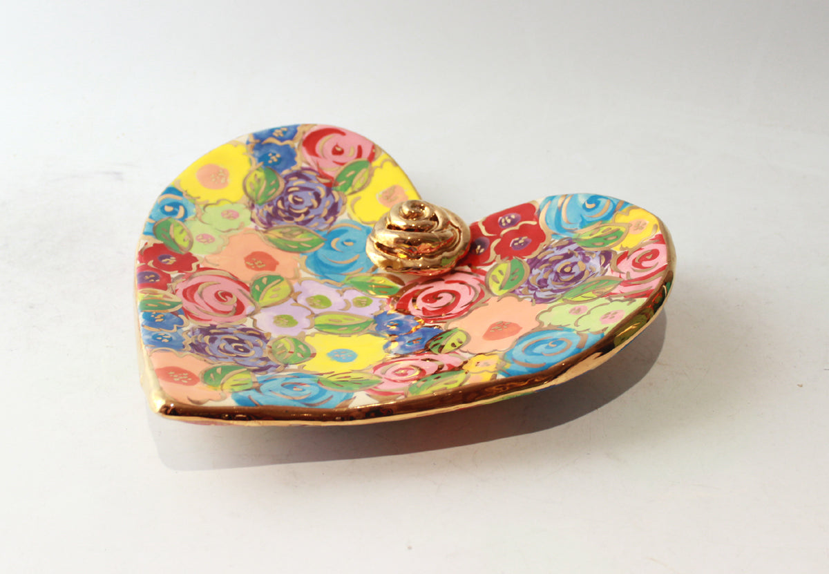Mary Rose's Heart Shaped Soap Dishes have sized up, with the Large versions measuring nearly 8 inches in diameter! This is a beautiful example of one of these supersized creations...painted in "Pastel Blooms", it features a little ceramic rose in its centre, is flecked with accents of 24 carat gold, and wobbles on its hand-curved base in the most delightful way!
