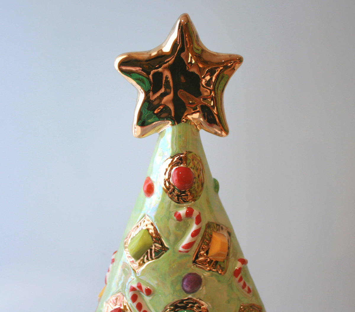 What better way to bring in the festivities than a Mary Rose Young Christmas Tree...? This one is around 20 inches tall and painted in light green with colourful candy canes, jewels and dots! It has then been given a beautiful iridescence, and of course has a big gold star on top...because why not?