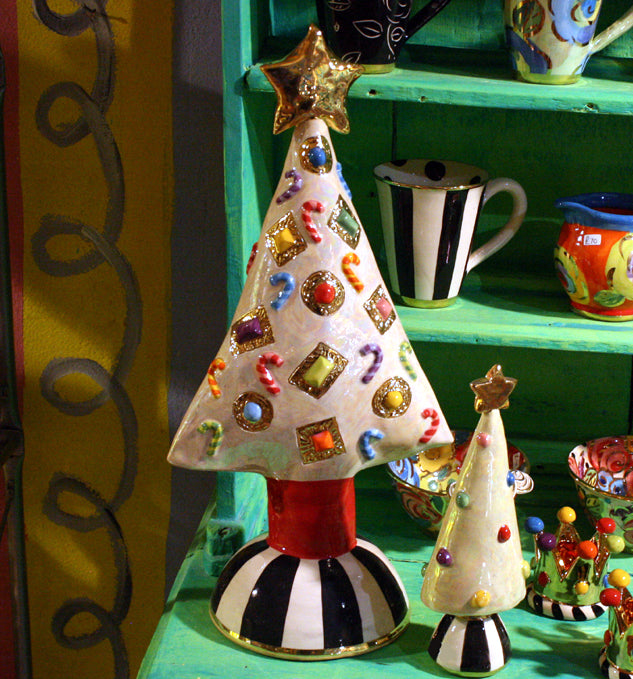 What better way to bring the festivities into your home than this Large Ceramic Christmas Tree...? It stands around 20 inches tall and is painted in a beautiful Shimmering White with Jewels and Candy Canes across its surface. The Star of Wonder sits on top beckoning all kinds of "Shepherds" and "Wise Men"!