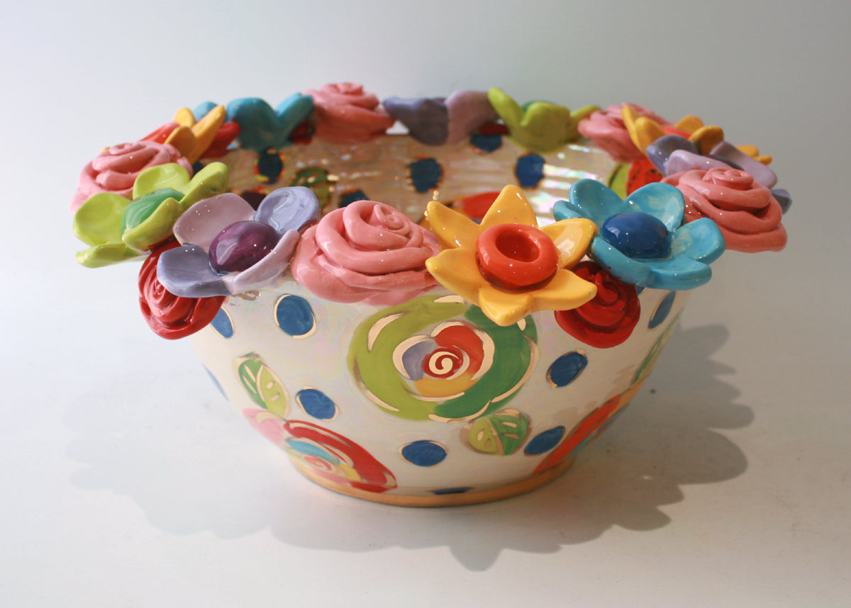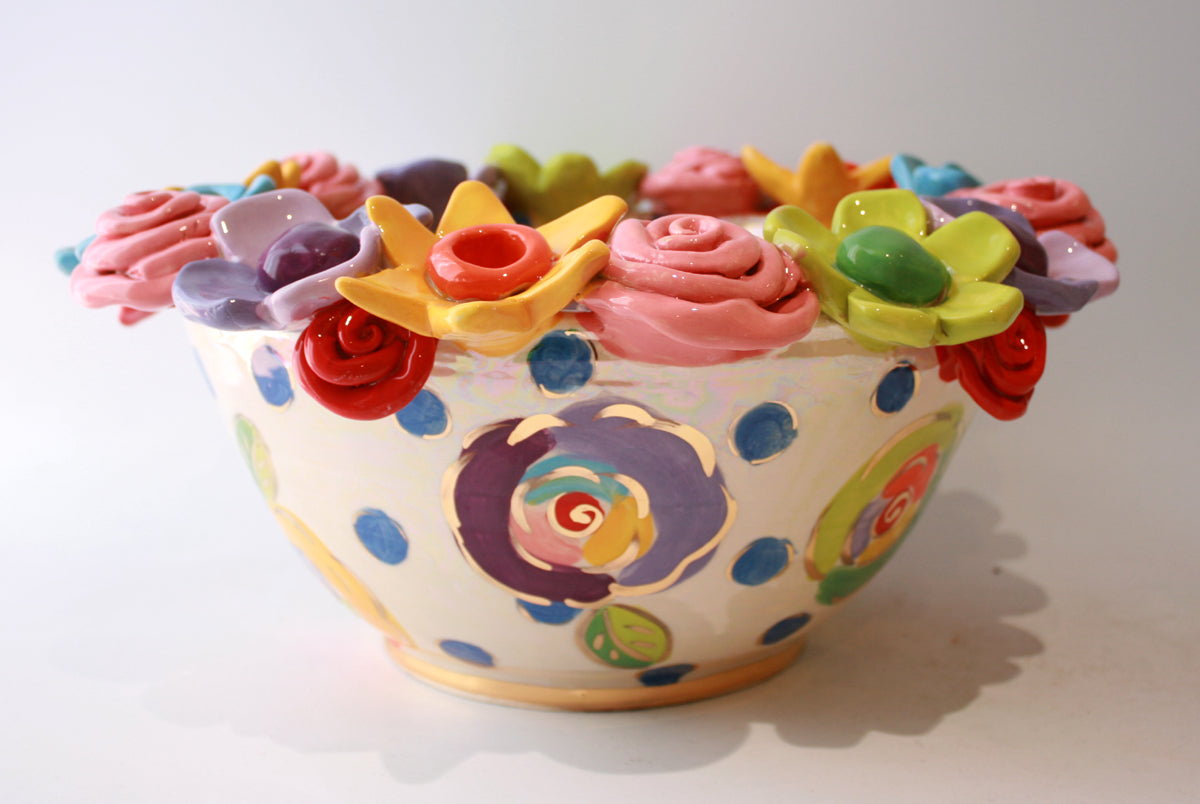 This Large Multiflower Encrusted Bowl measures 16 inches across, features colourful Roses on a background of Blue Polka Dots, and is full of the whimsical joy that makes Mary Rose's pieces so enchanting...