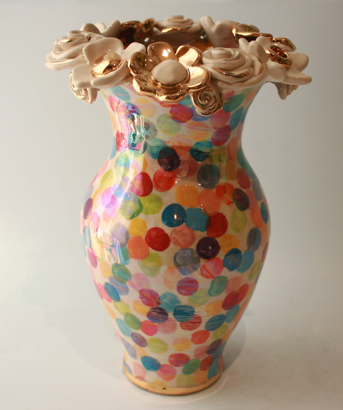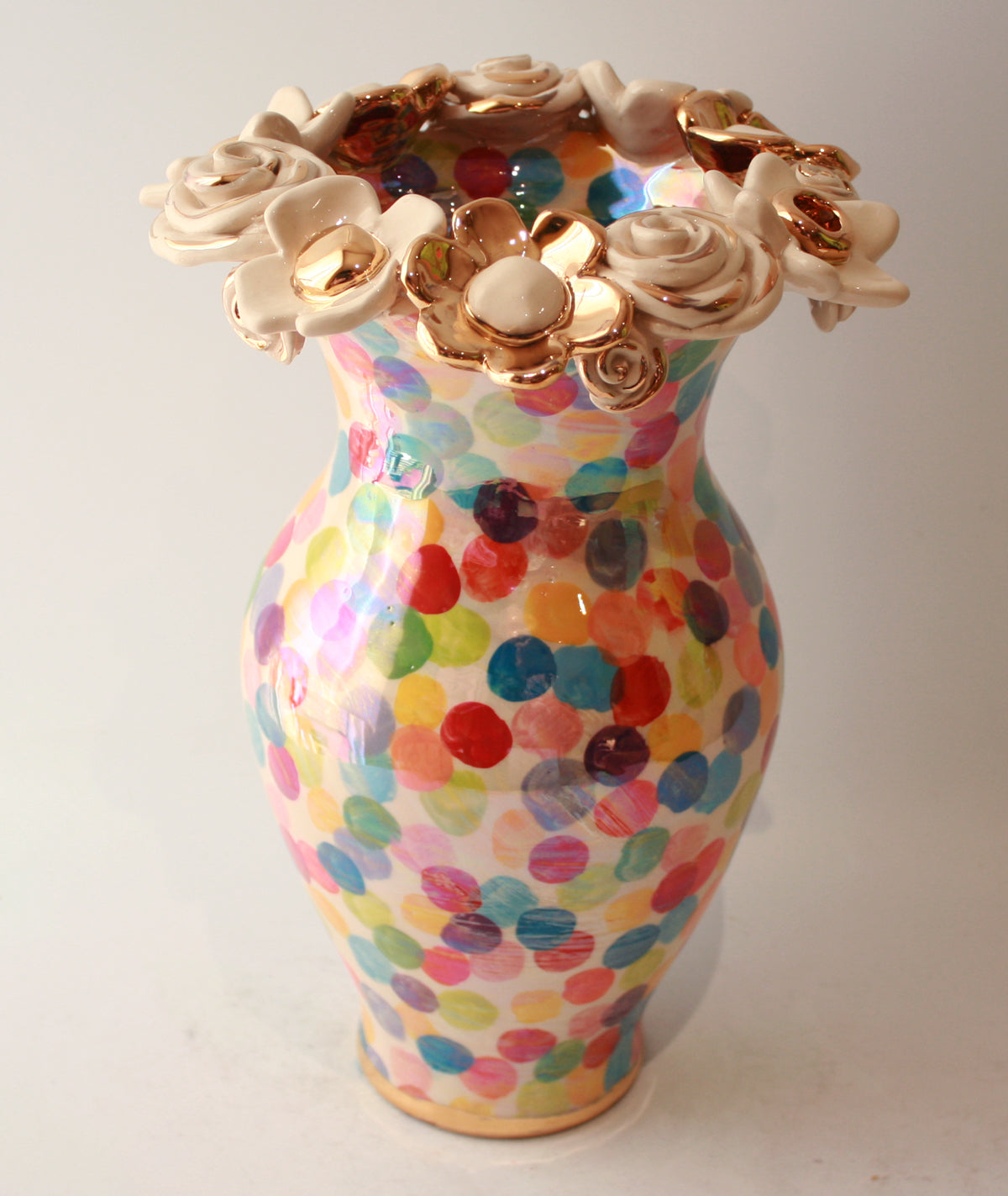 This is a Vase that stands around 12 inches tall, and has Gold and White flowers encrusting its rim that contrast beautifully with the very colourful "Buble" design...a classic Mary Rose Young piece that will steal the attentions of all!