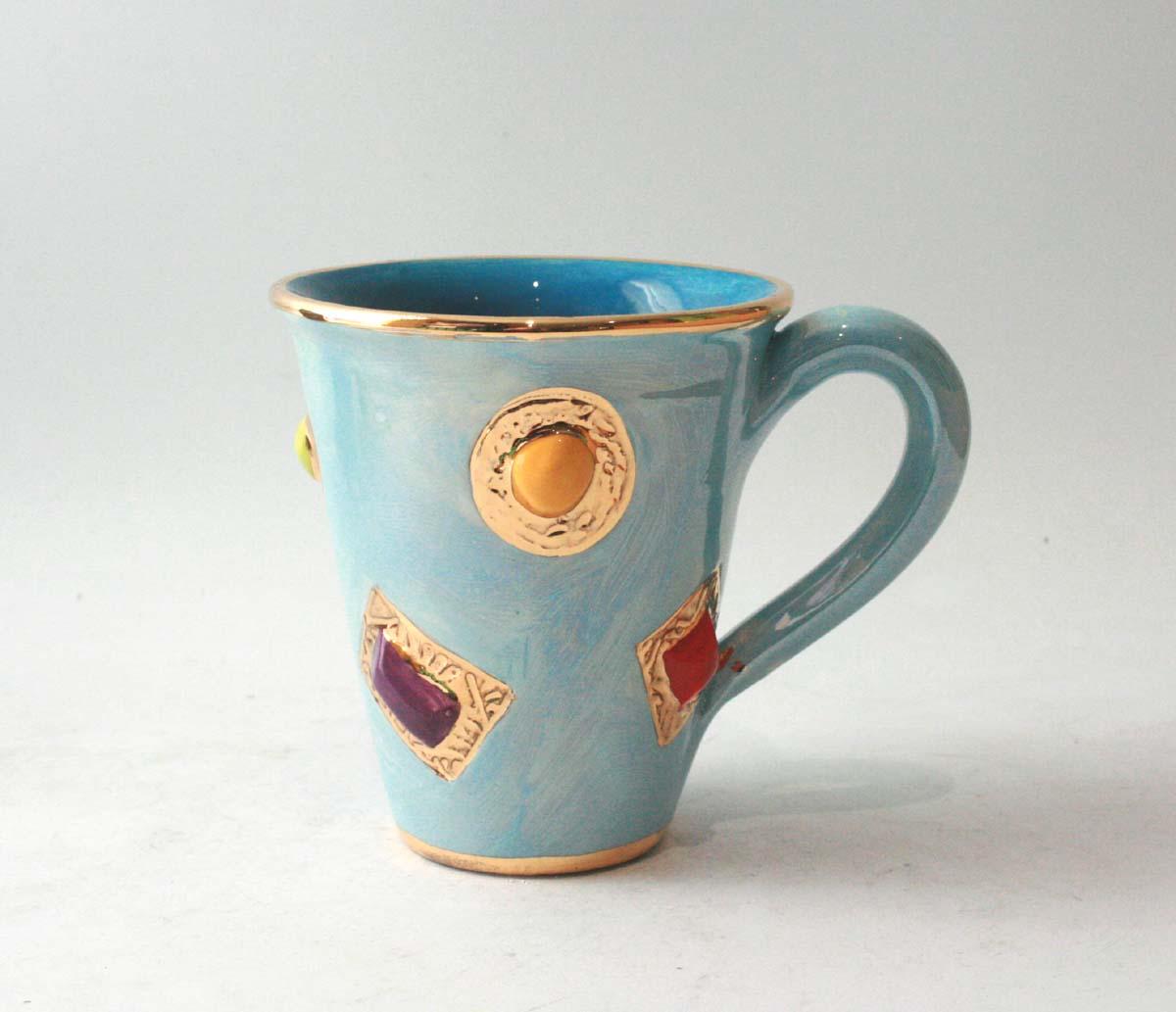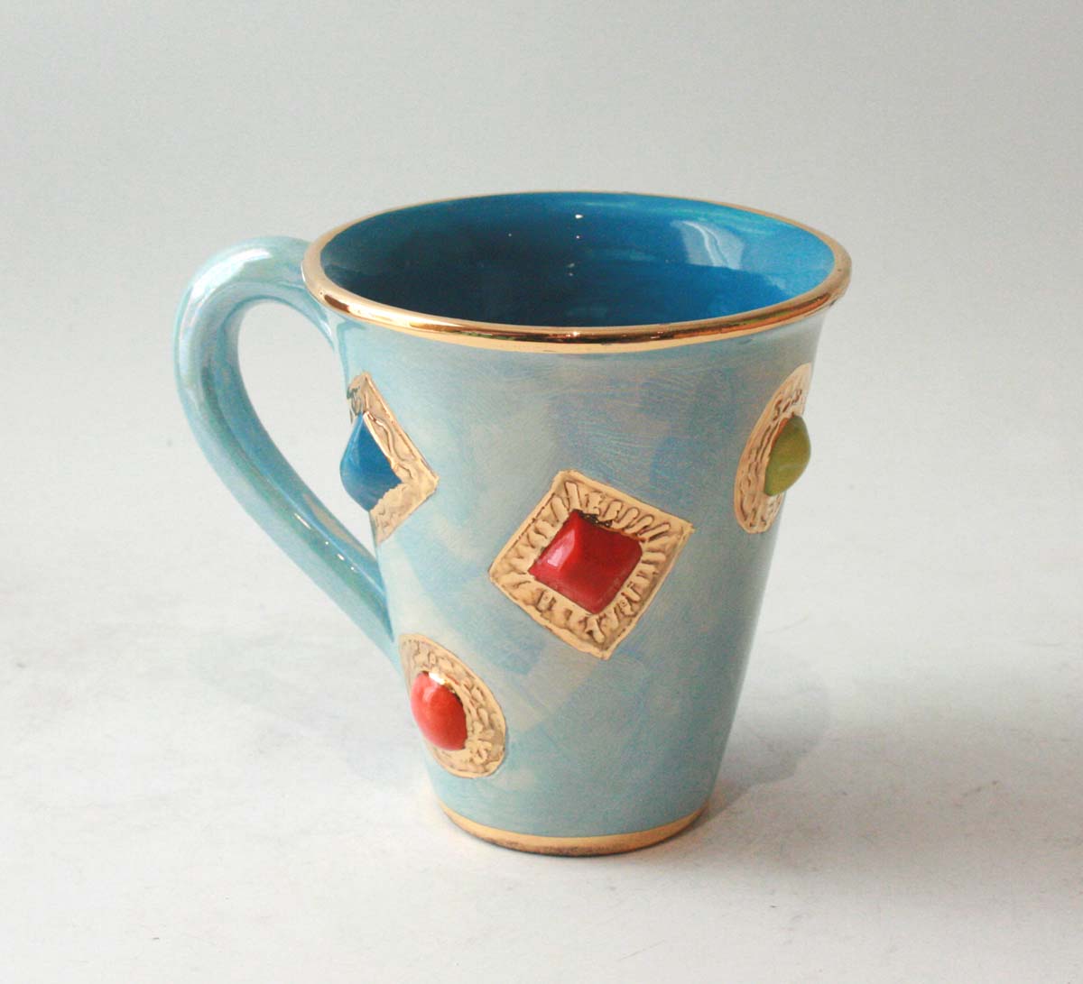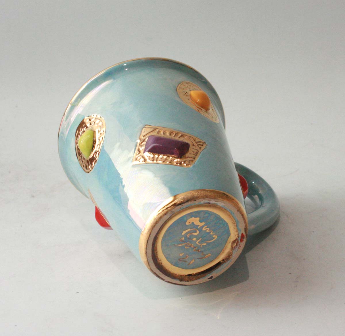 A classic Mary Rose Young Mug which has been painted in dark blue on the inside to match the iridescent light blue on the outside...adorned with Ceramic Jewels, it stands 4 inches tall and is completed with accents of 24 carat gold! The price is for one only...