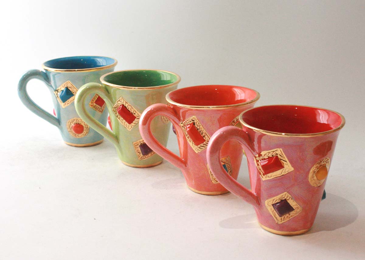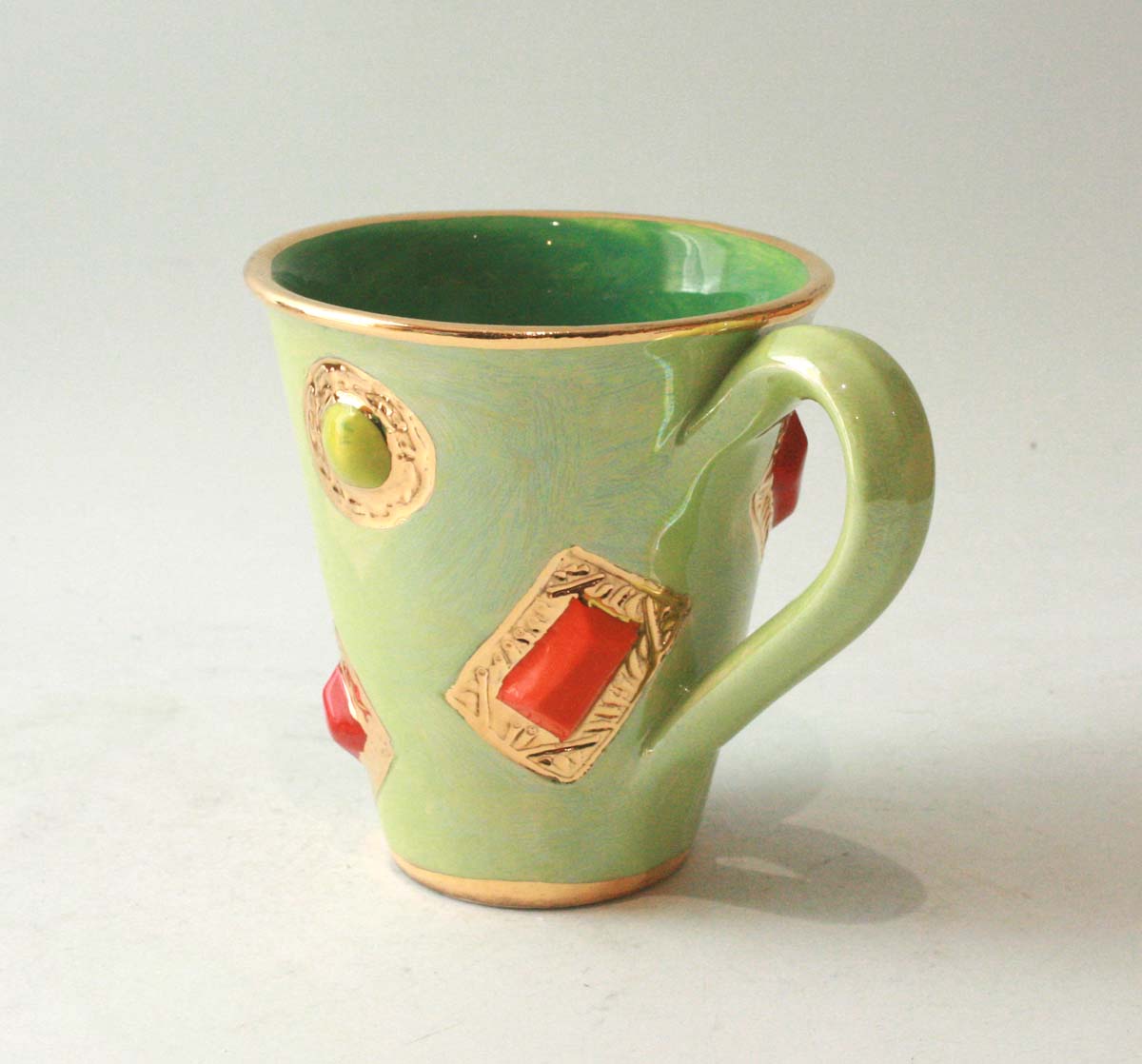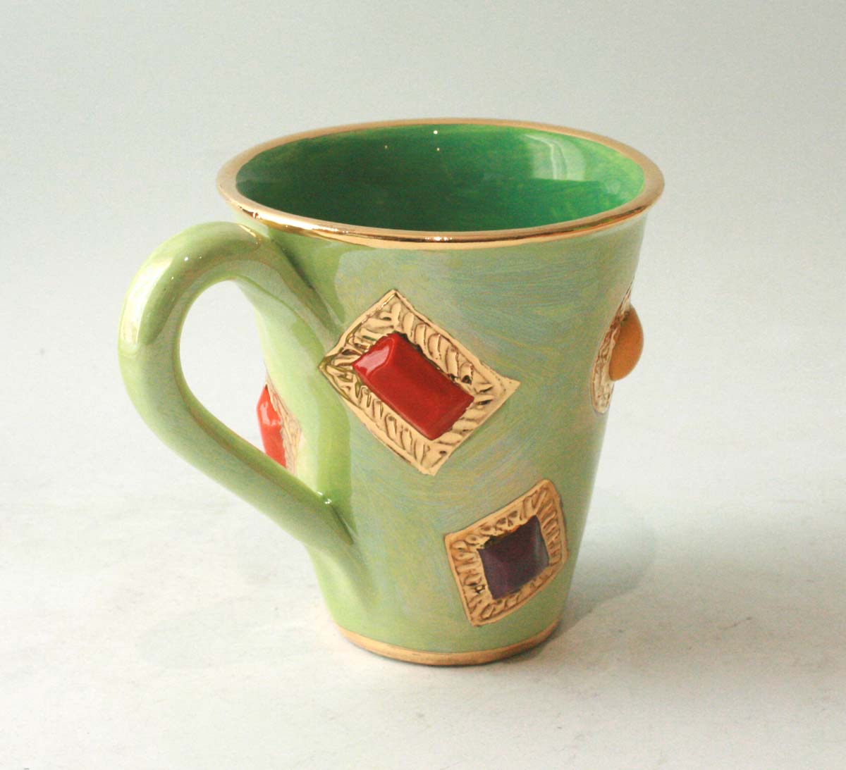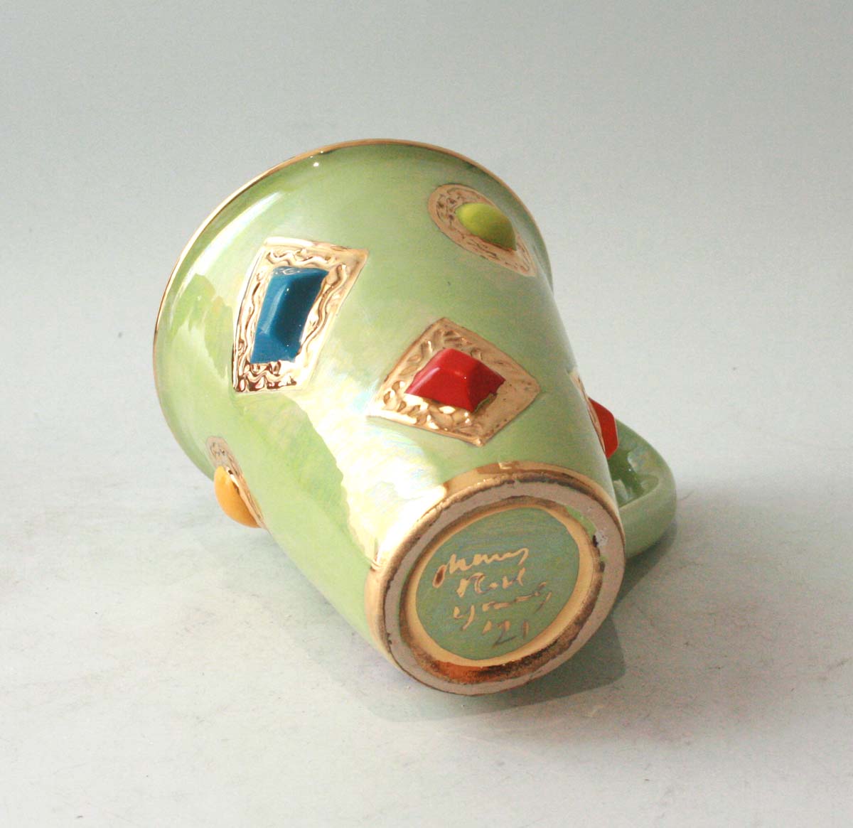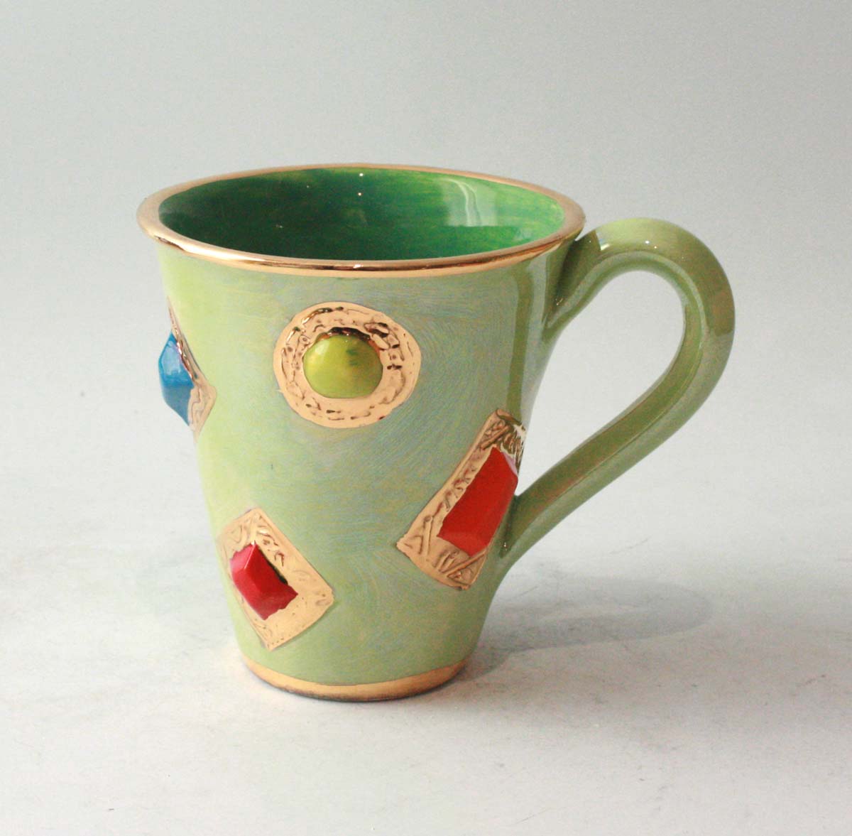 A classic Mary Rose Young Mug which has been painted in dark green inside to match iridescent light green outside...it is adorned with Ceramic Jewels of all different colours set by 24 carat gold and stands around 4 inches tall! The price is for one only...