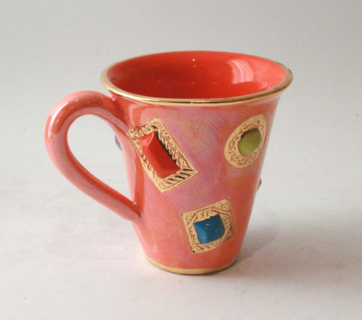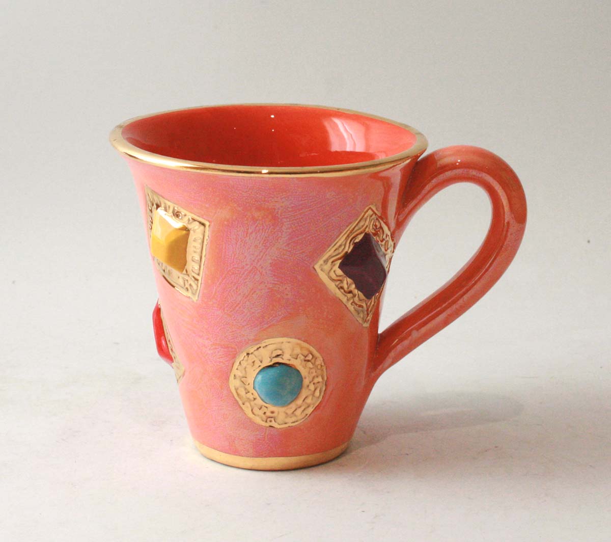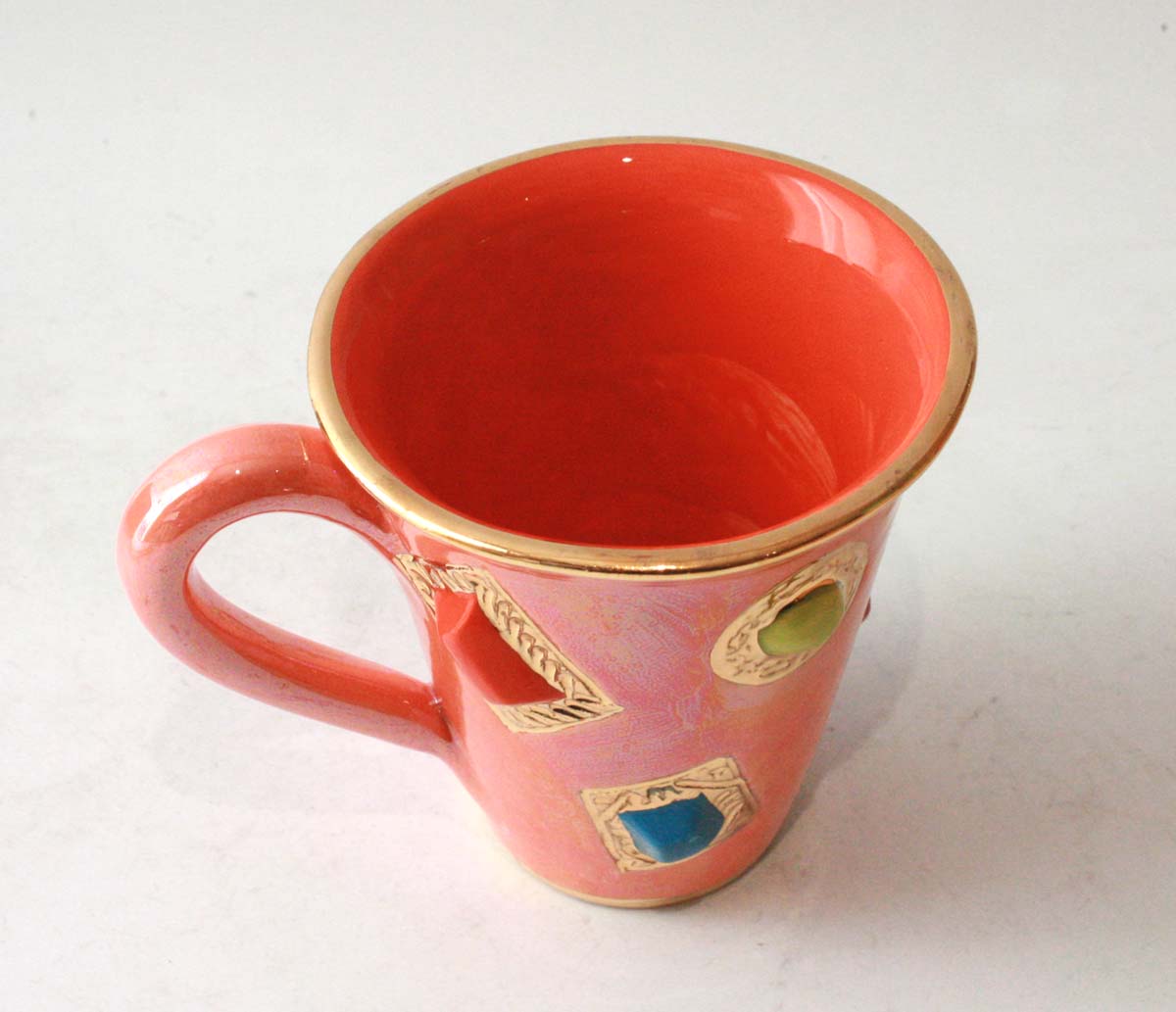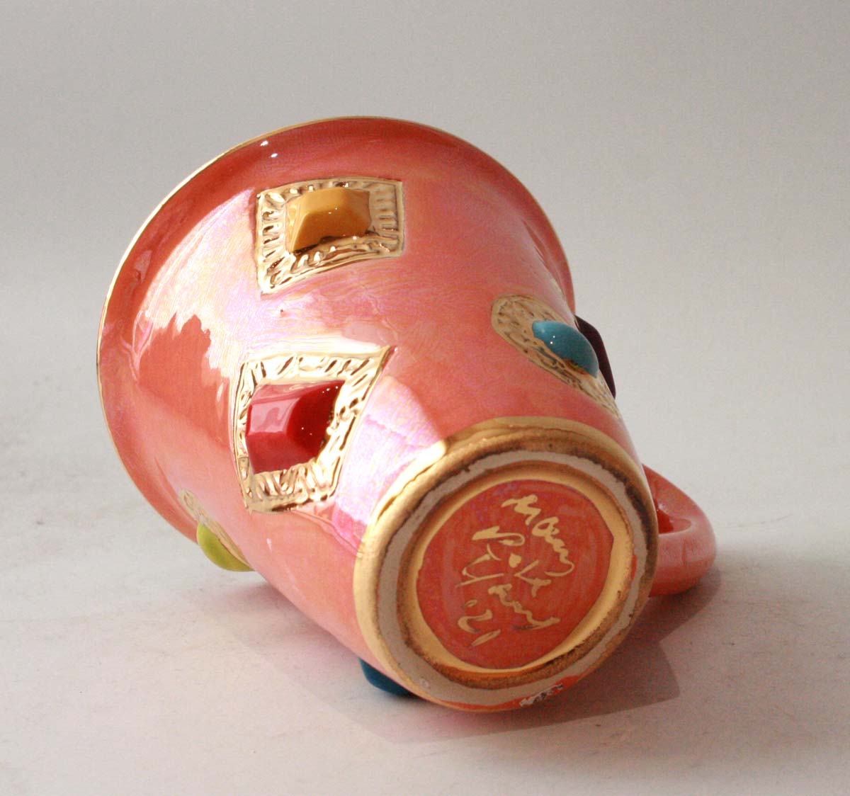 A classic Mary Rose Young Mug which has been painted in orange inside to match the iridescent lighter orange on the outside...adorned with ceramic jewels, it stands 4 inches tall and is completed with accents of 24 carat gold! The price is for one only...