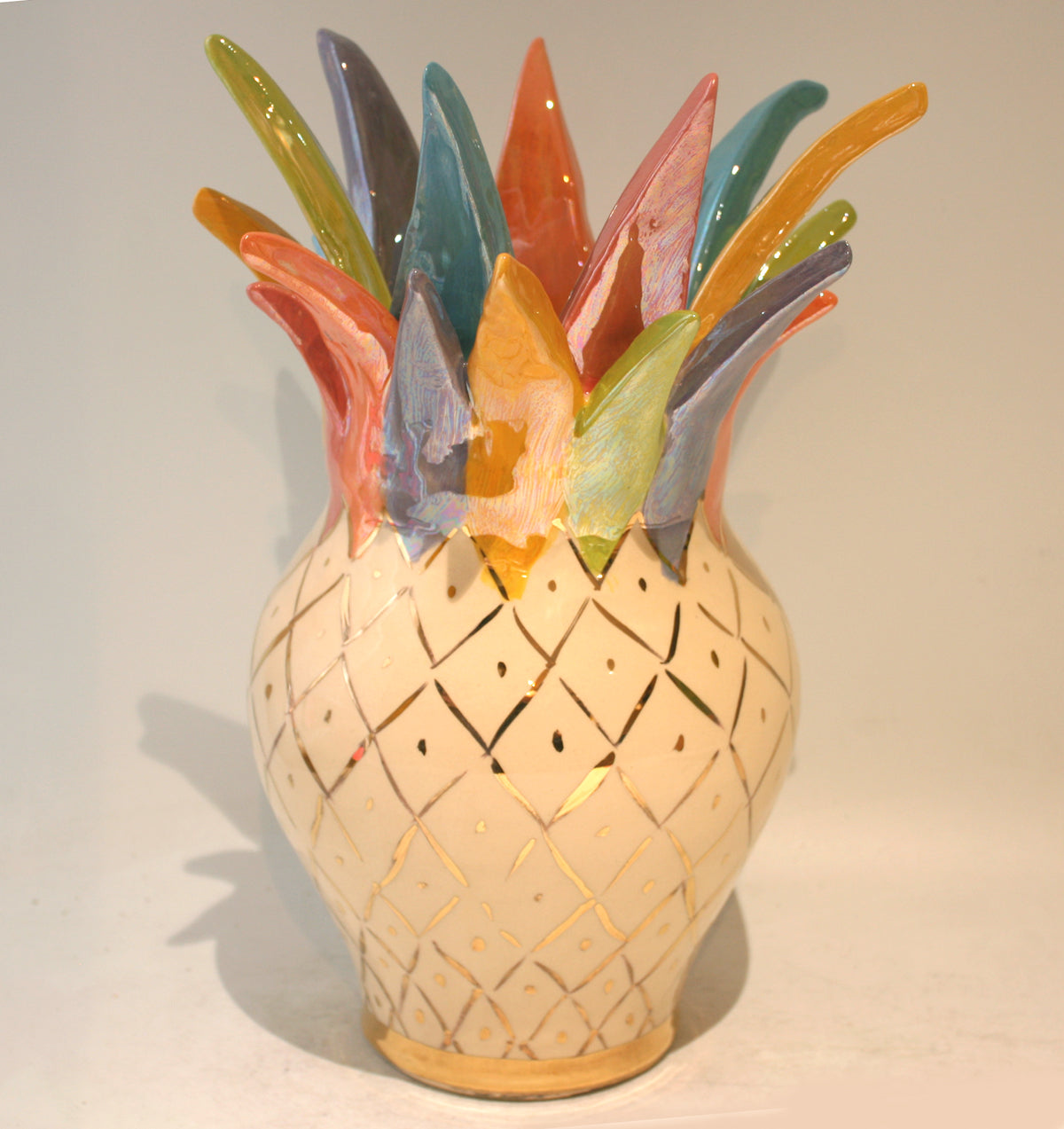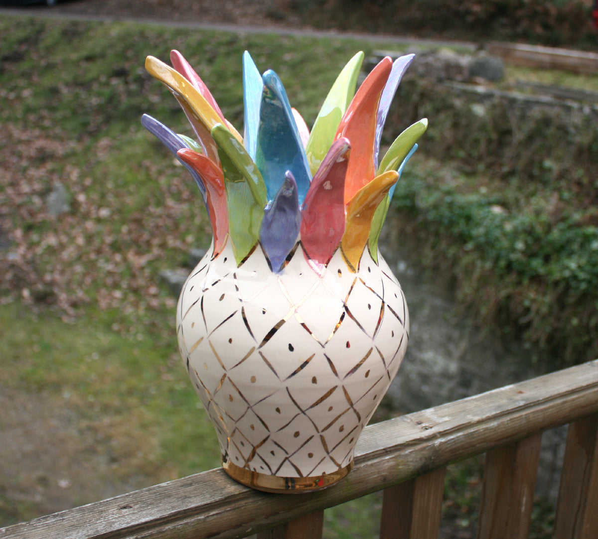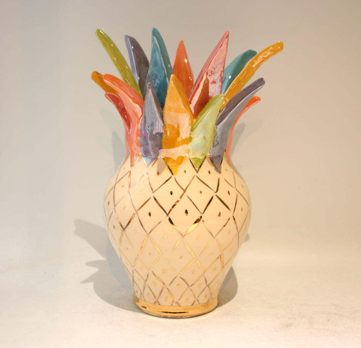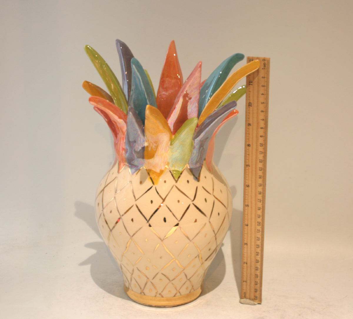 This Vase made by Mary Rose stands at around 12 inches in height, and takes its' inspiration from a Pineapple with many hand-fashioned "Leaves" sprouting from its rim...these are in true Mary Rose Young style multicoloured and finished with a beautiful iridescence, and the vase itself remains white with detailing of 24 carat gold!