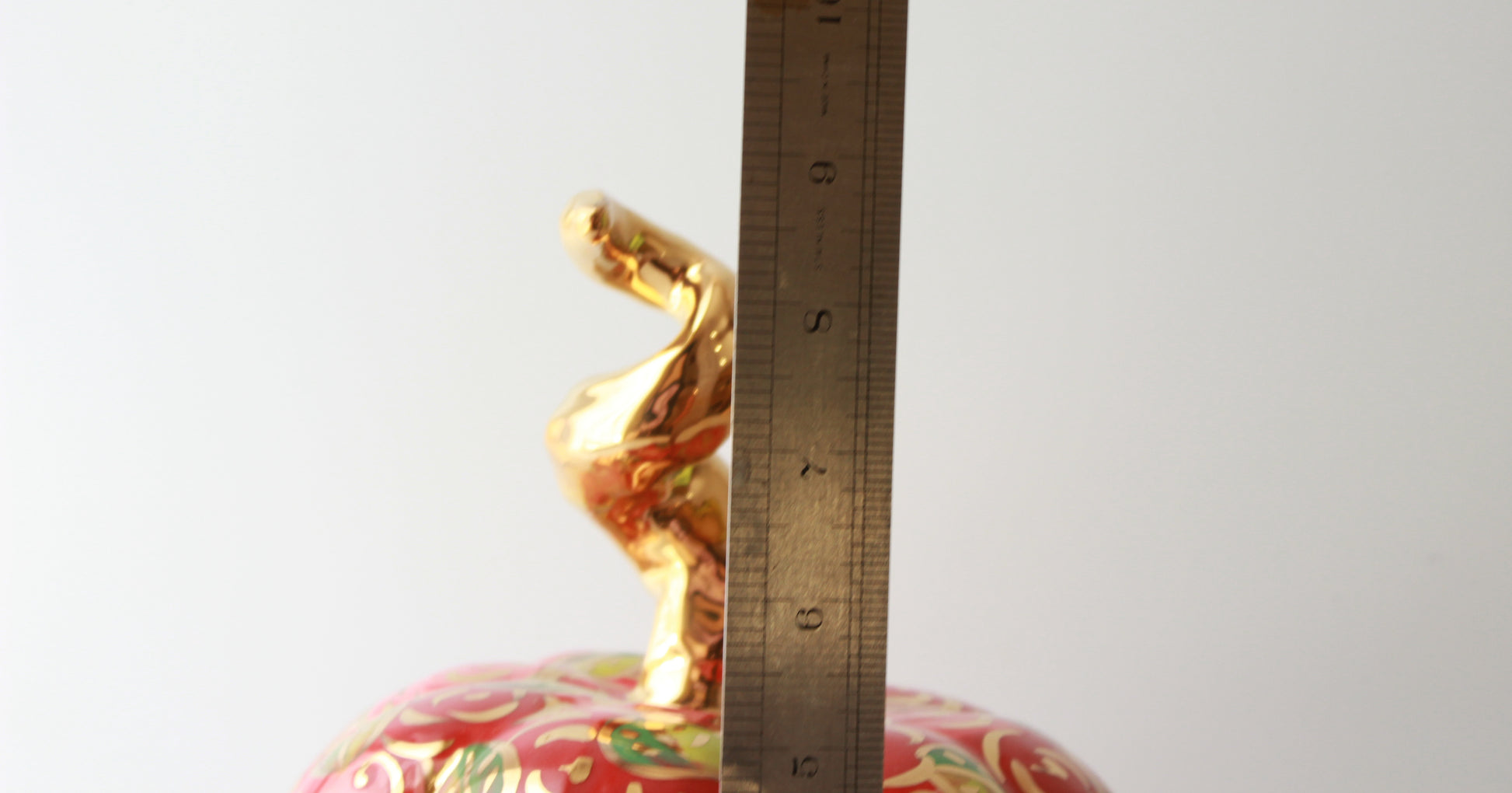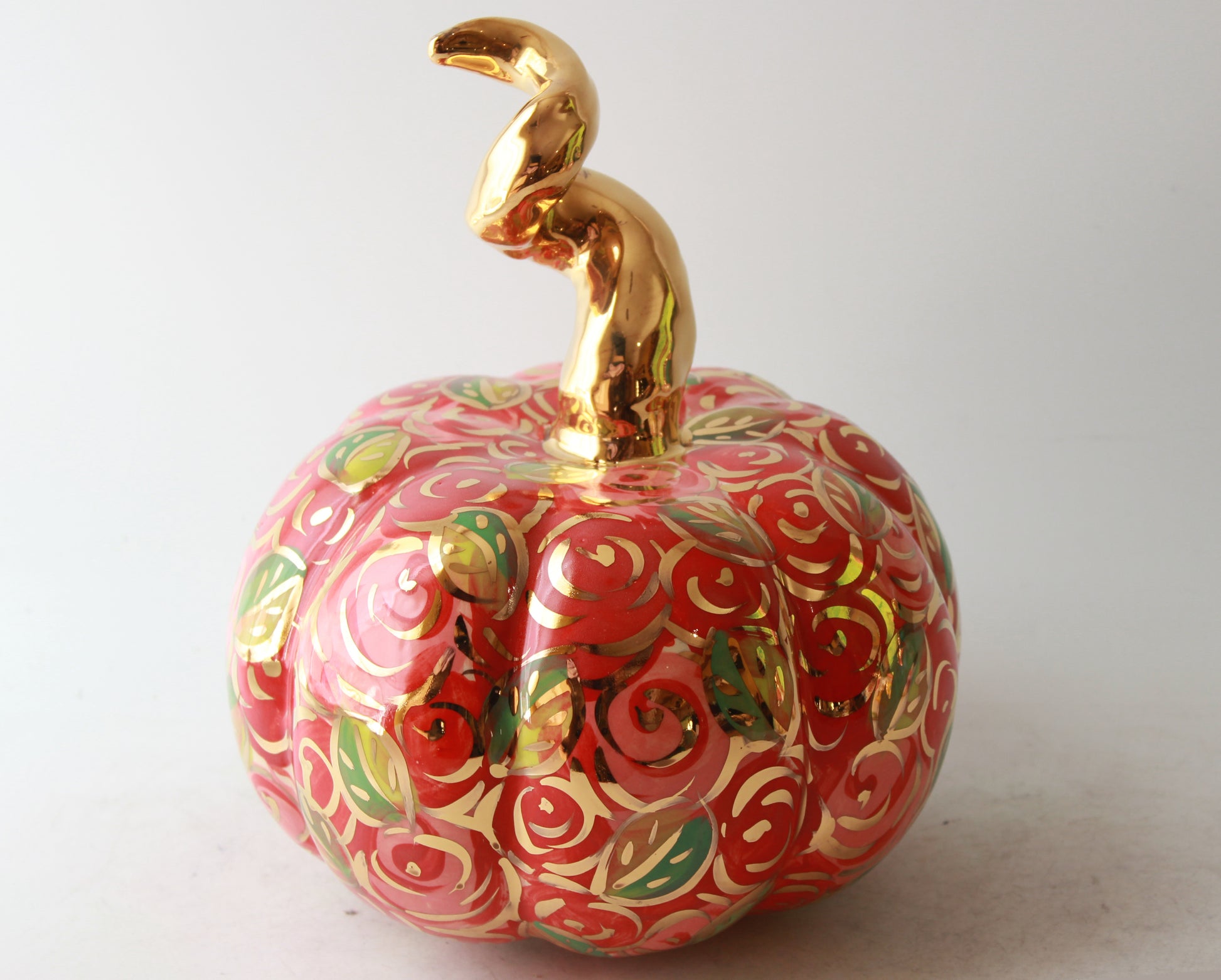 The bulging pumpkin panels are all as red as they can be with Mary Rose's densely packed rose head design, the gold stem contrasts richly. Overall the large pumpkin is 9 inches high