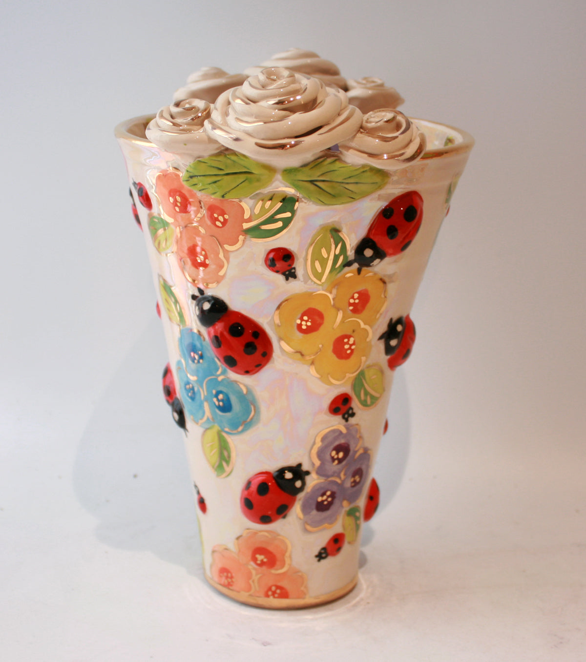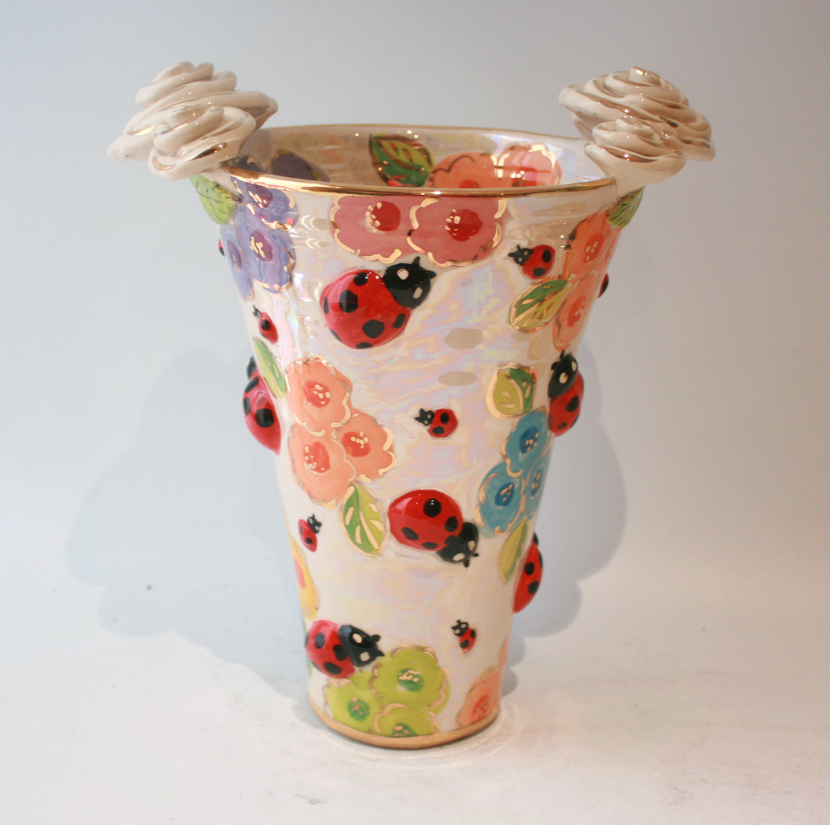 This Large Vase stands around 11 inches tall, and is painted in a new Mary Rose Young design, "Bugs", where adorable ceramic creatures roam around pastel flowers on a background of iridescence. There are two clusters of ceramic white and gold roses on either side of its rim, which make this piece a definite showstopper!