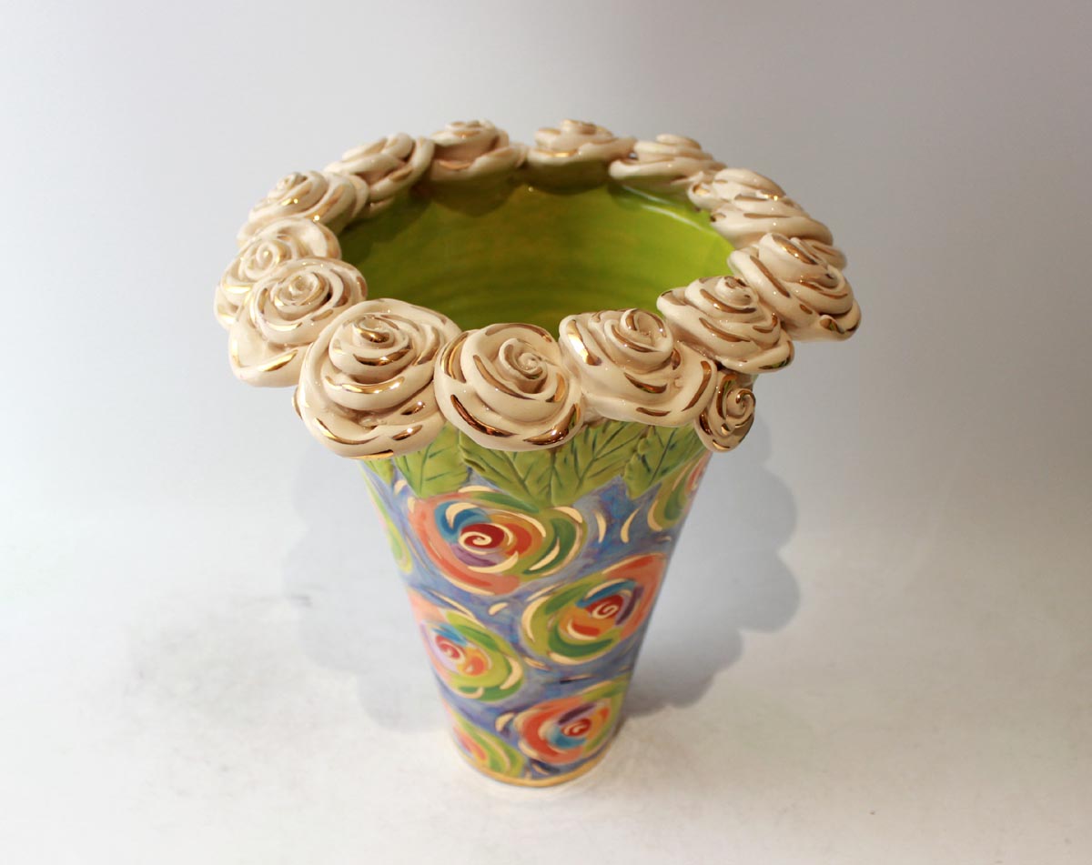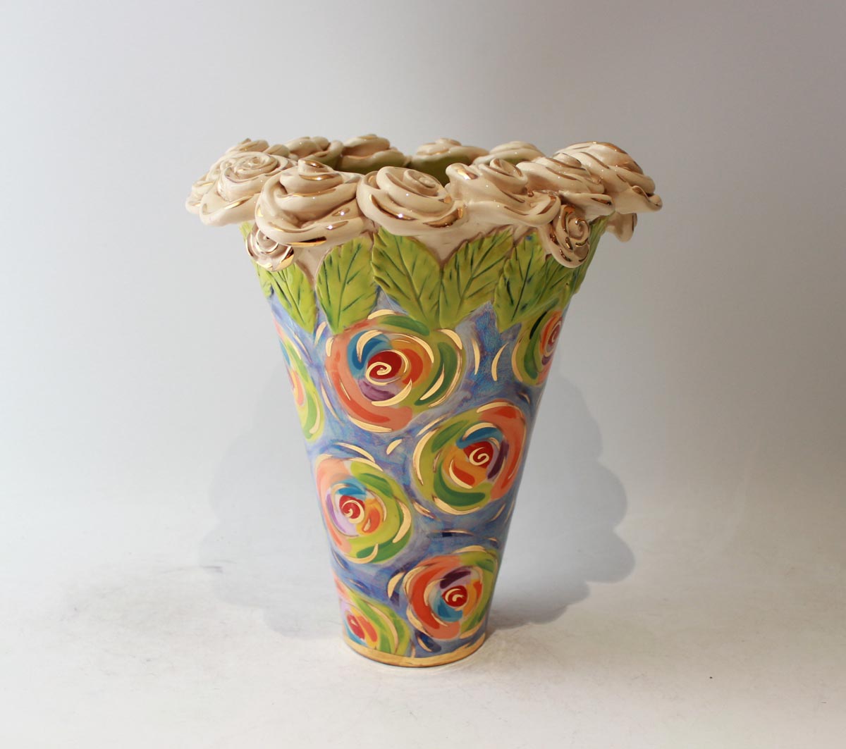 A Large Flared Vase made by Mary Rose stands just under 12 inches in height and is full of all of the whimsical charm that makes her work so special...this one has a ring of ceramic white gold roses encrusting its rim and is painted in "Swirls" design, where colourful roses sit on a blue swirled background accented by flecks of 24 carat gold!