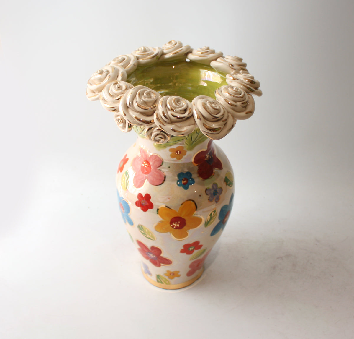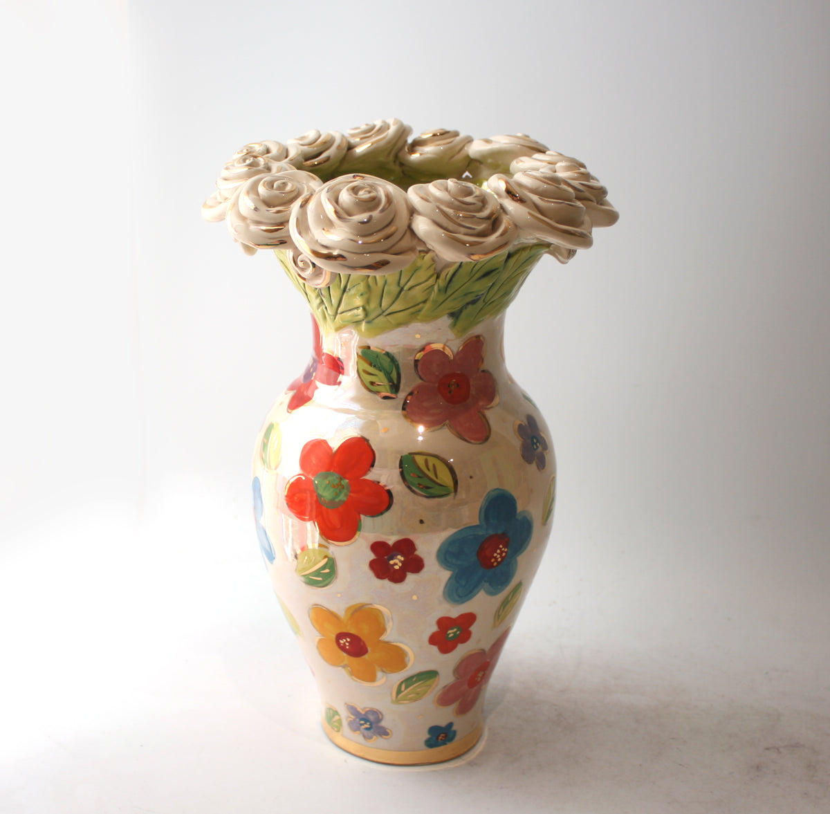 A 12 inch high Vase with delightfully curved edges painted in the very pretty "Daisy" design, with a row of white gold ceramic roses encrusting its rim!