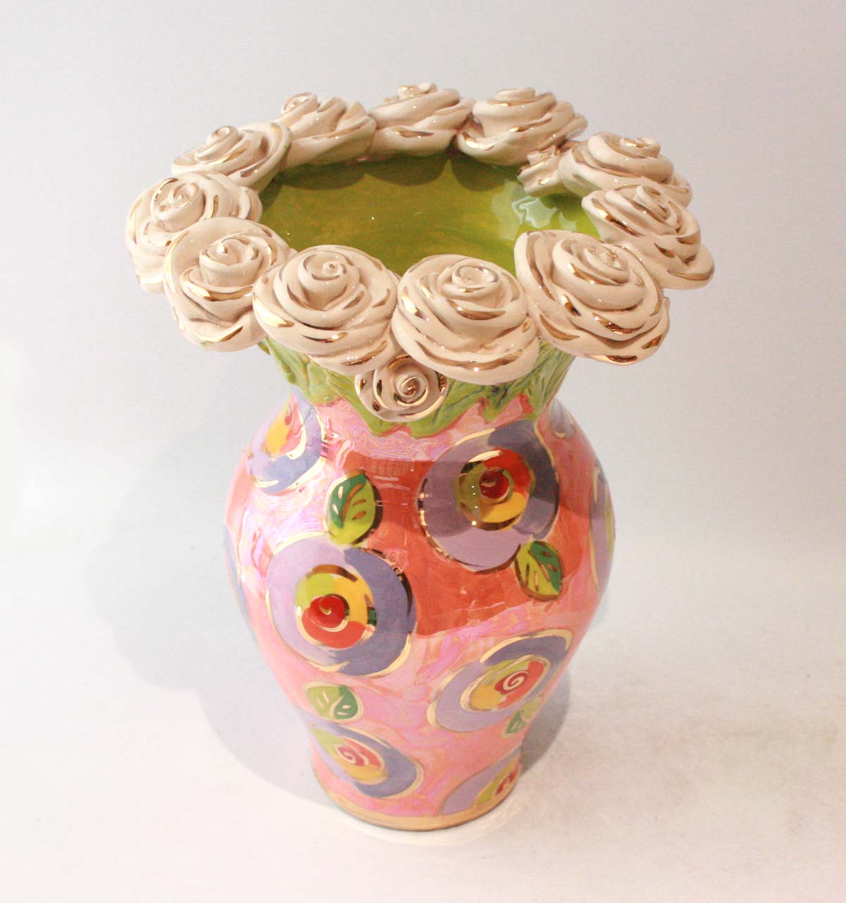 A Large Vase made by Mary Rose stands around 12 inches high, and this one has a ring of ceramic white gold roses that sit on a layer of green leaves and encrust its rim...it is painted in "Gold New Rose" on a pretty iridescent peach with accents of 24 carat gold!
