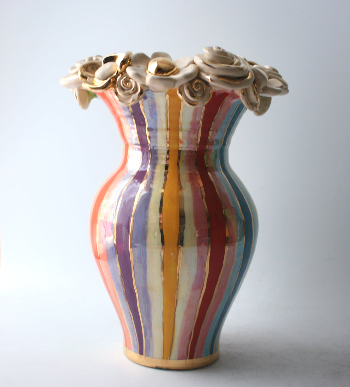 A 12 inch high Vase with delightfully curved edges painted in the decadent "Lustred Stripe", with a ring of white gold roses around its rim and accents of 24 carat gold throughout...