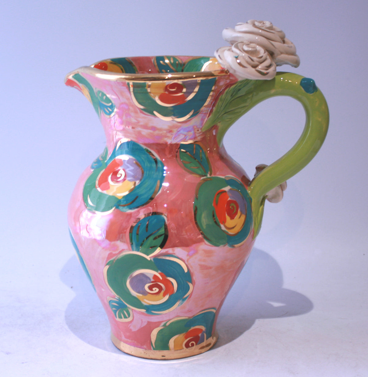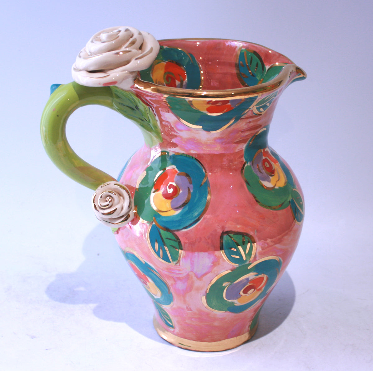 Large Rose Handled Jug in Gold New Rose on Iridescent Pink