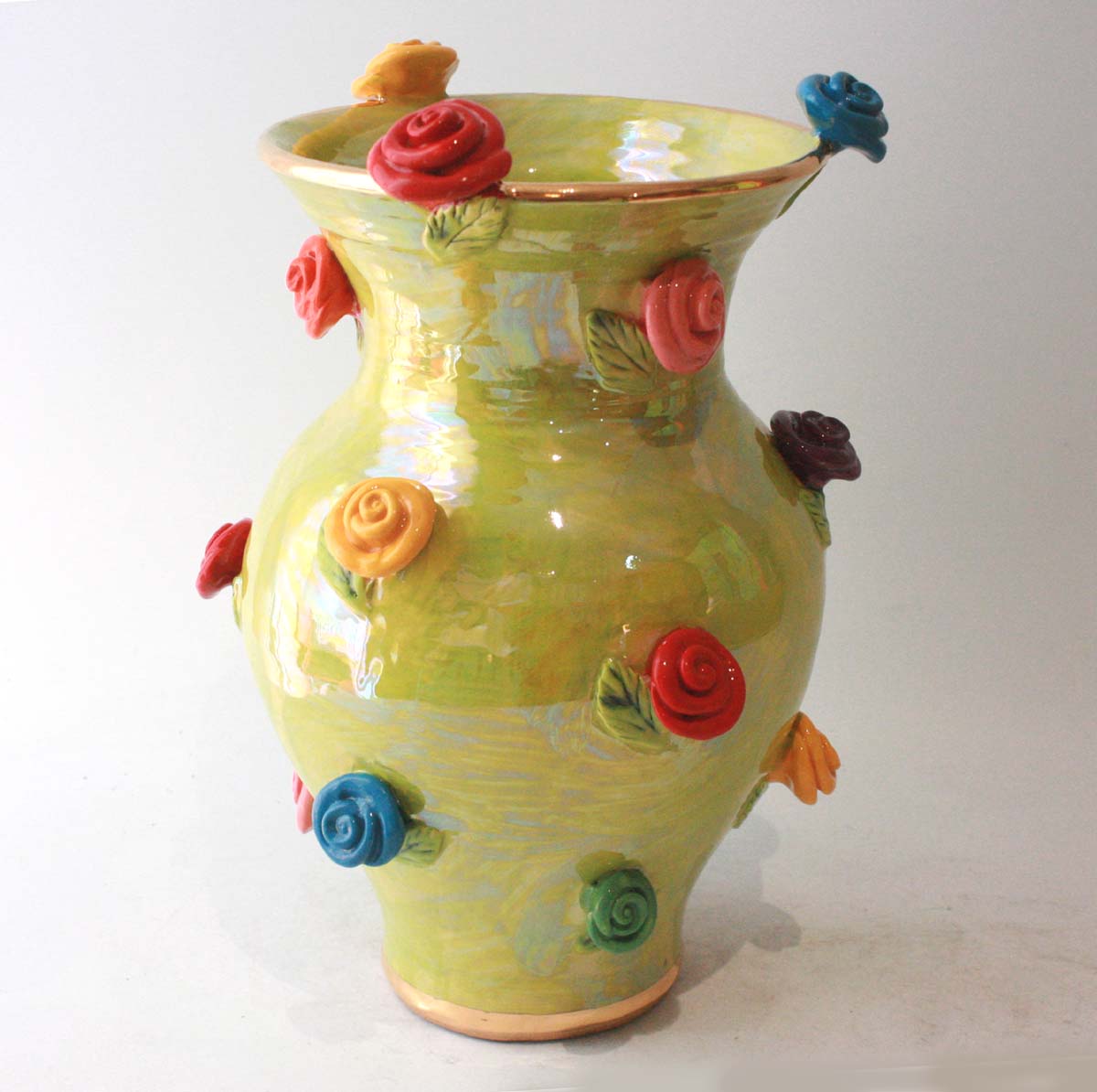 This magnificent Vase is painted in a pretty iridescent green, and has had Roses of all different colours "stuck" onto its surface...it stands 11 inches tall, and will certainly turn heads wherever it ends up!