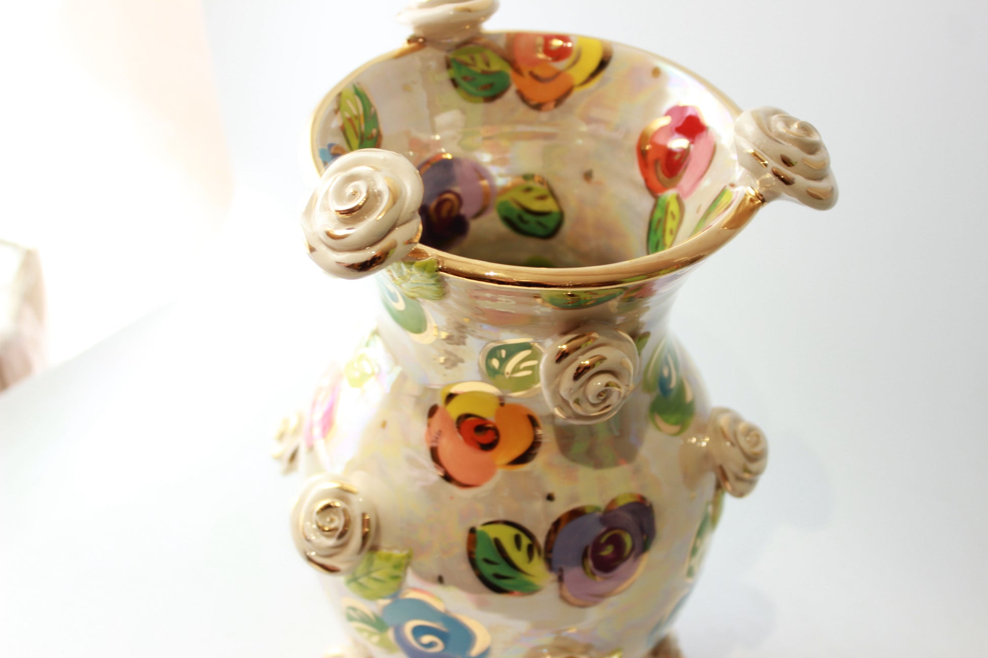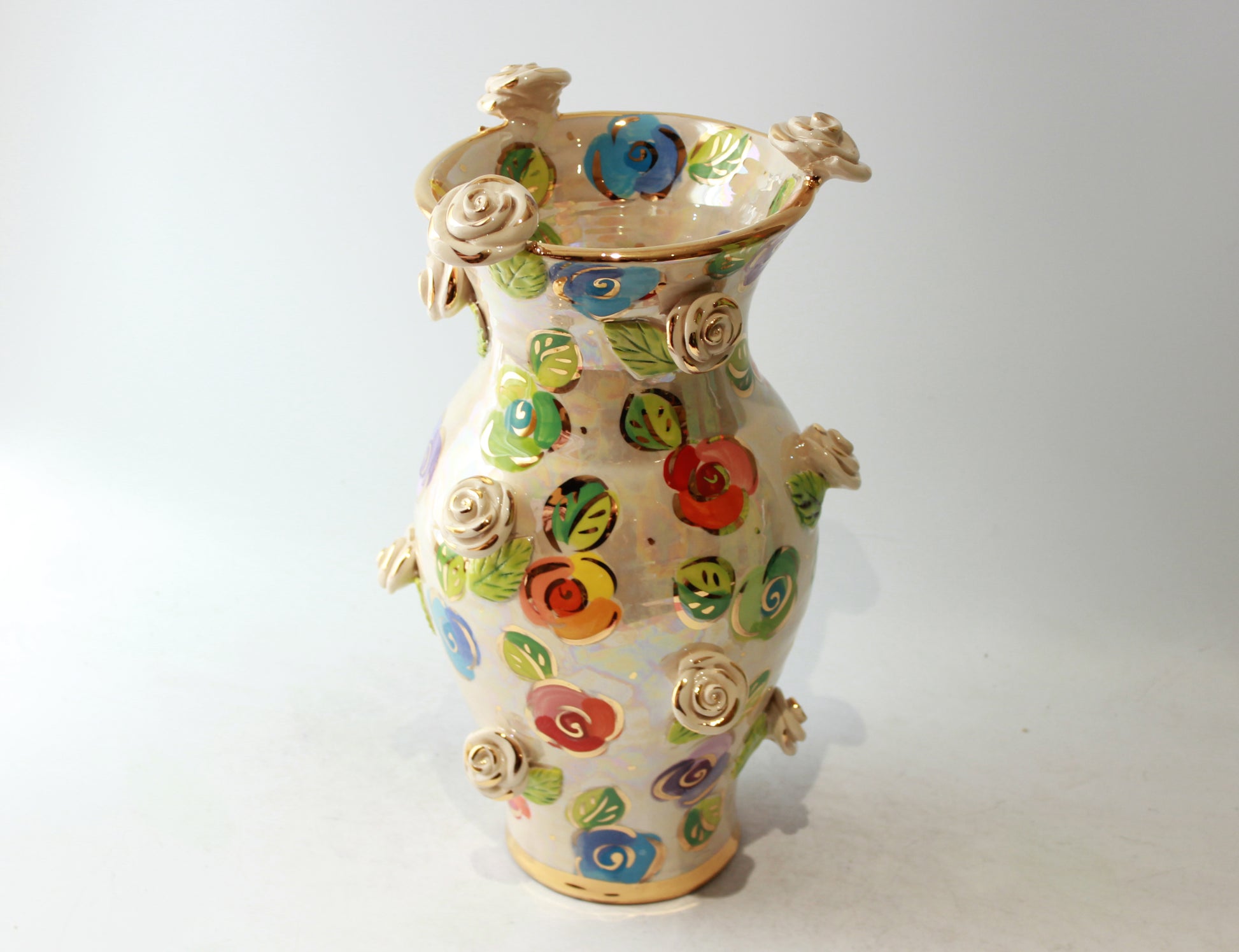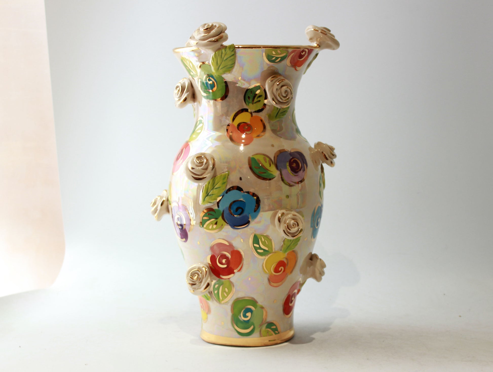 Mary Rose's latest Large Rose Studded Vase could be called a "Double Rose Vase" because some of the roses sprout out of the iridescent surface as 3D roses, and the rest sit colourfully on that surface as flat painted versions. The Vase is 12" high...place it nonchalantly on your hall table and wait for the excited reactions