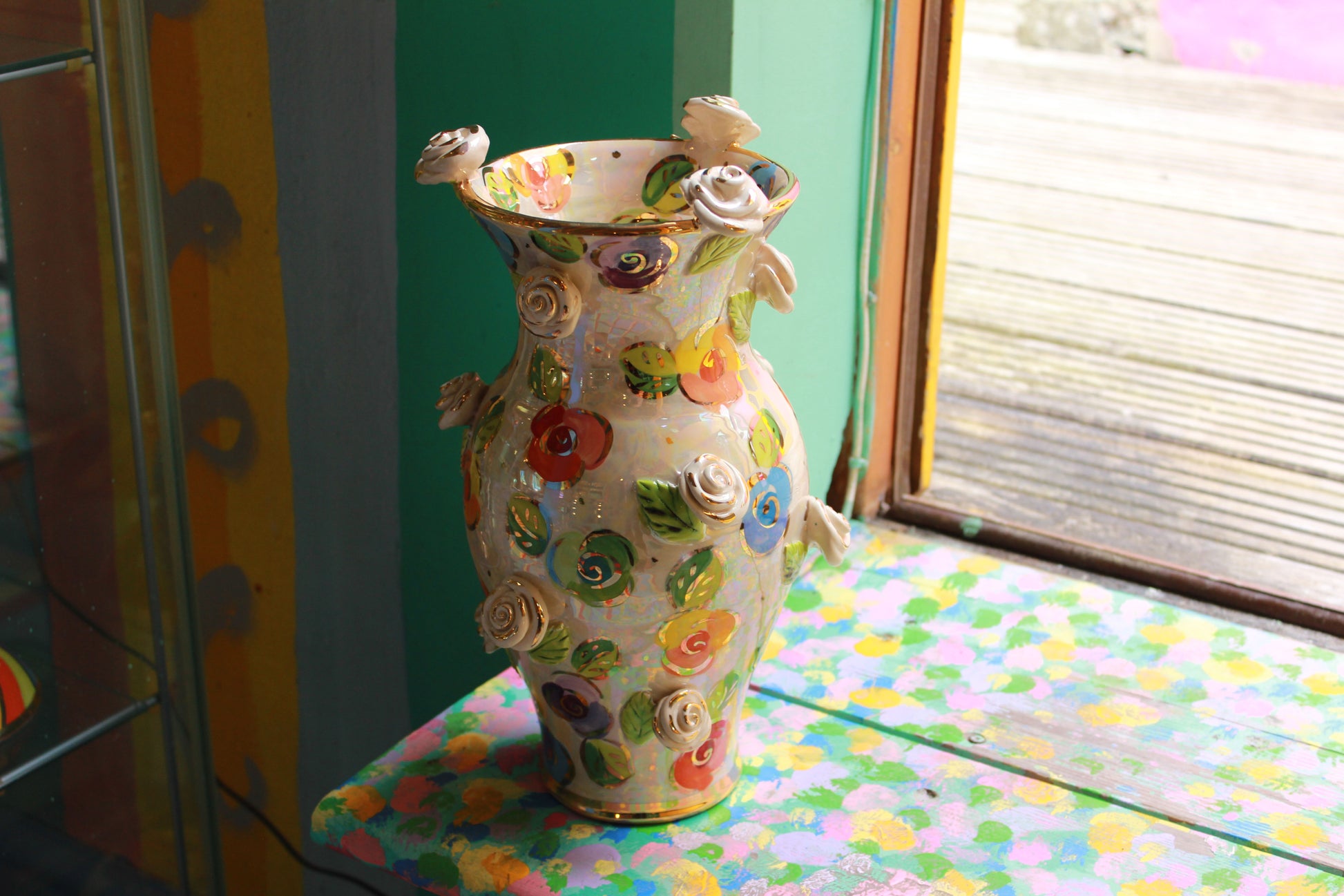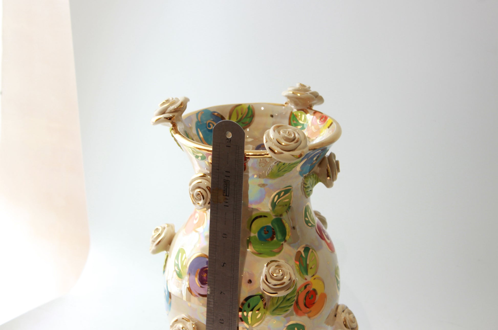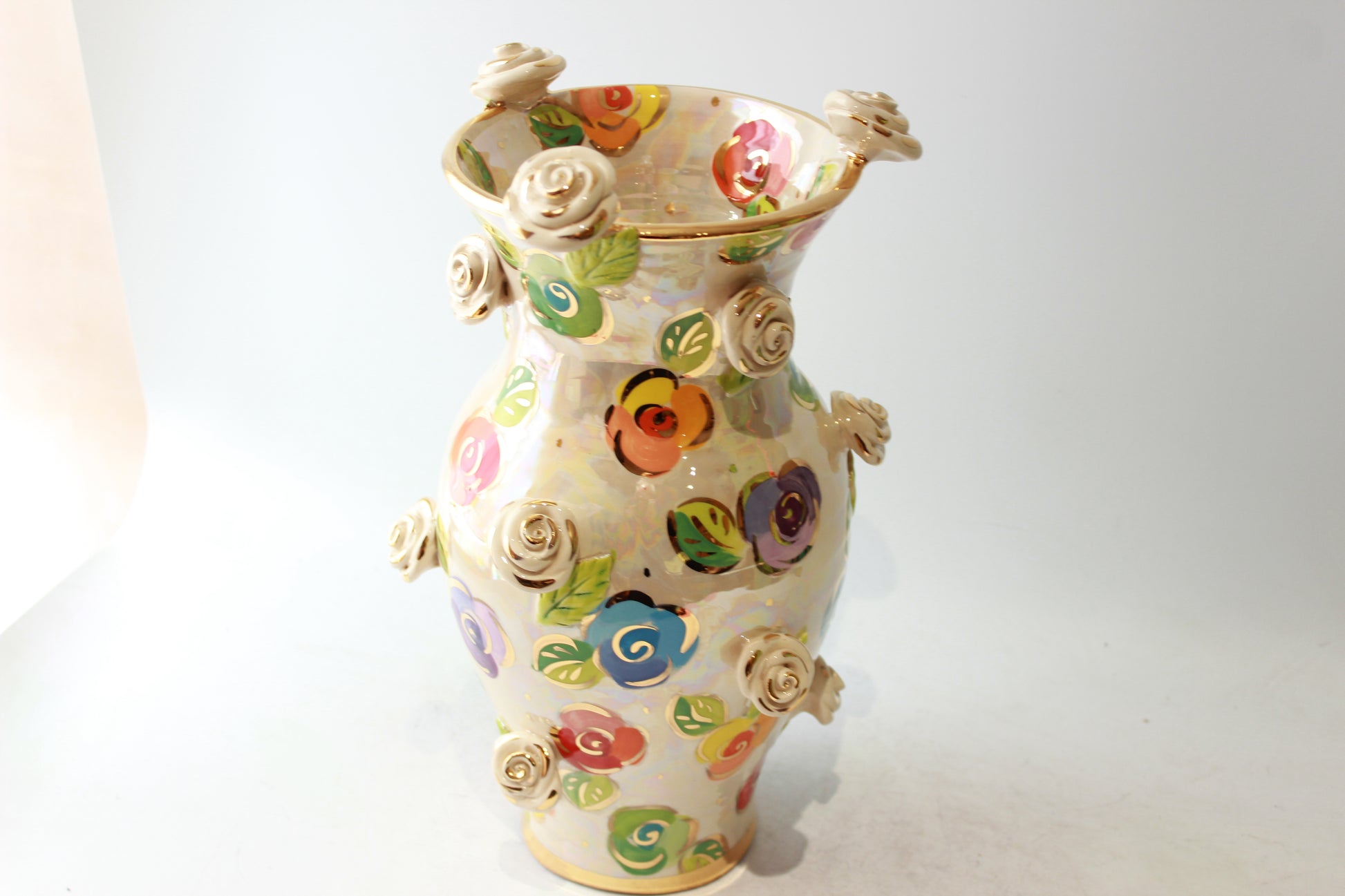 Mary Rose's latest Large Rose Studded Vase could be called a "Double Rose Vase" because some of the roses sprout out of the iridescent surface as 3D roses, and the rest sit colourfully on that surface as flat painted versions. The Vase is 12" high...place it nonchalantly on your hall table and wait for the excited reactions