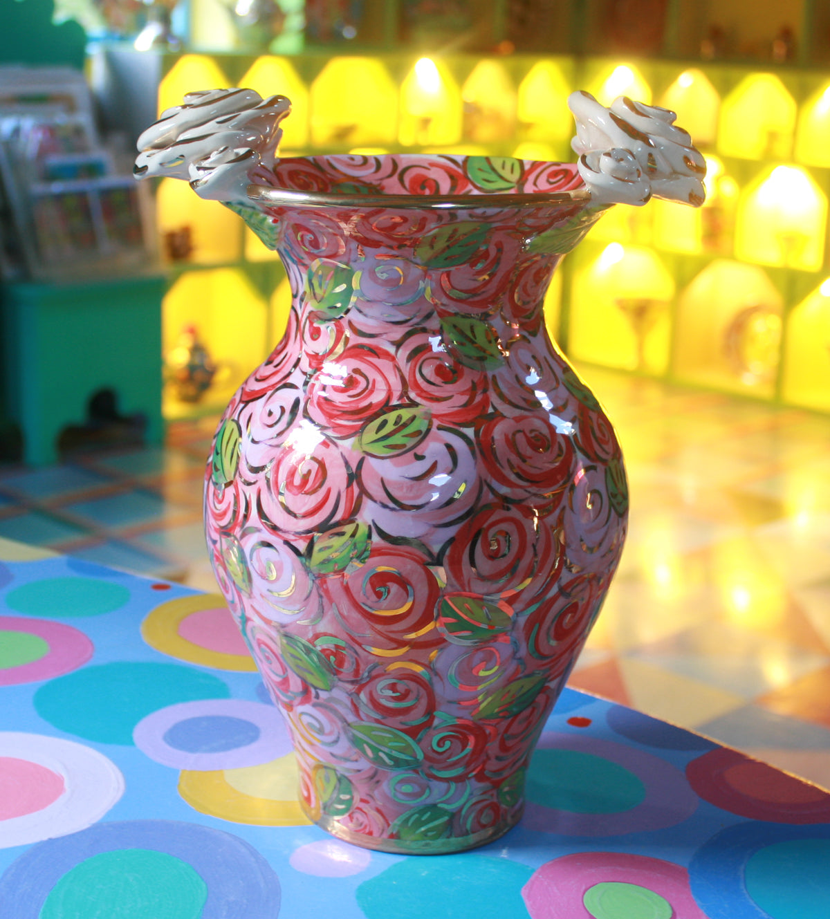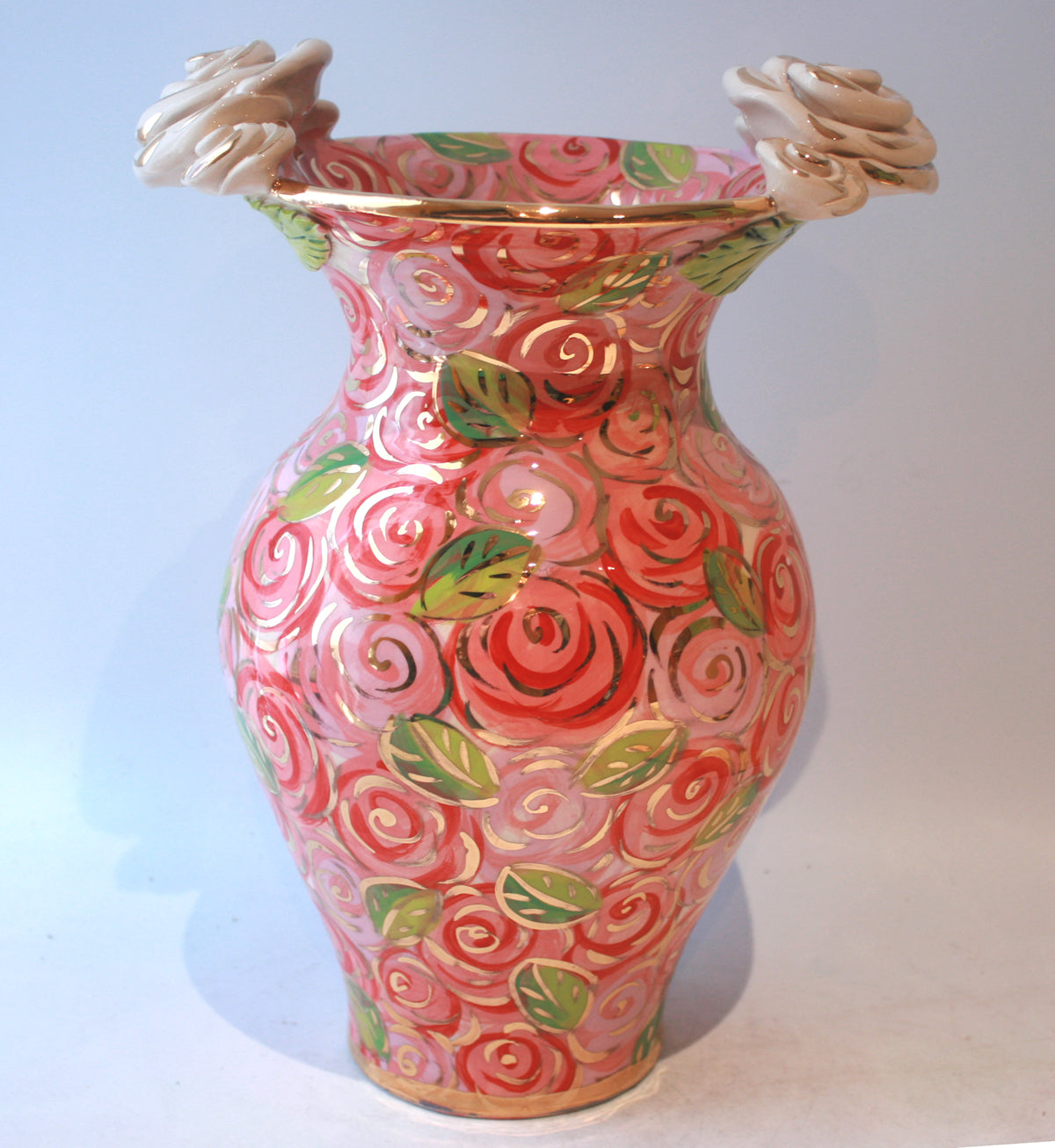 This Large Vase stands around 12 inches high, and is painted in the pretty "Pink Rosebush" design, with accents of 24 carat gold and two clusters of ceramic roses on either side of its rim...