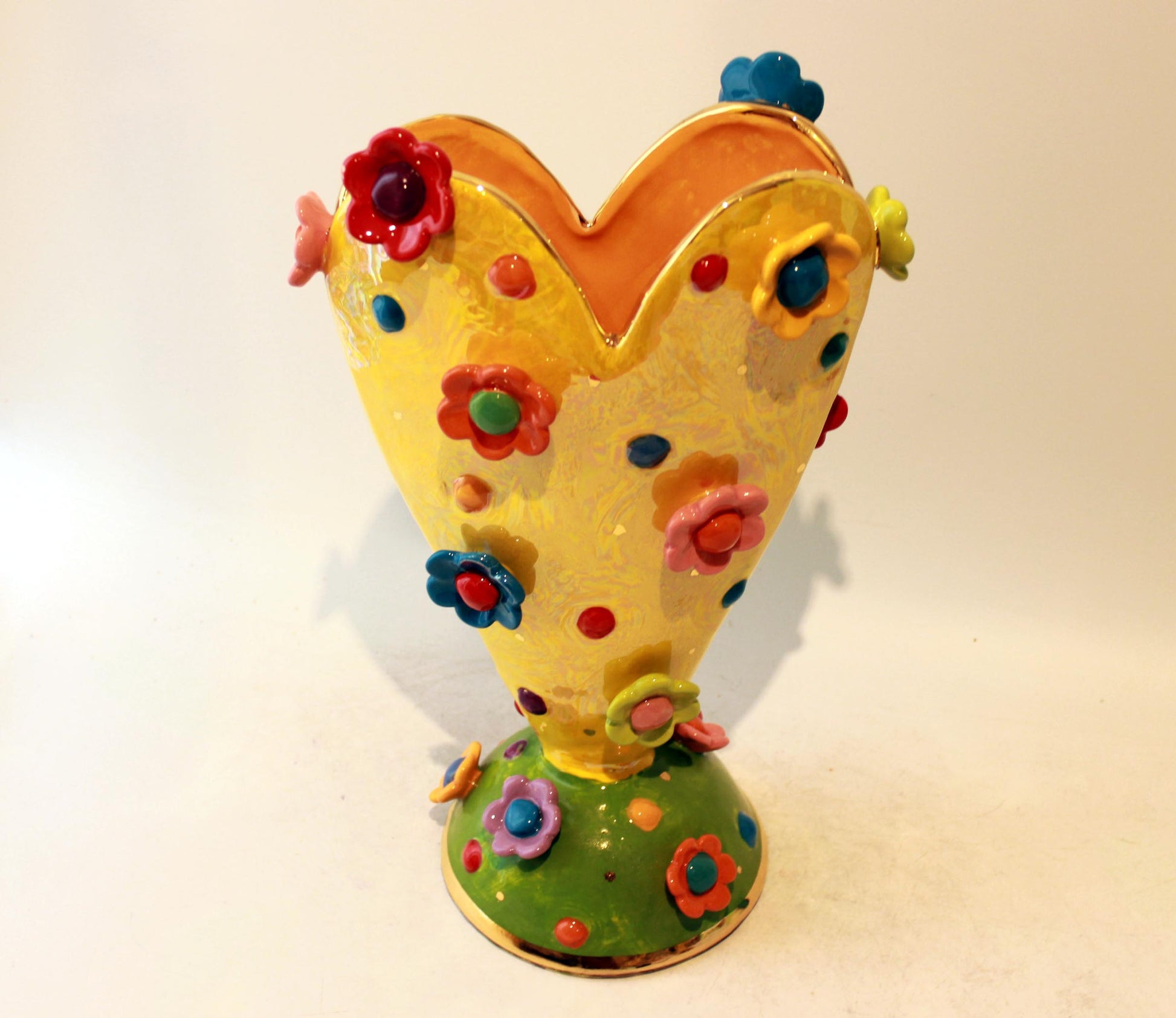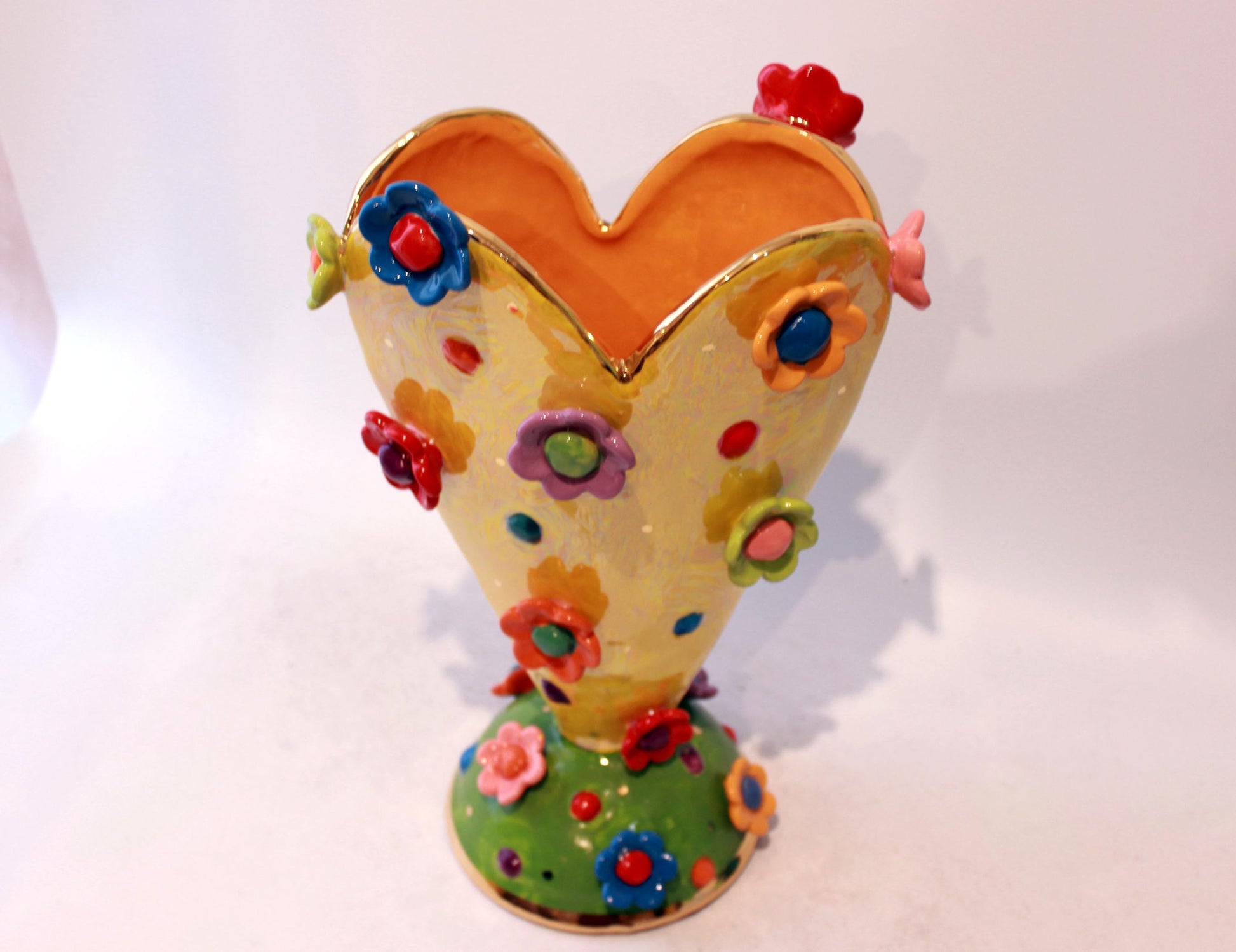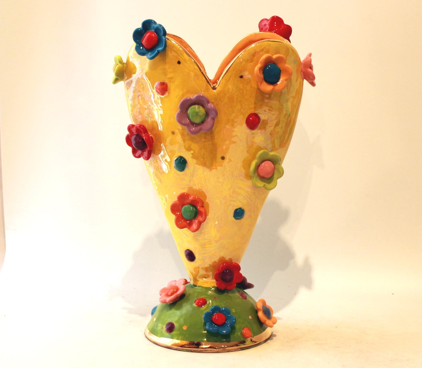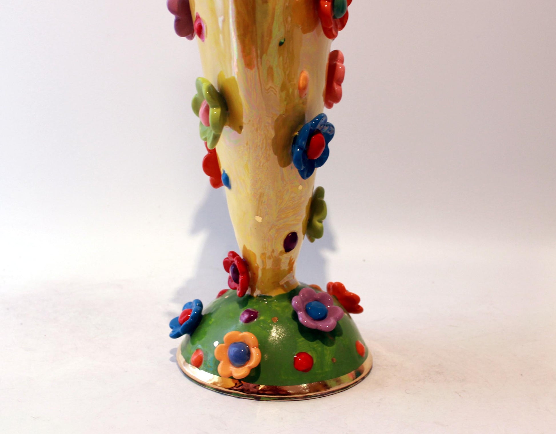 This vase is a giant...it's 12.5 inches to the highest part of the rim and 13 inches if you include the red daisy that pokes up higher. Mary Rose deliberately chose to give this piece a "Spring Look"....perhaps the colours more than anything put that time of year into our minds