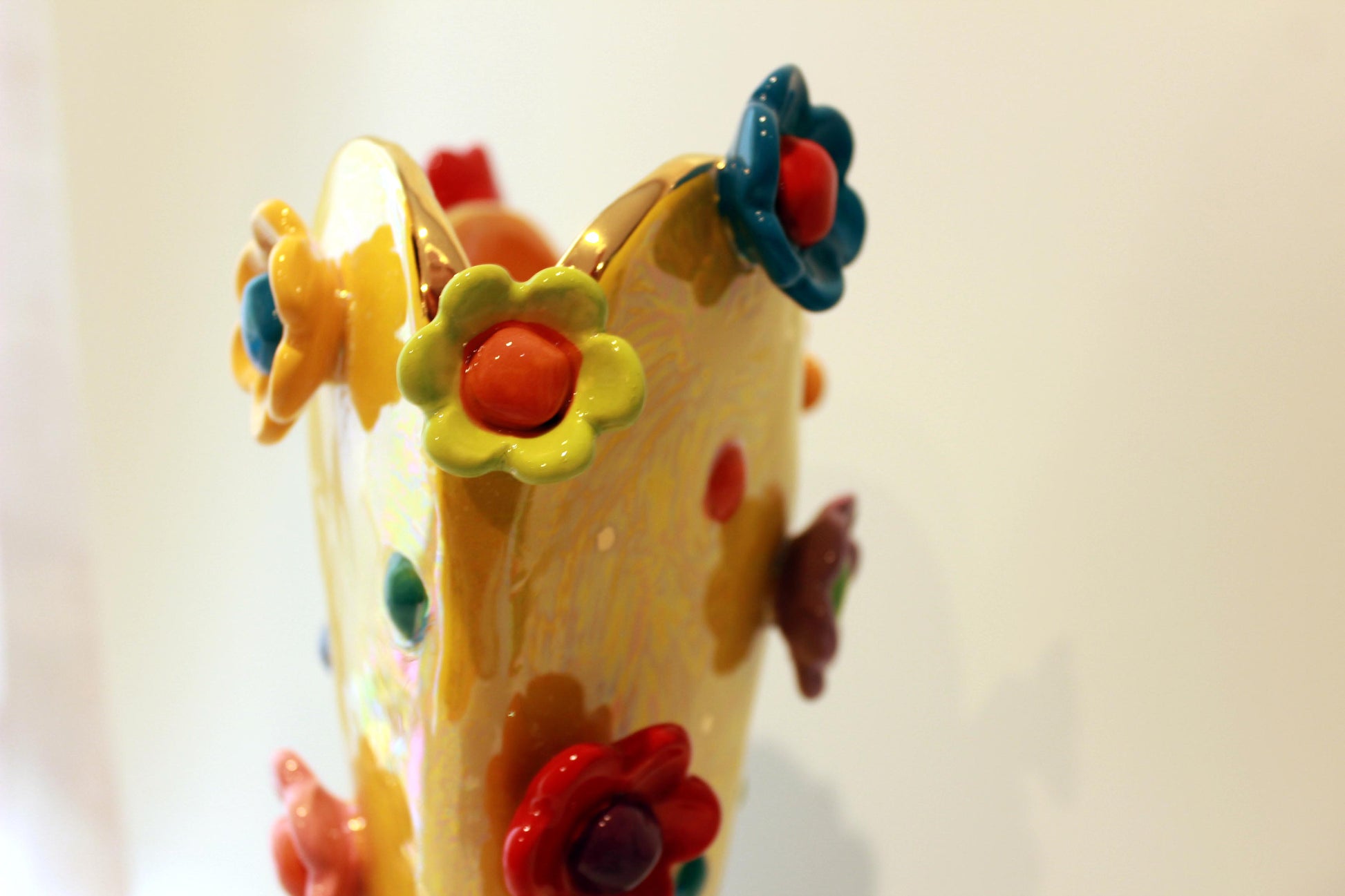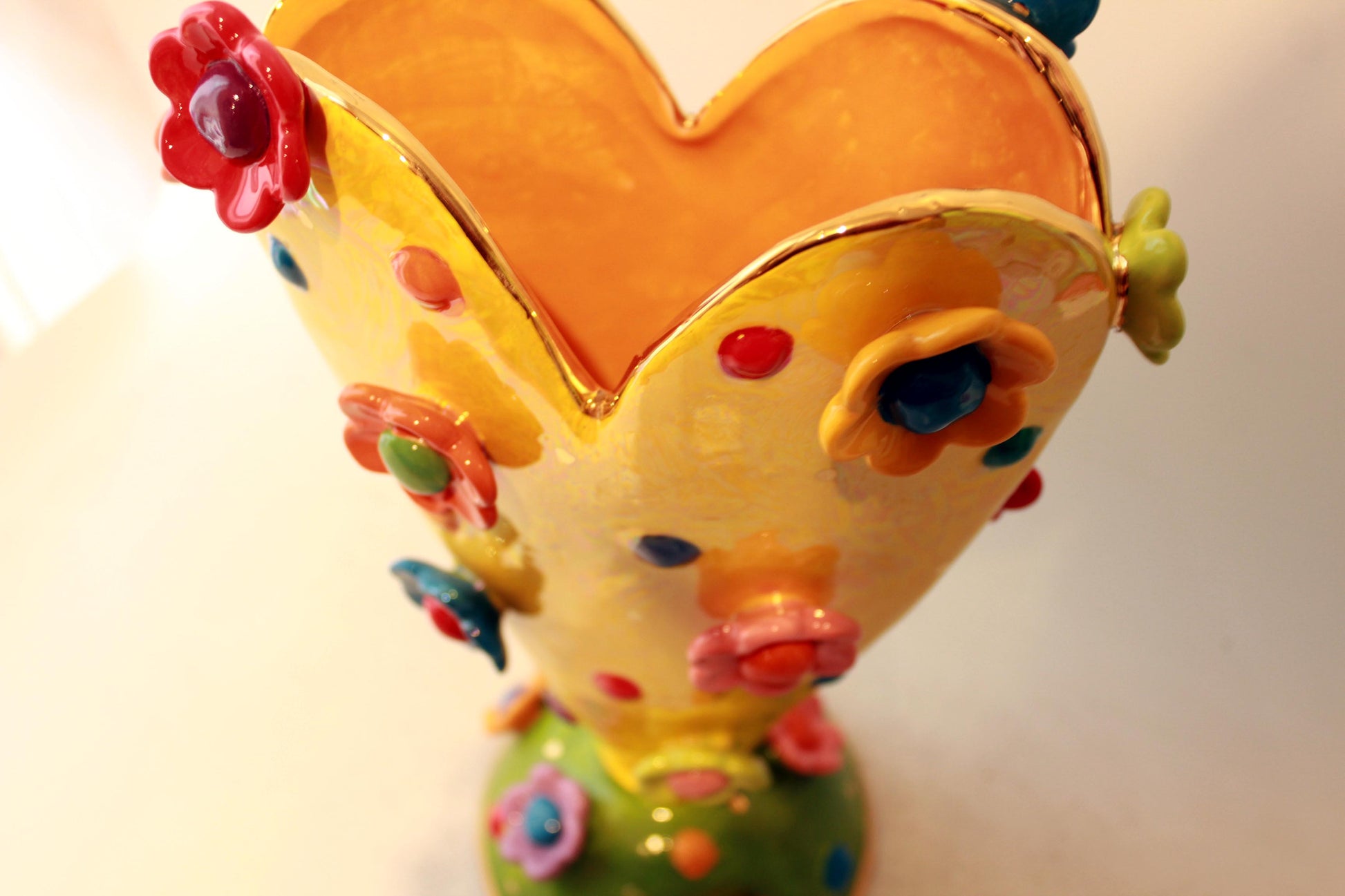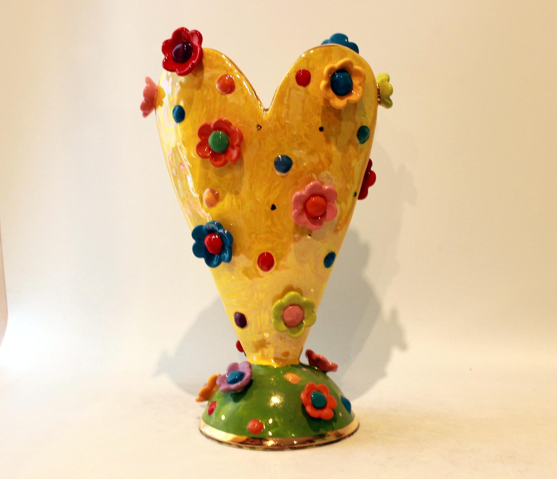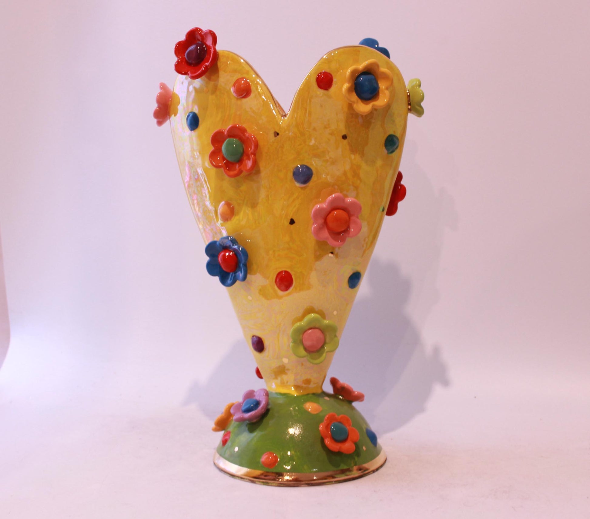 This vase is a giant...it's 12.5 inches to the highest part of the rim and 13 inches if you include the red daisy that pokes up higher. Mary Rose deliberately chose to give this piece a "Spring Look"....perhaps the colours more than anything put that time of year into our minds