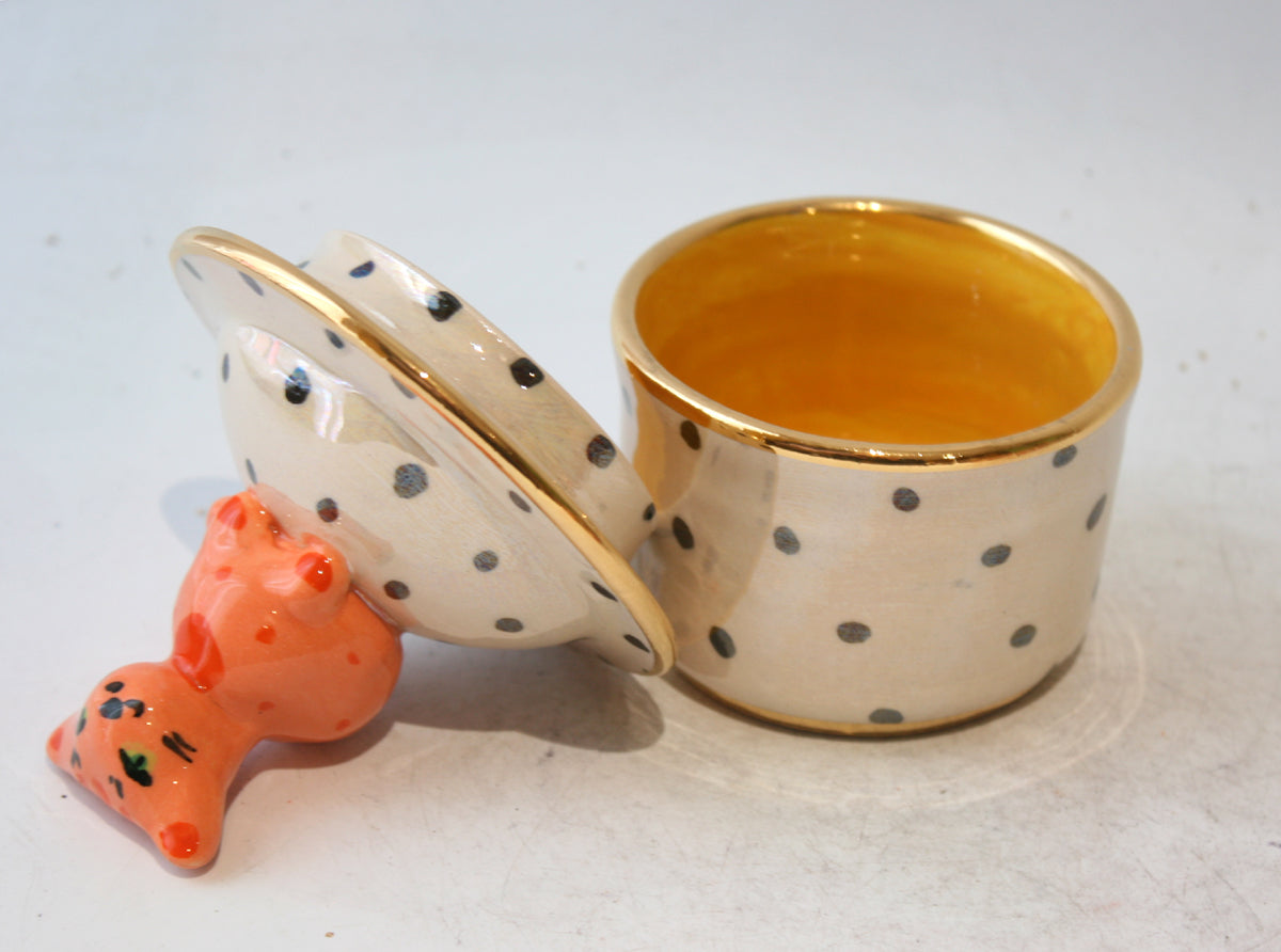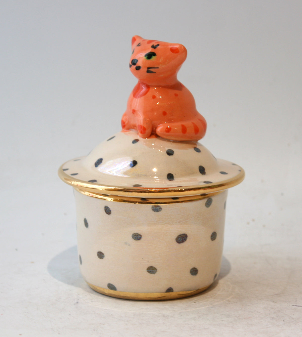 This Lidded Pot seems to be home to an adorable ceramic Cat, who will guard whatever possessions you decide to keep in it! It is painted in Polka with a layer of iridescence, and finished with accents of 24 carat gold...
