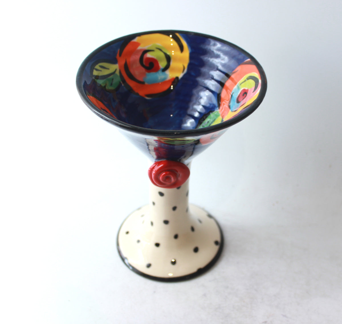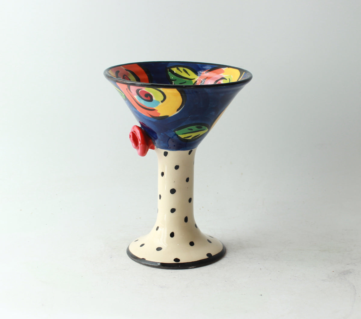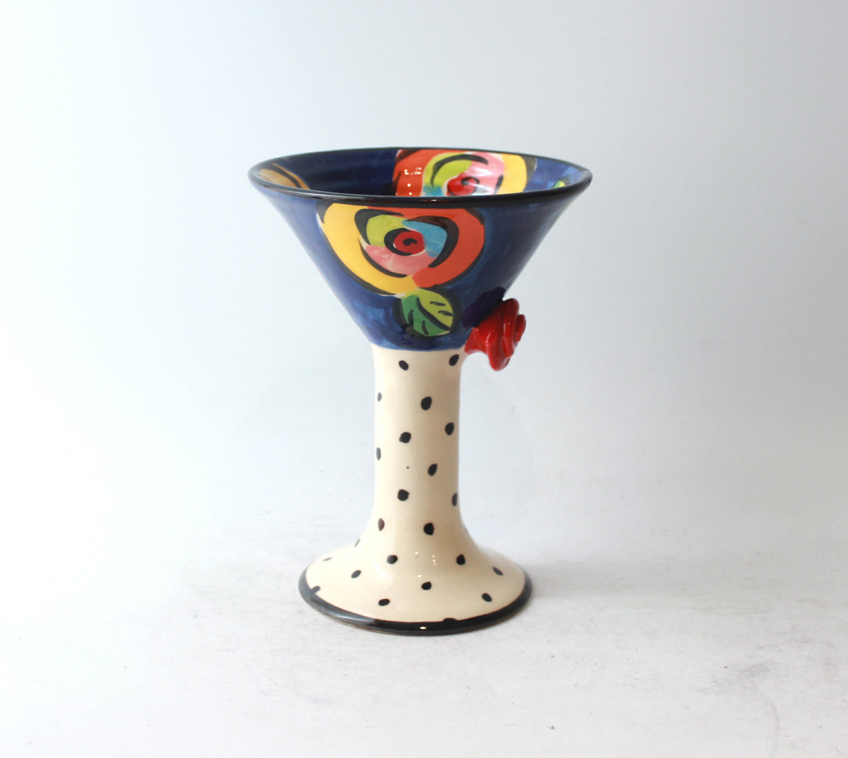 Mary Rose's Martini Goblets stand around 6.5 inches tall, and on this one the Cup is painted in "New Rose" on a deep blue background, the Stem decorated in polka dots, with a little red ceramic rose placed decoratively where they meet....