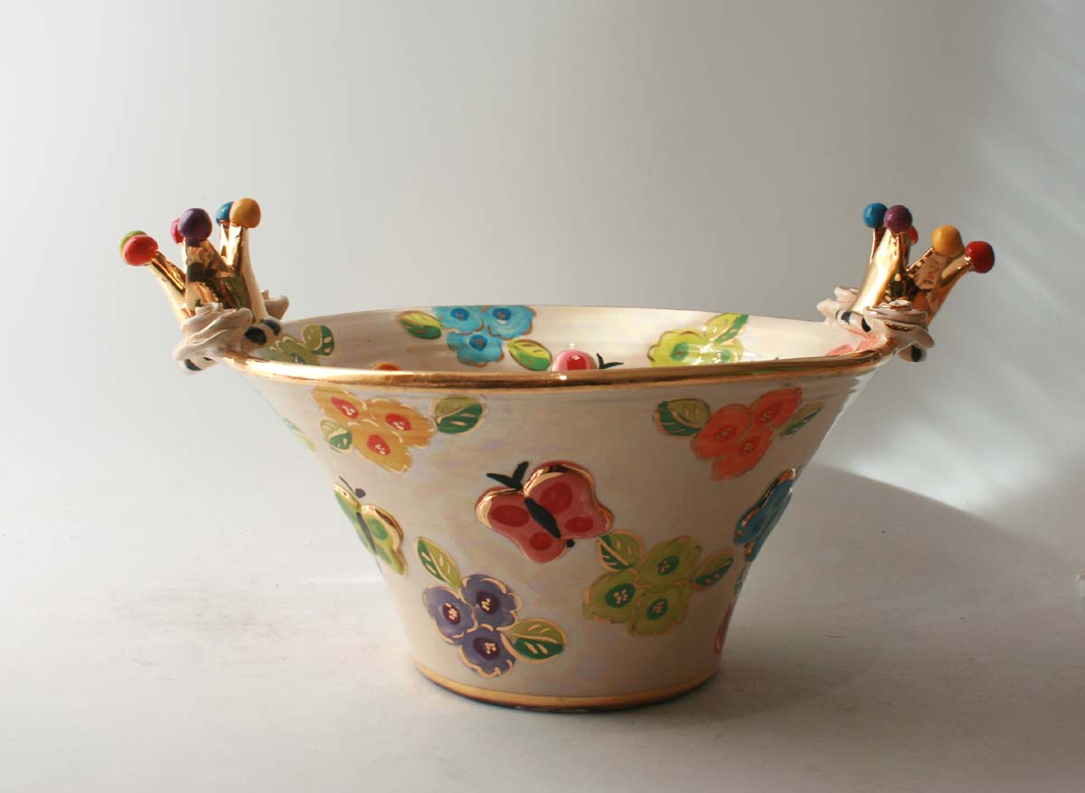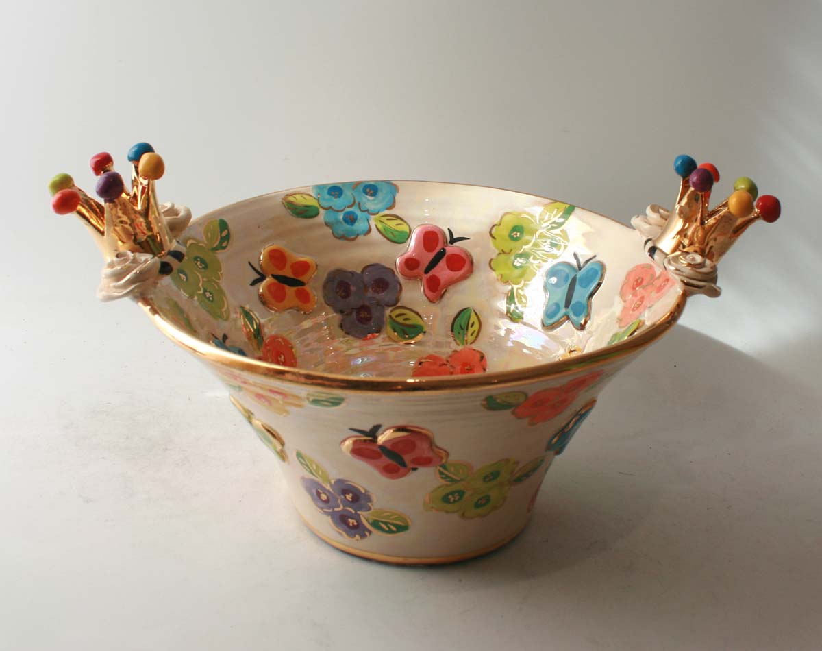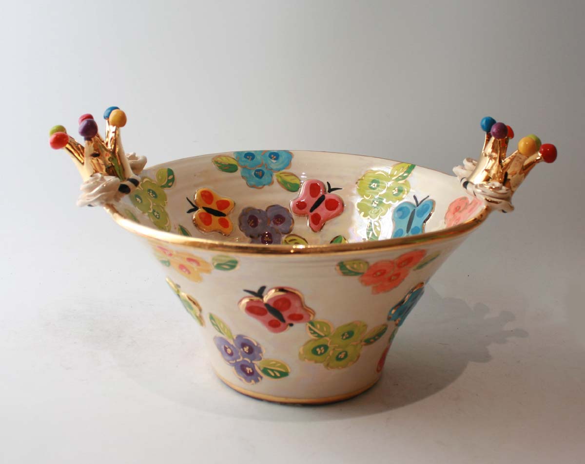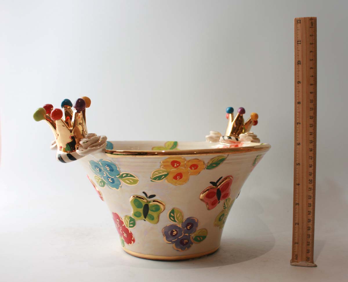 Mary Rose's Medium Serving Bowls measure around 12 inches in diameter and 8 inches tall...this particular one has colourful Butterflies stuck all over its surface, with a background of "Petit Fleur" design and two gold ceramic crowns on either side of its rim...