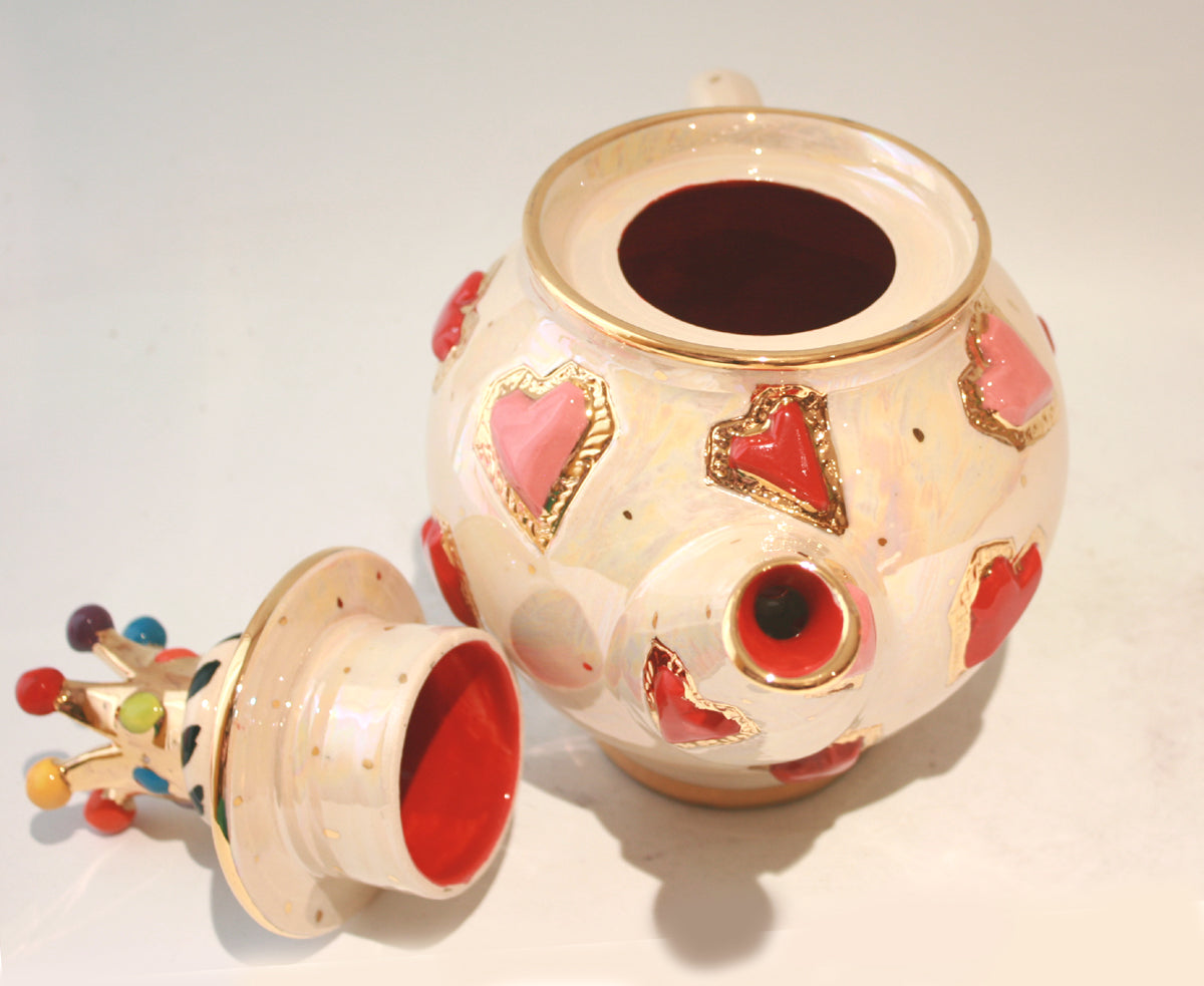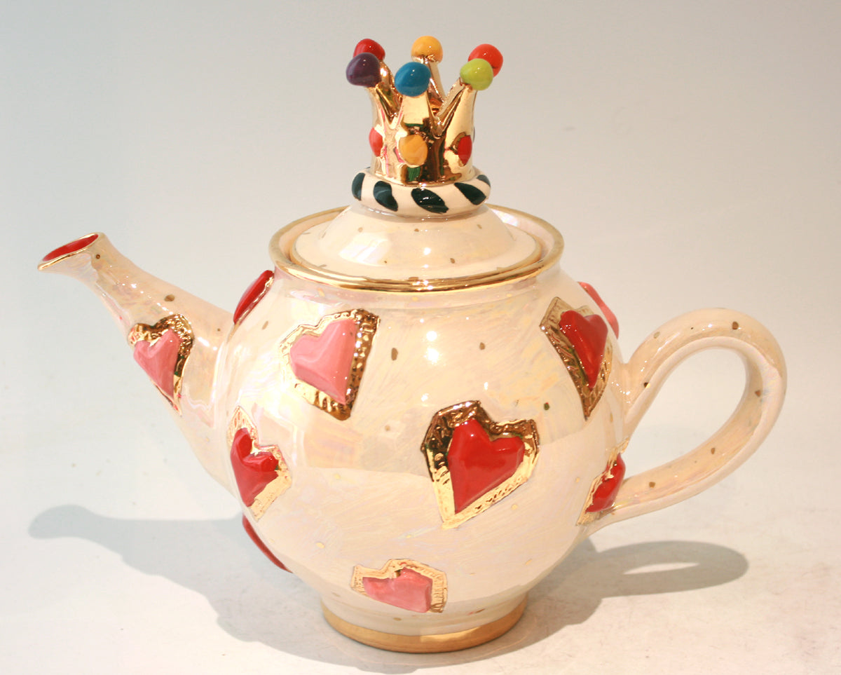 Mary Rose's Medium Teapots can hold around 4 cups...so they're the perfect centrepiece for your Afternoon Tea! This one has ceramic hearts that have been "stuck" all over its white iridescent surface, and also has a gold ceramic crown atop its lid acting as both a handle and a magnificent decoration! The Teapot is completed by accents of 24 carat gold....