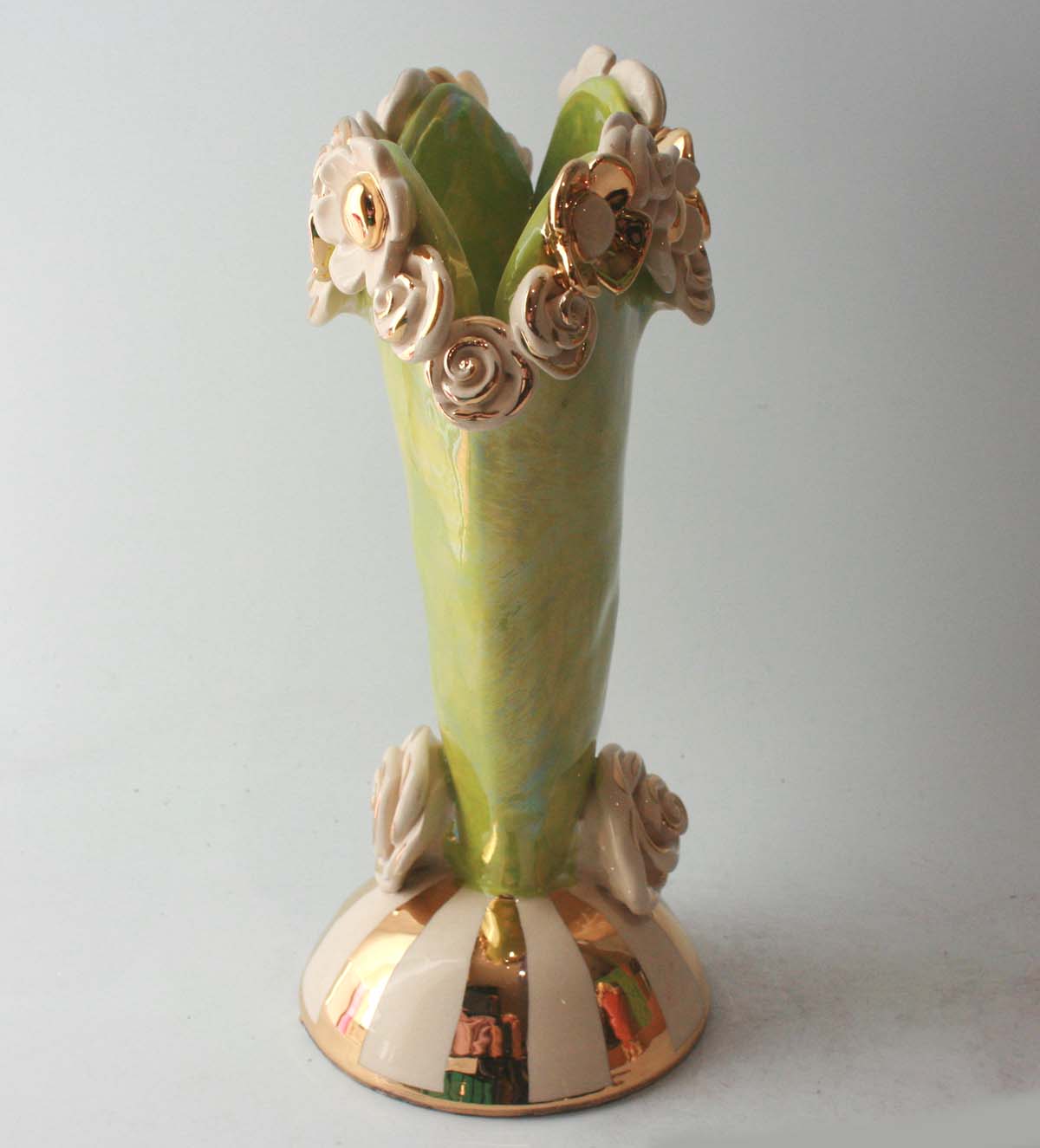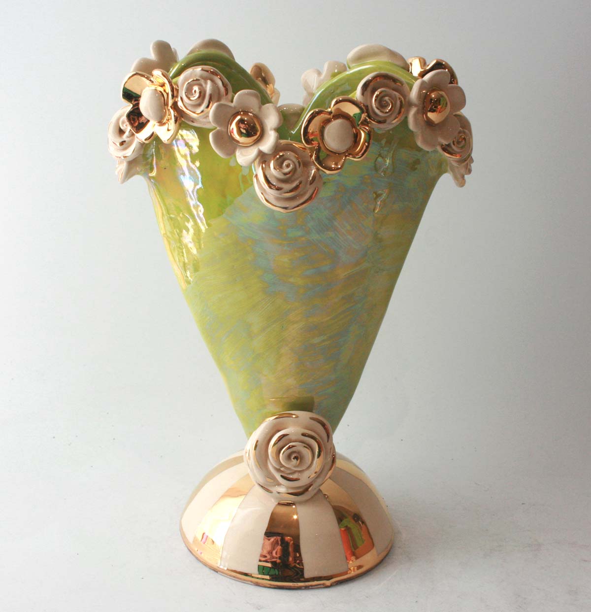 A Medium Heart Vase made by Mary Rose stands around 12 inches tall, and this one is painted in a pretty light green which has been given a coating of shimmering iridescence...it has a row of ceramic gold and white flowers encrusting its rim, and a gold and white striped base to match!