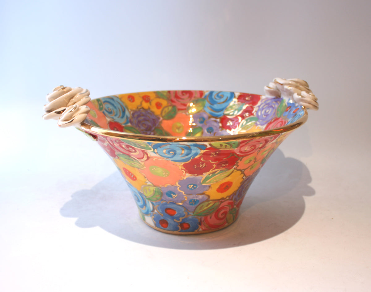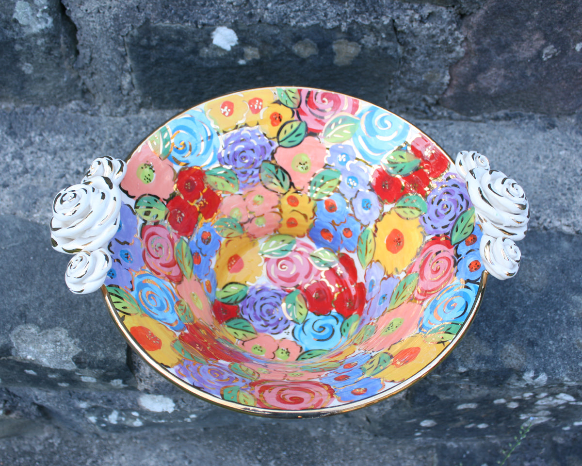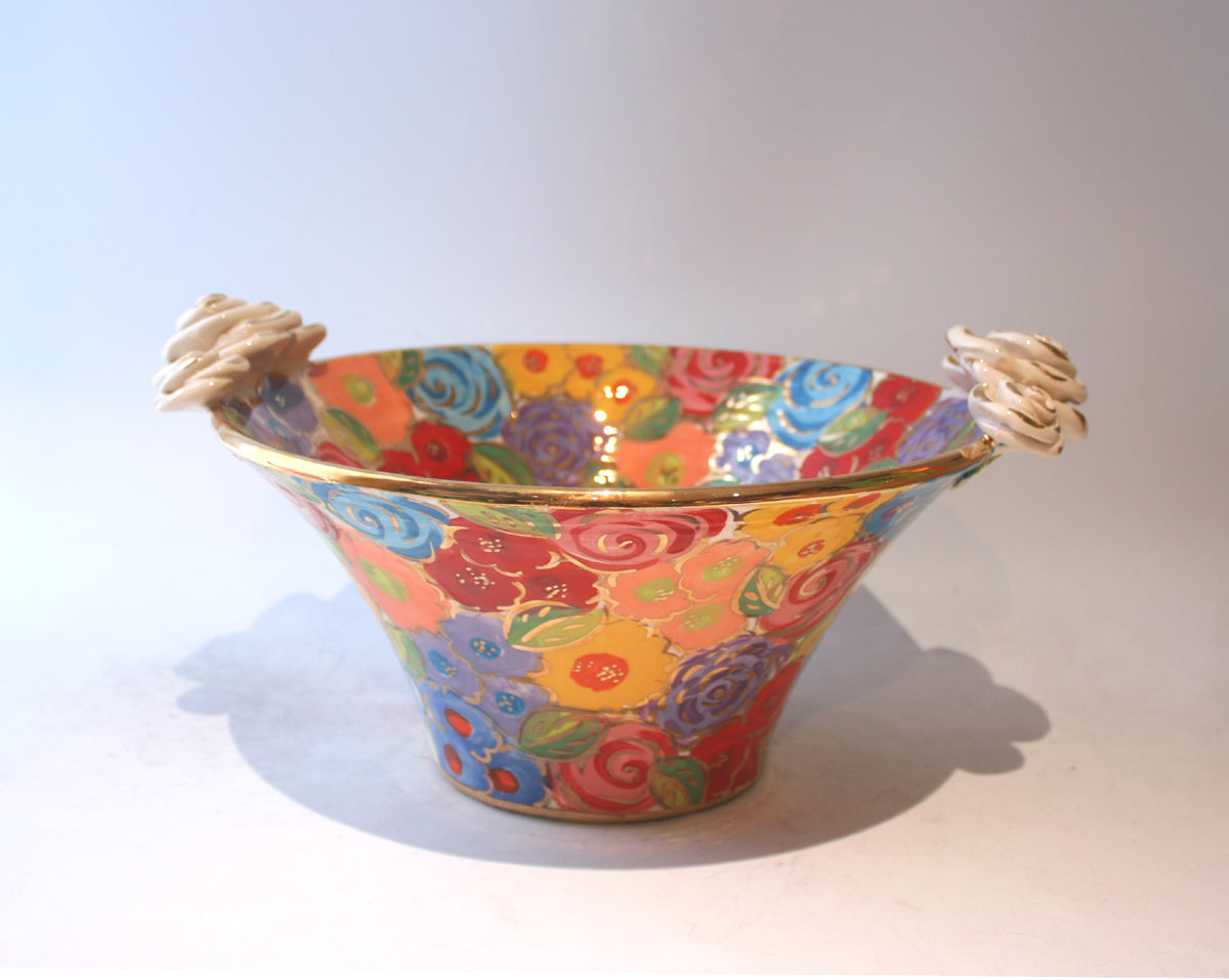 A Medium Rose Edged Serving Bowl measures around 14 inches in diameter and has two clusters of ceramic roses on either side of its rim...this one is painted in "Pastel Blooms" with accents of 24 carat gold!
