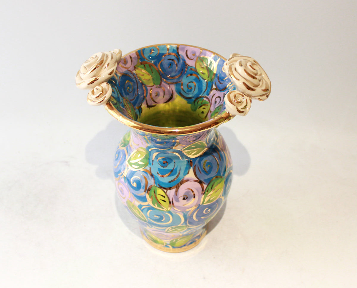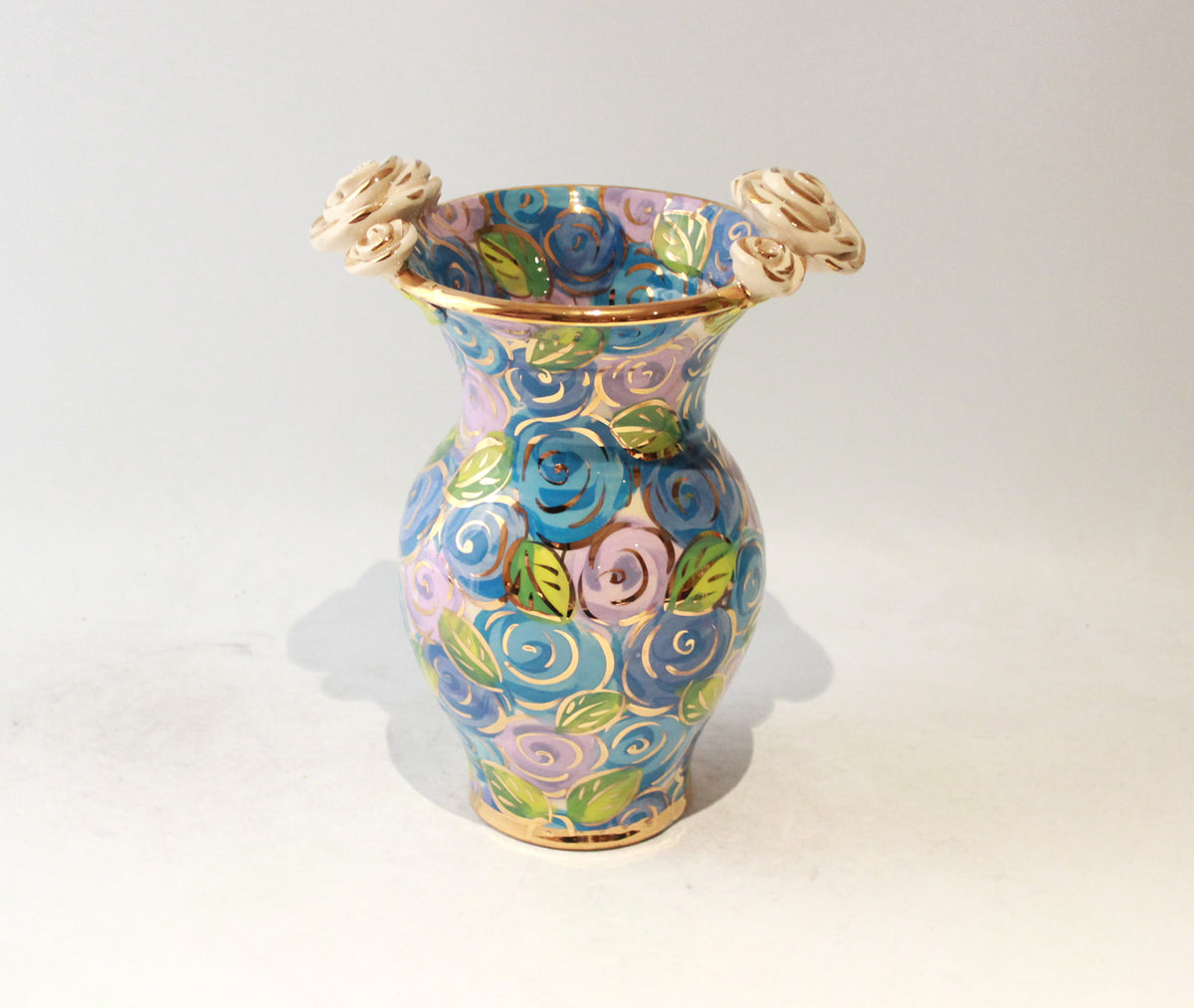 A Medium Vase stands around 10 inches high with Mary Rose's classic shape...curvy and pot-bellied...that comes from her distinctive throwing style! This one features two clusters of ceramic roses on either side of its rim, and is painted in the beautifully blue variation upon the "Rosebush" design, where intricate roses in differing shades of blue are flecked with accents of 24 carat gold