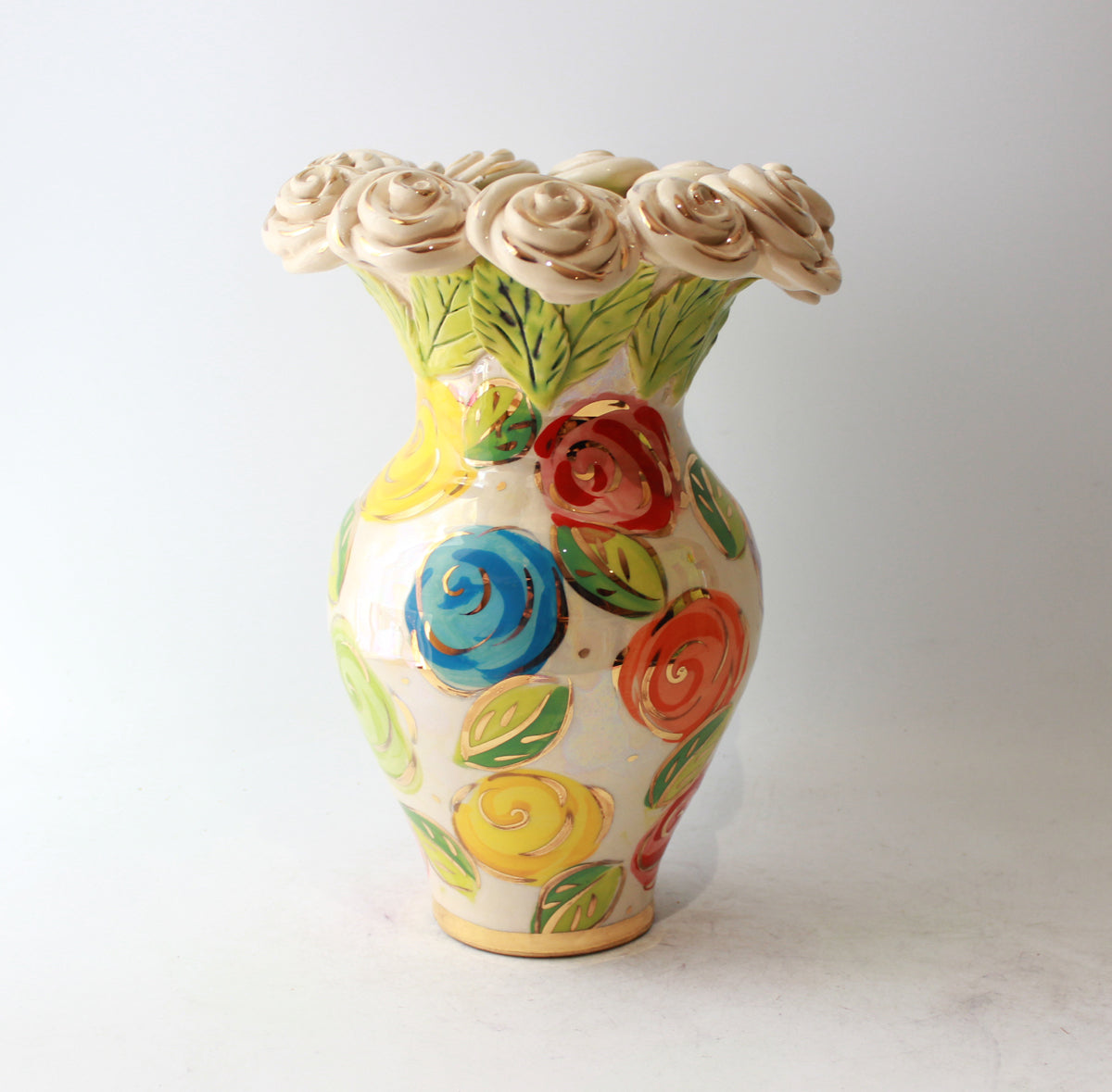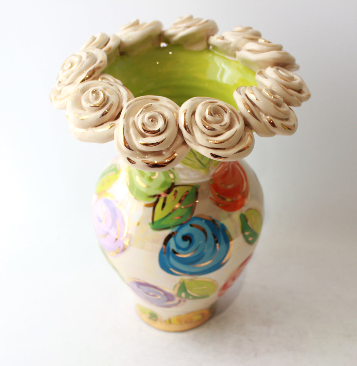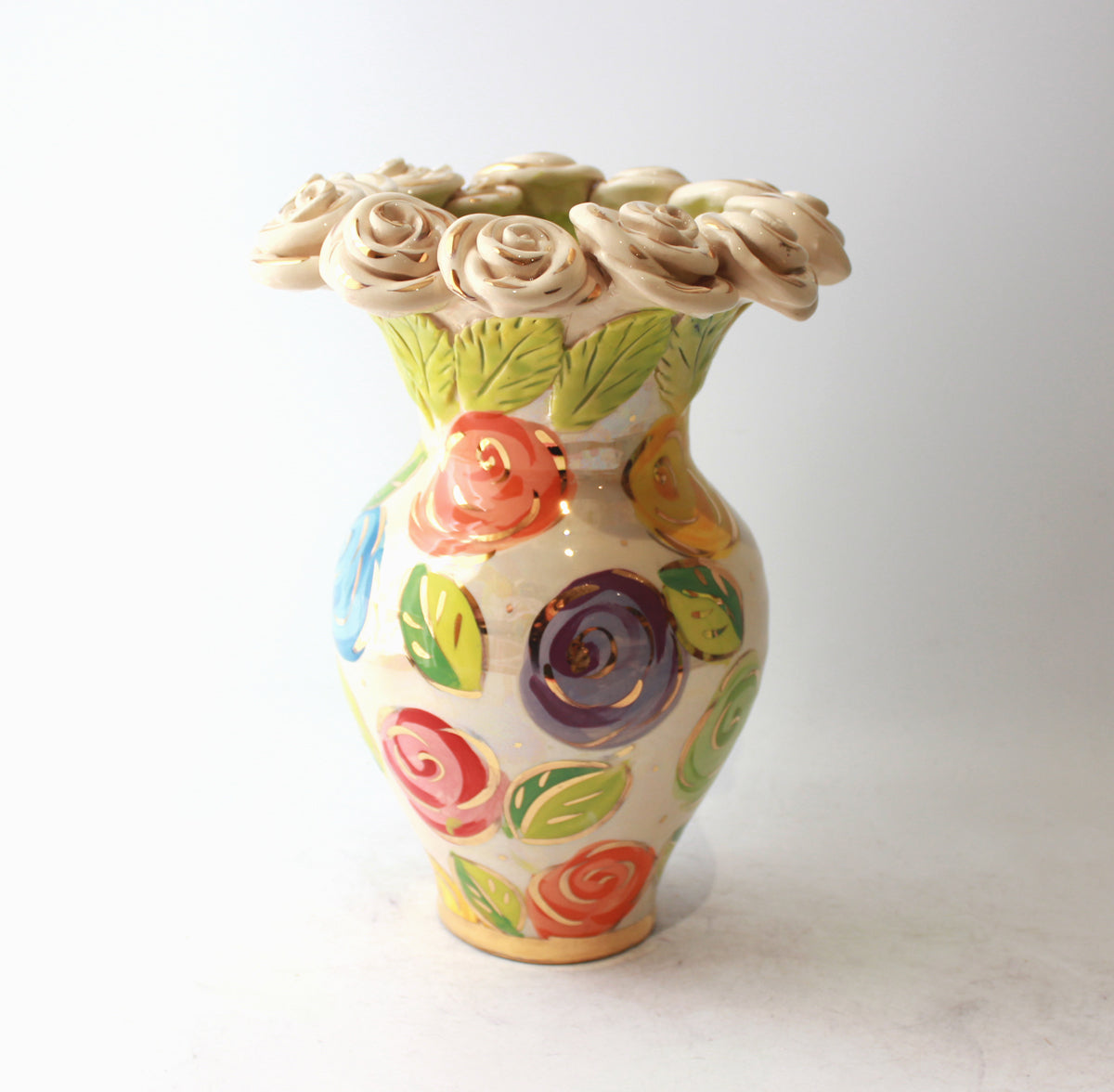 A Medium sized vase made by Mary Rose stands around 10.5 inches tall, and will certainly steal the limelight wherever it is put! This one is encrusted with a row of white gold roses which sit on green leaves, and the design is "Pastel Block Rose" with accents of 24 carat gold throughout...