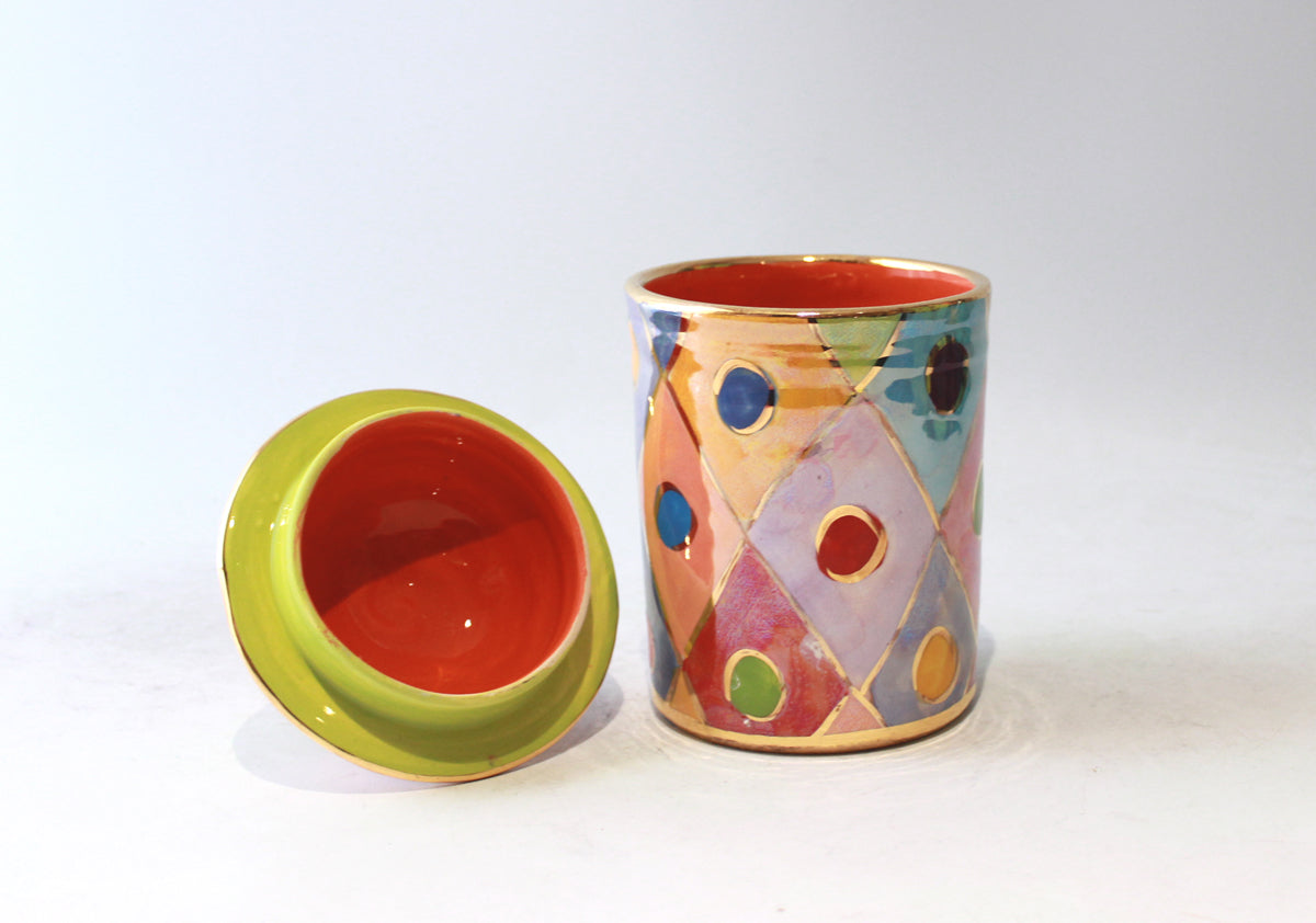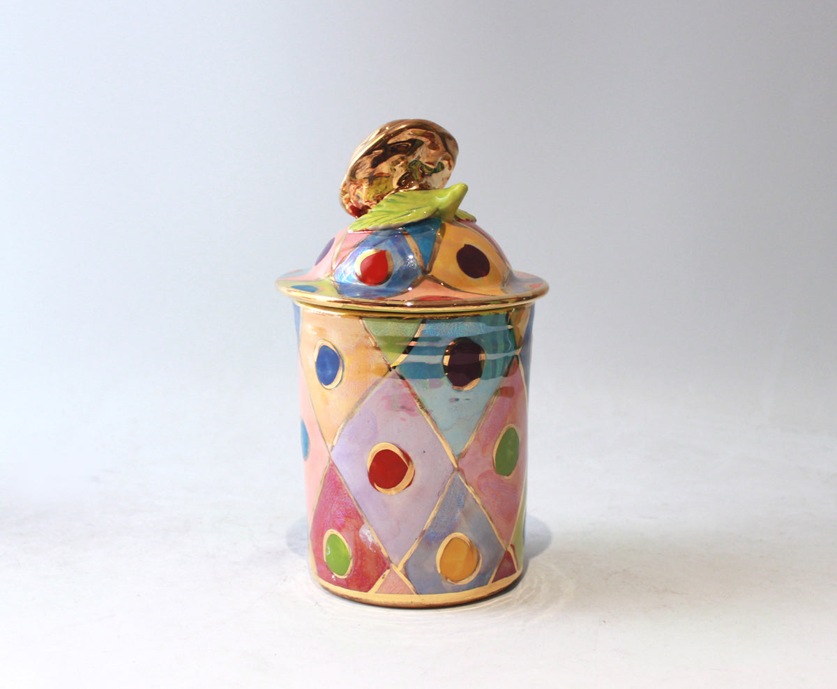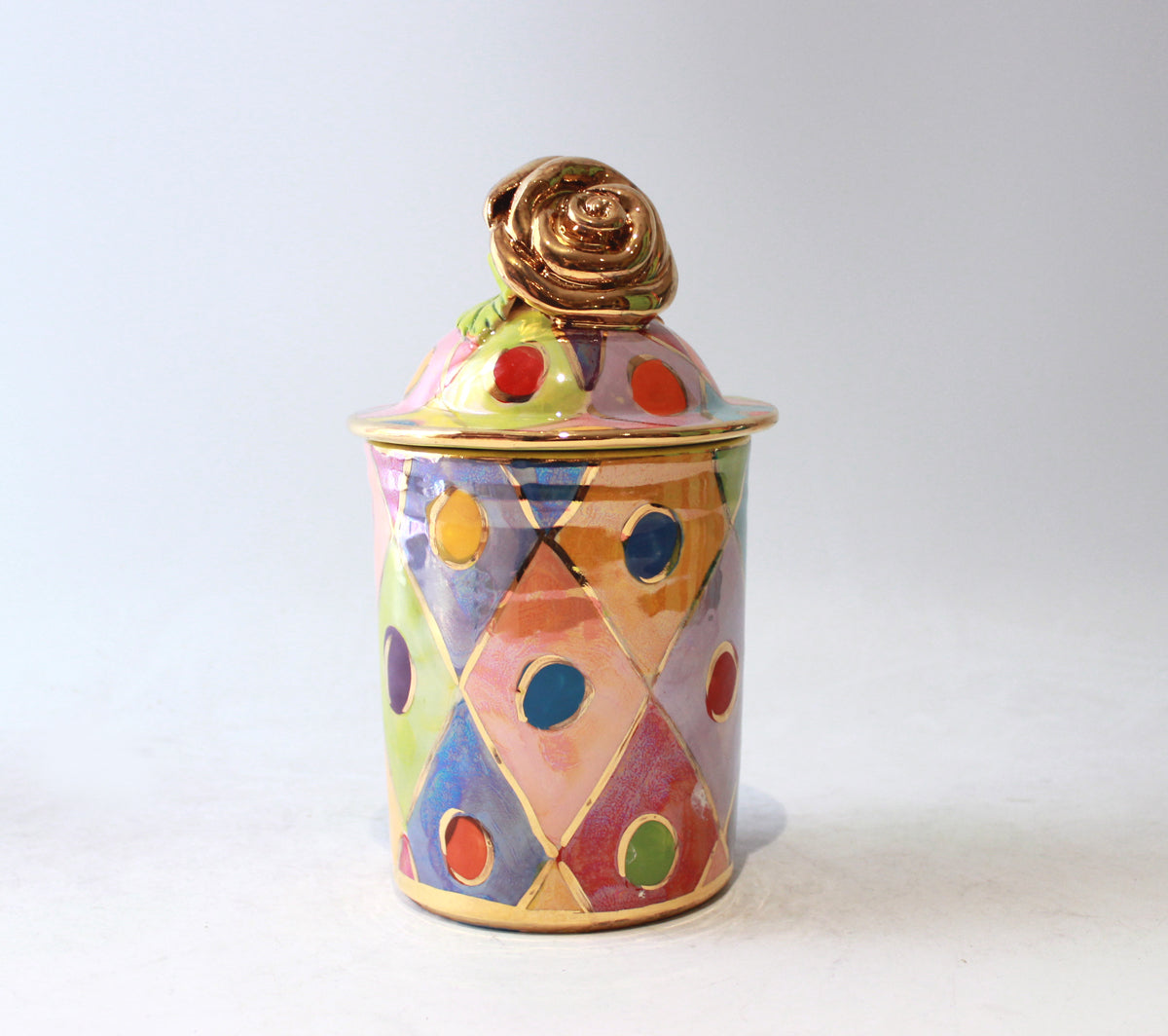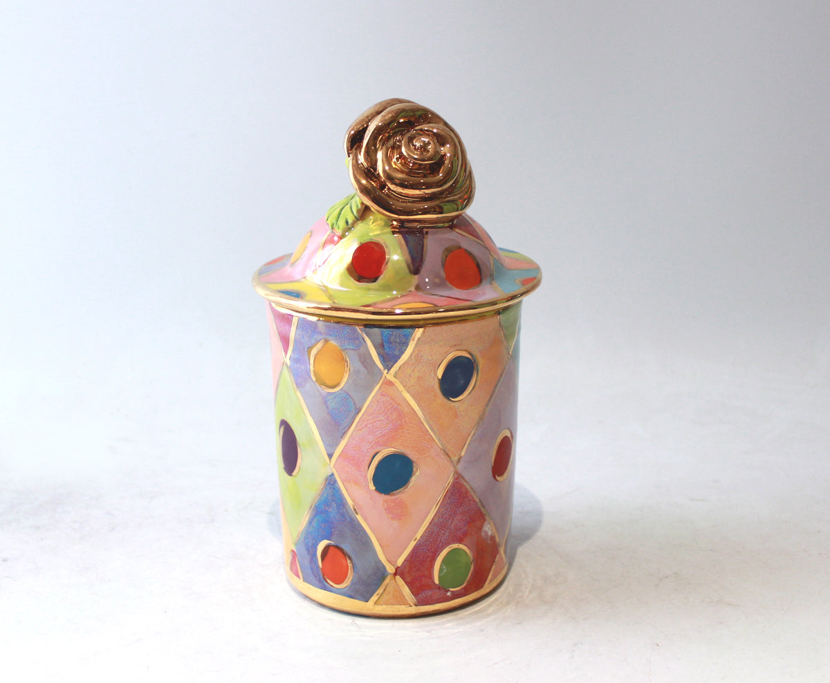 One of Mary Rose's perfectly proportioned Tea Caddies standing just under 9 inches tall...here painted in "Diamonds" design, where colourfully iridescent diamonds are broken up by strokes of 24 carat gold, with a rather large and eye-catching 24 carat gold rose atop its lid...