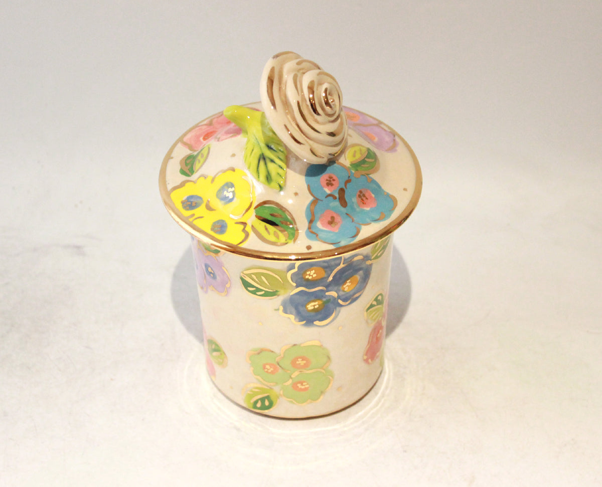One of Mary Rose's perfectly proportioned Tea Caddies standing just under 9 inches tall...here, painted in "Petit Fleur" design on an iridescent Mother of Pearl background, with a large ceramic rose atop its lid and accents of 24 carat gold throughout!
