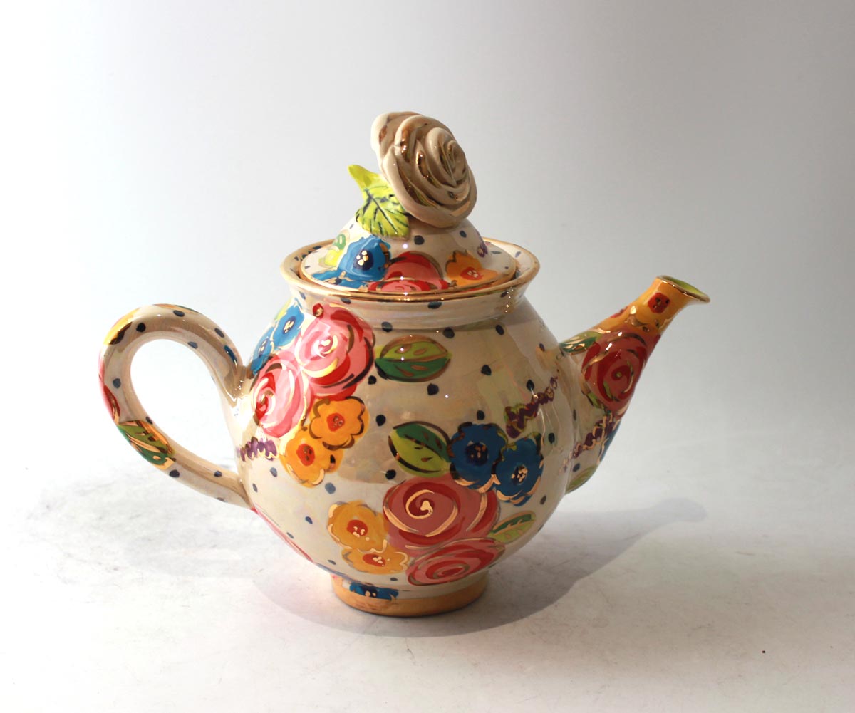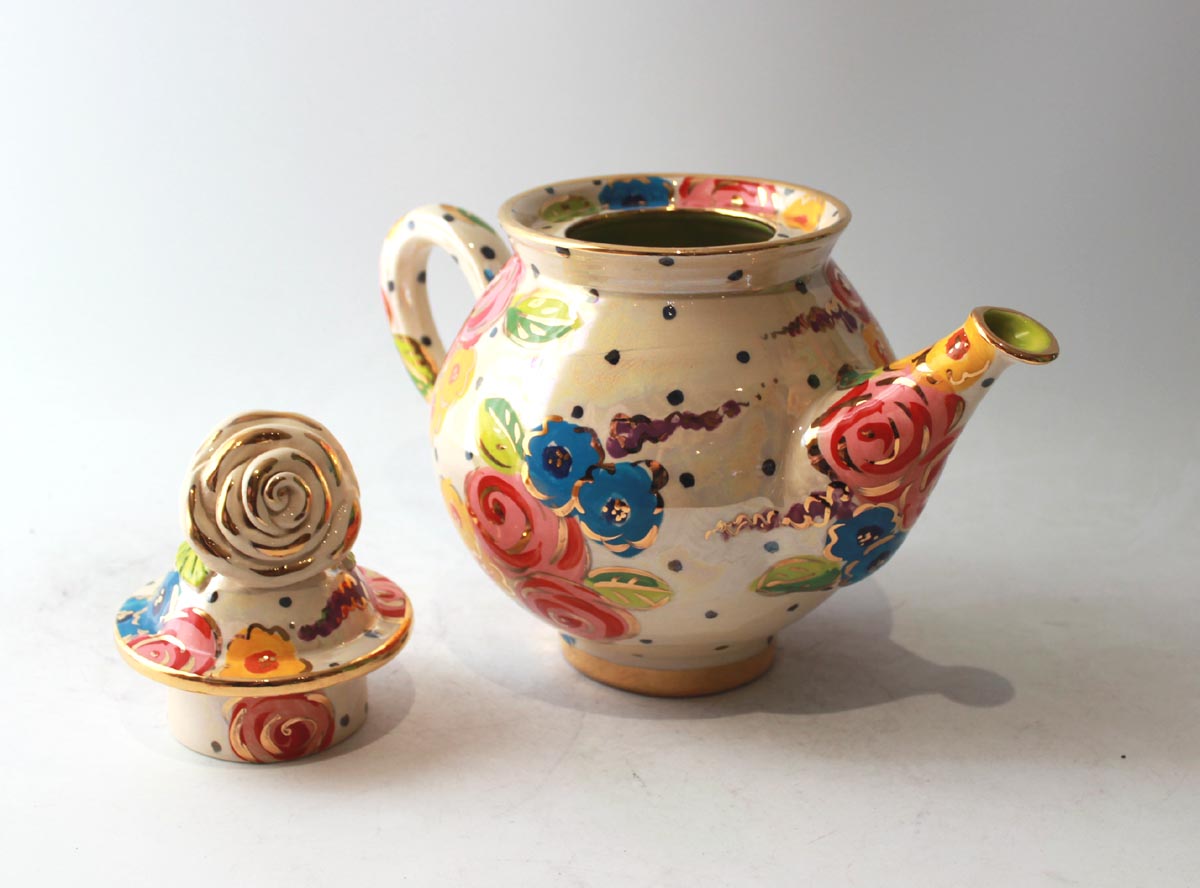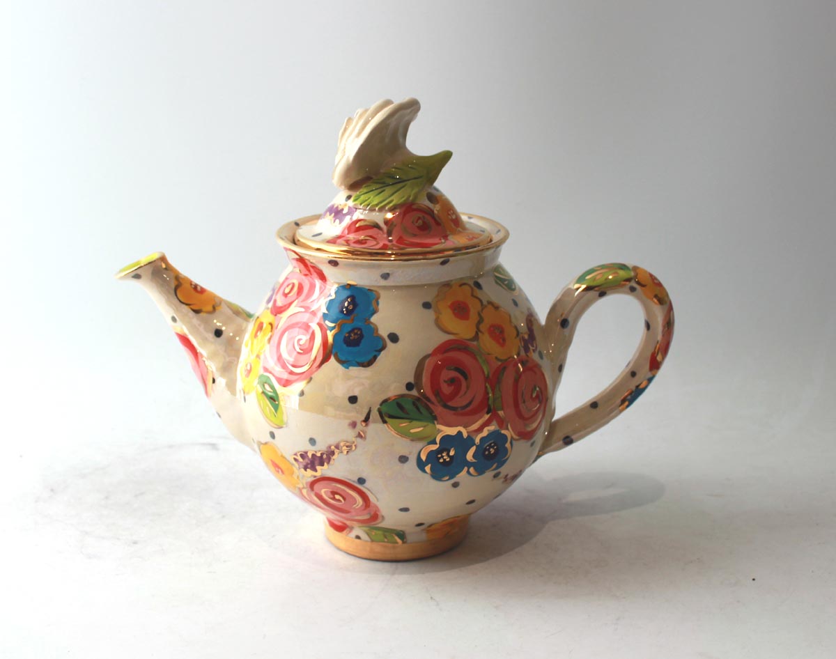 Mary Rose's Medium Teapots are also called "4 cup" Teapots, as this is how many cups of tea one would expect to get! This one is painted in "Vintage Floral" design, sitting on a mother of pearl background with accents of 24 carat gold....