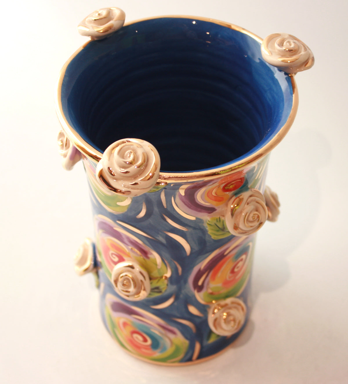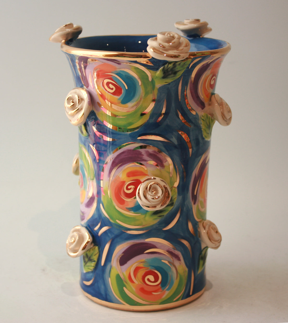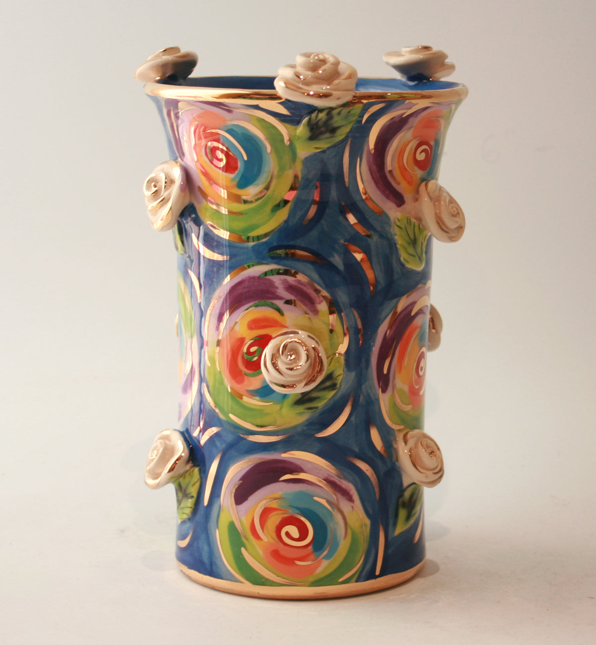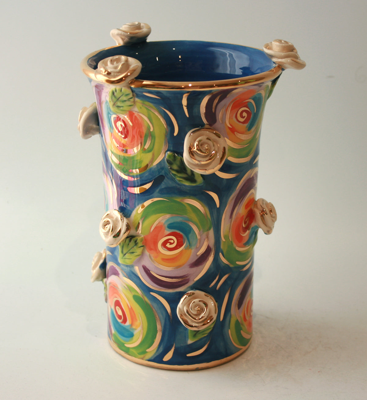 This Vase is slightly different than the rest of Mary Rose's creations as it lacks the classic curved edges, however it certainly packs a punch in "Swirls" with white and gold roses studded all over its surface...