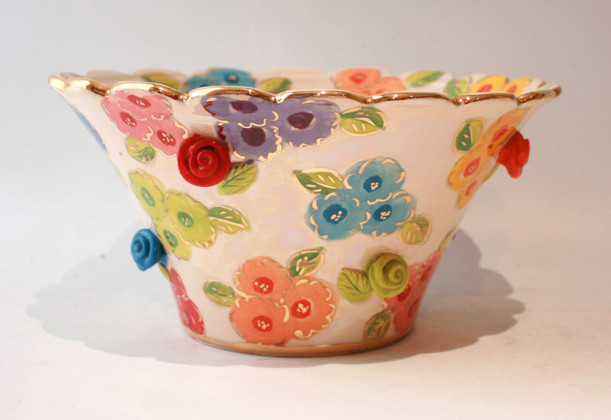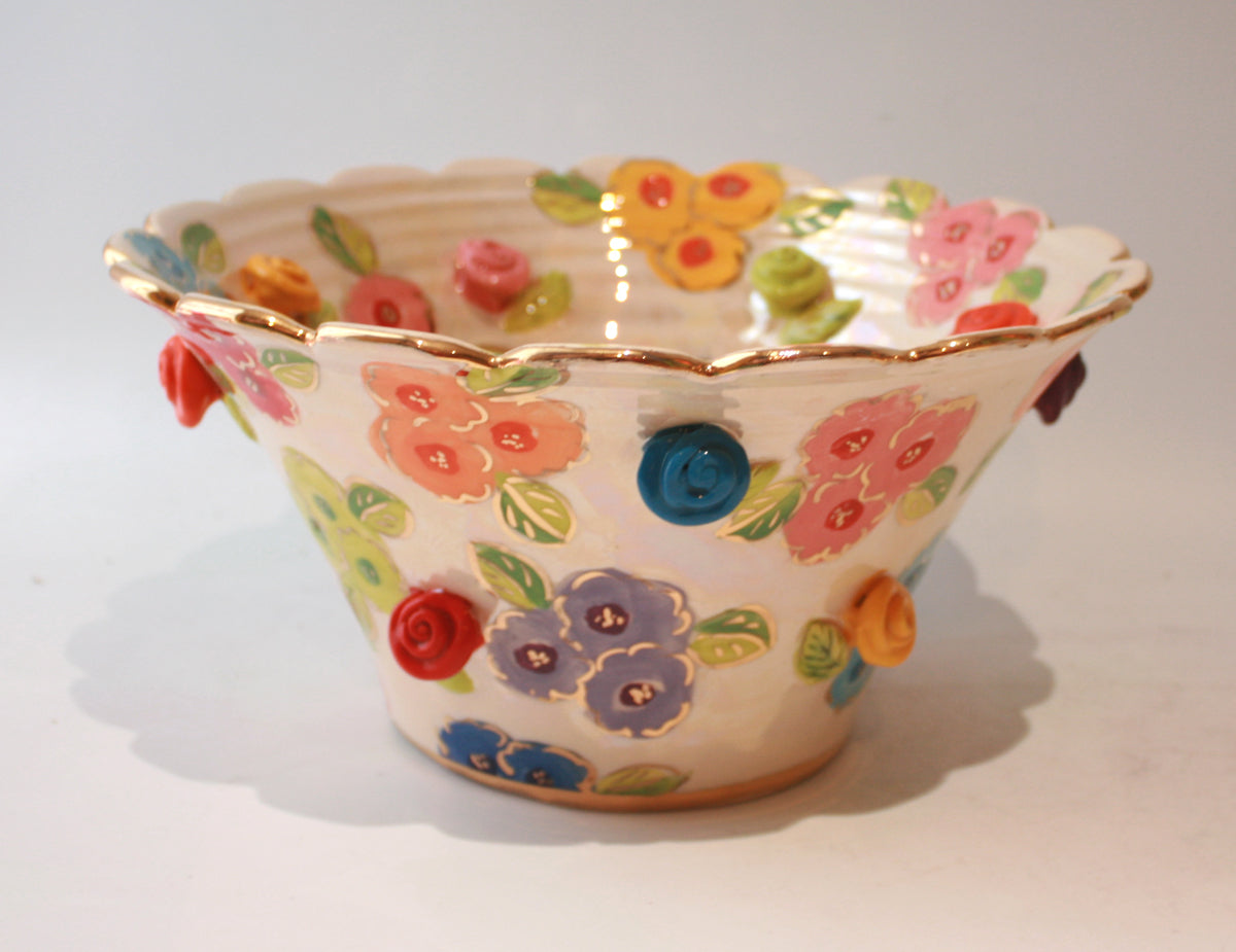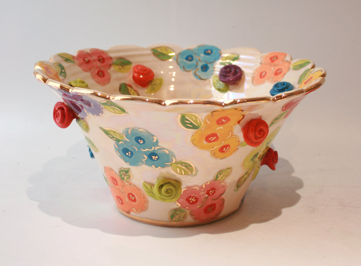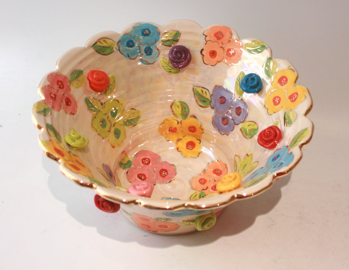 This Medium Serving Bowl is painted in a new Mary Rose Young design, "Petit Fleur", and has a scalloped gold rim...there are also colourful ceramic roses that have been studded across its surface, and the bowl is around 14 inches in diameter
