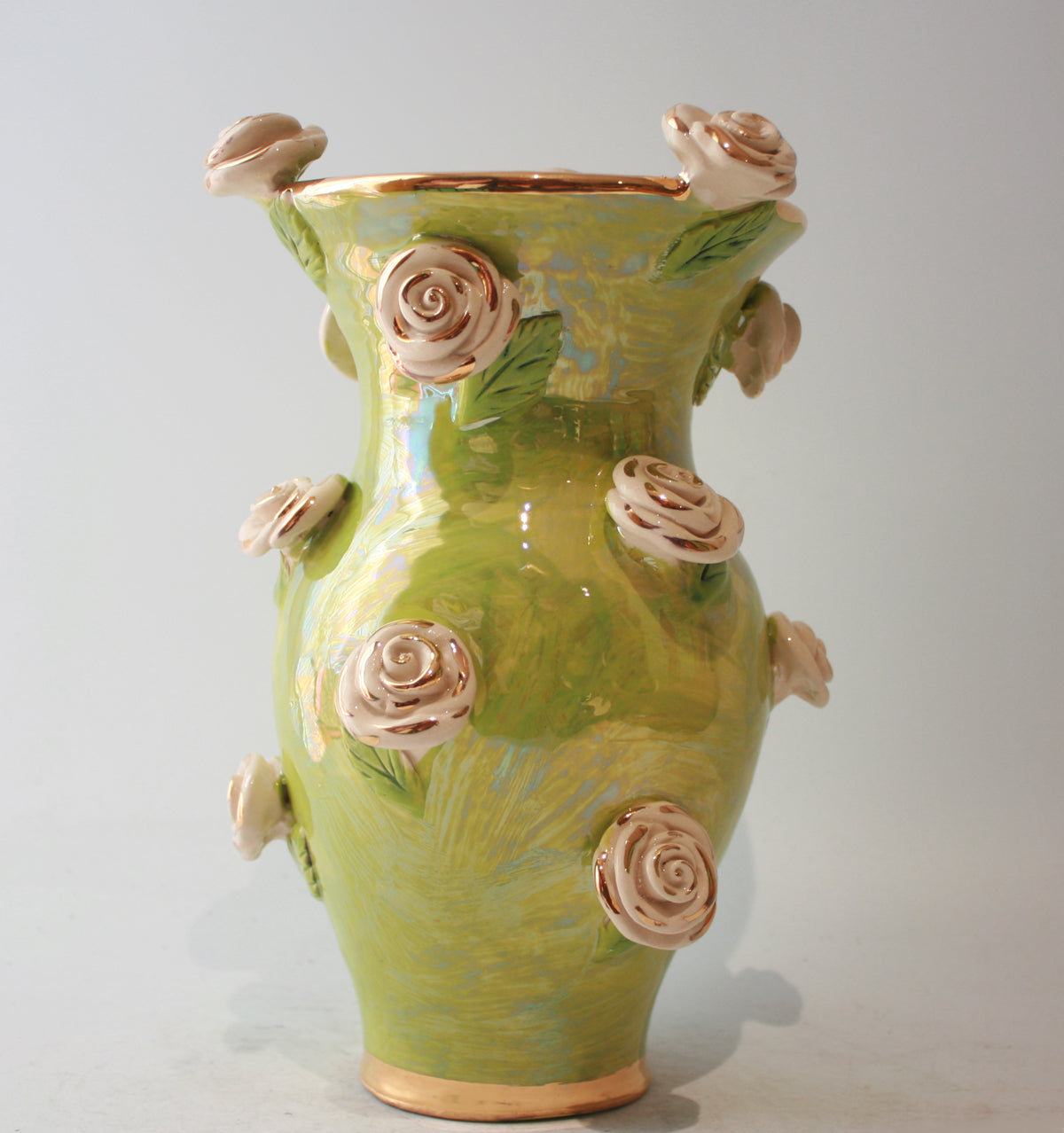 A Medium Vase made by Mary Rose stands around 10 inches tall, and this one has had the "Rose Treatment", with gold and white ceramic roses stuck all over its surface on a background of iridescent green...