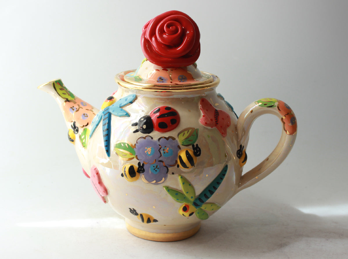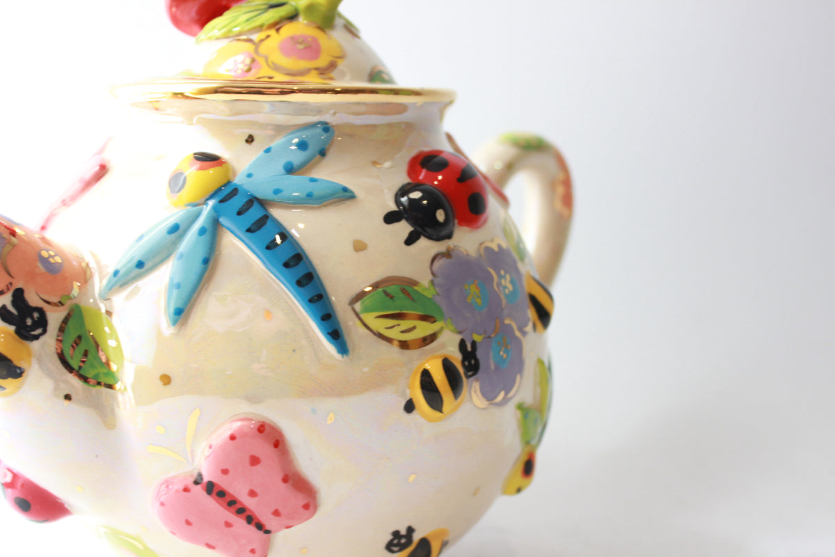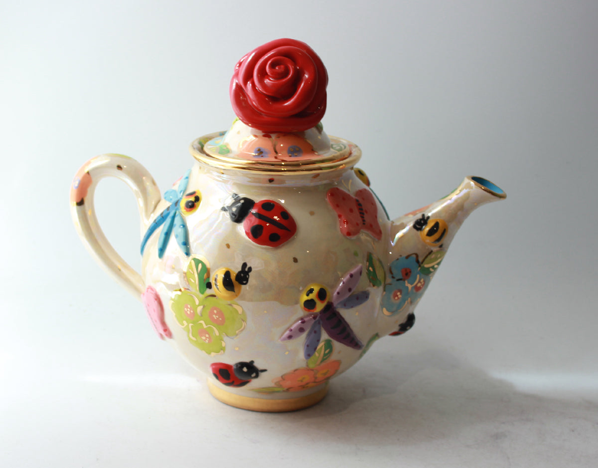 A Medium Teapot whose surface has mysteriously become infested with cheerful colourful insects
