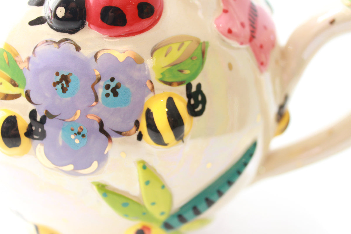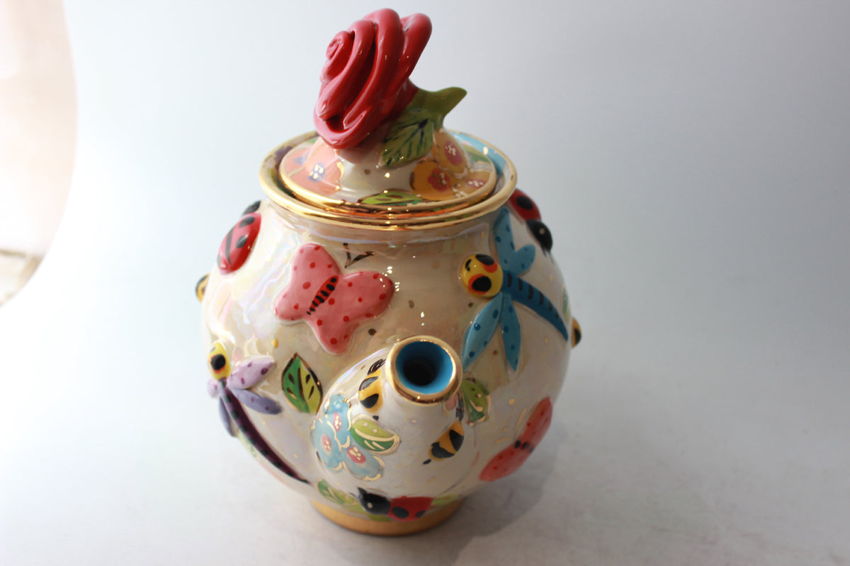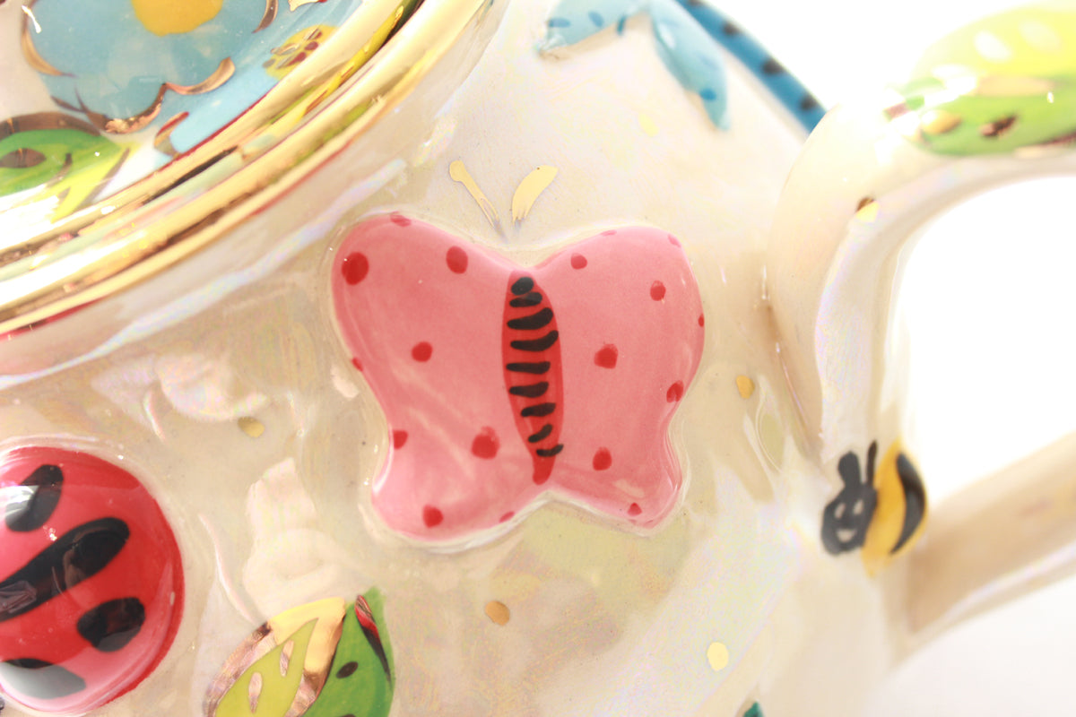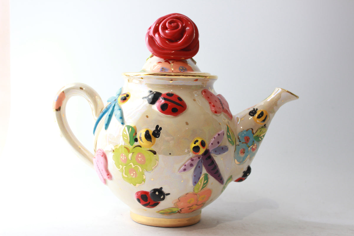 A Medium Teapot whose surface has mysteriously become infested with cheerful colourful insects