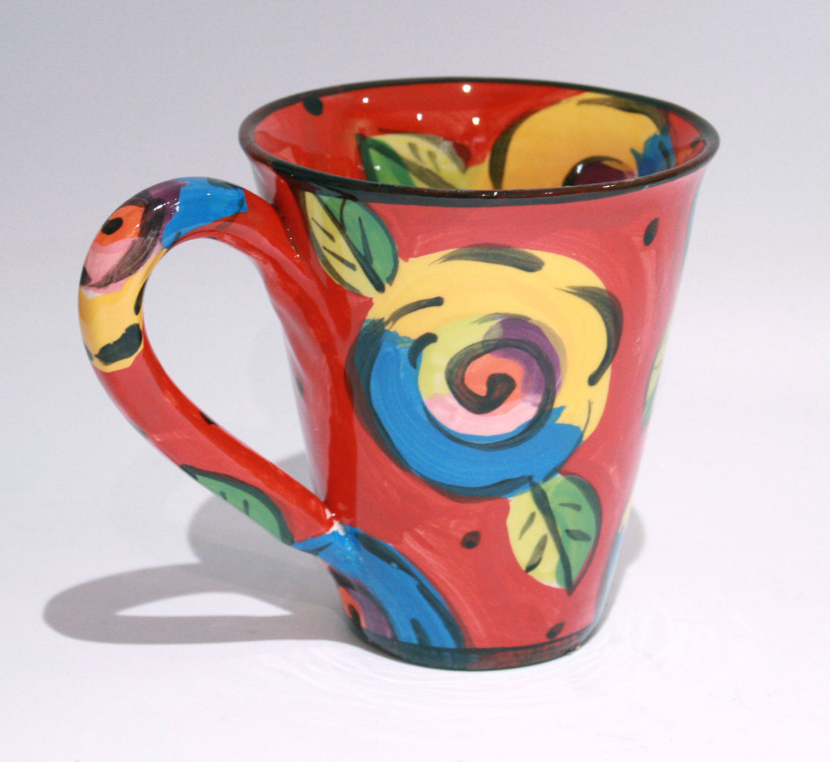 This Large Mug features a classic design "New Rose" on a background of bright red which is sure to add a touch of fun to your morning tea! The price is for one only however you can see how beautiful they look in a set...if you'd like all 4 you would have to order them individually and make a note of your colour preferences!
