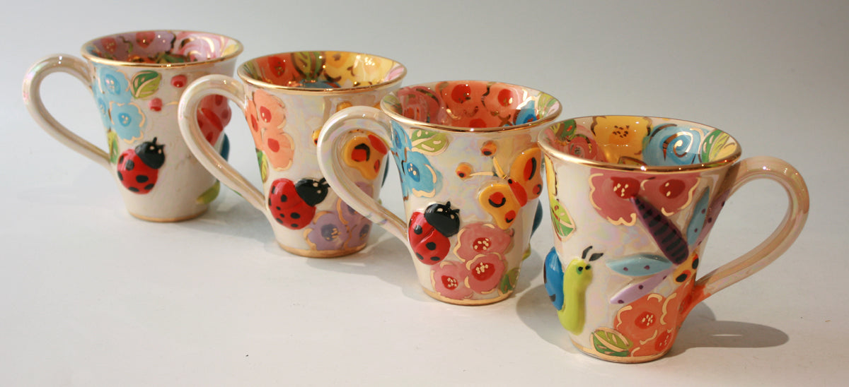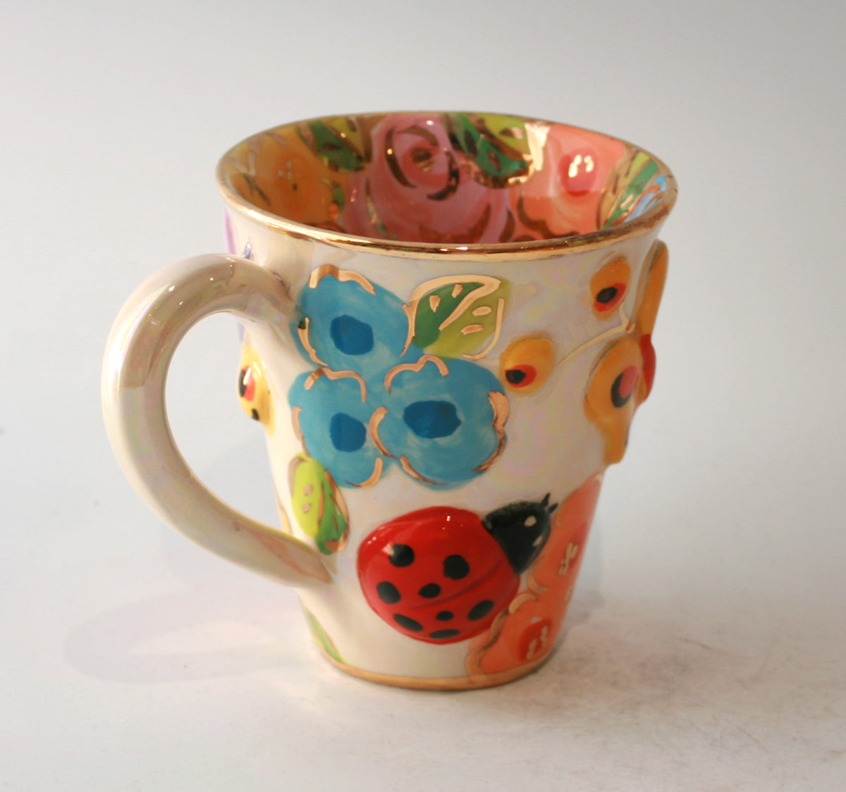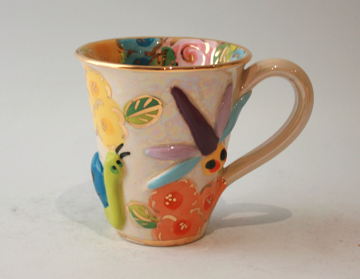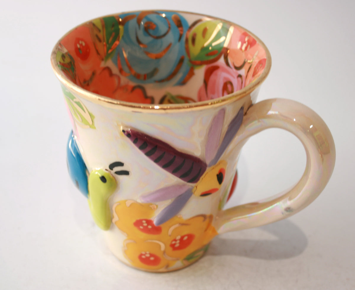 Mary Rose's new for 2020 design "Bugs" features adorable ceramic creatures on a background of iridescence...the inside of this mug is spring-time flowers painted in all pastels and this gives the most magical effect! The mug stands around 4.25 inches tall, and the price is unfortunately for one only.