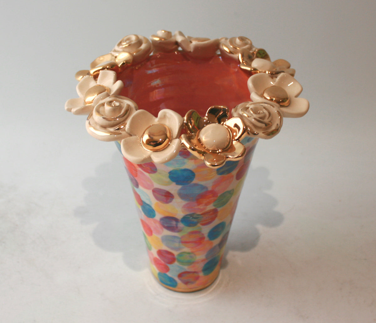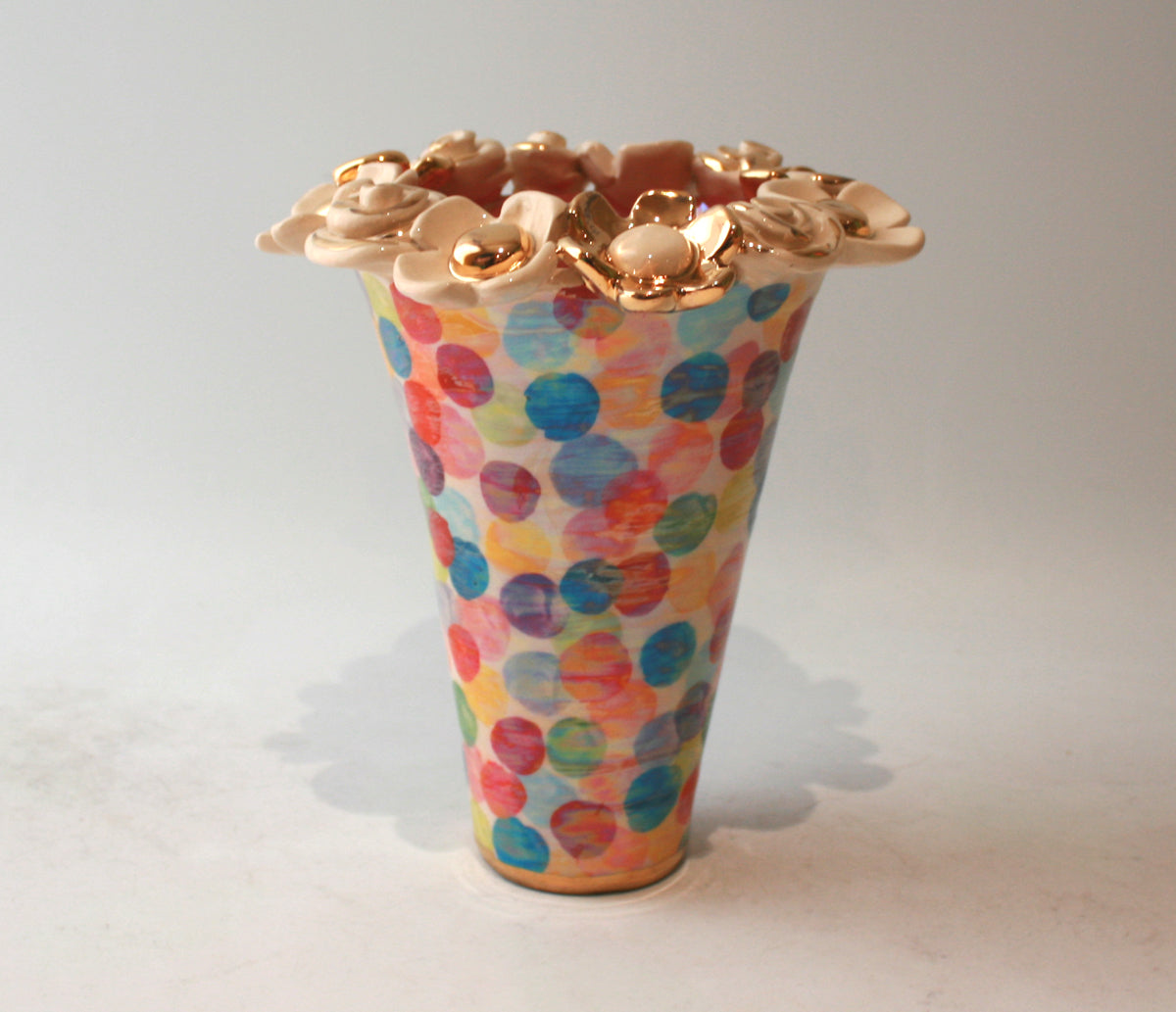 A 9 inch high vase that has been "Encrusted" with gold and white flowers, with an elegant flared shape...the design is a very colourful "Buble" which has then been painted over with a beautiful iridescence..