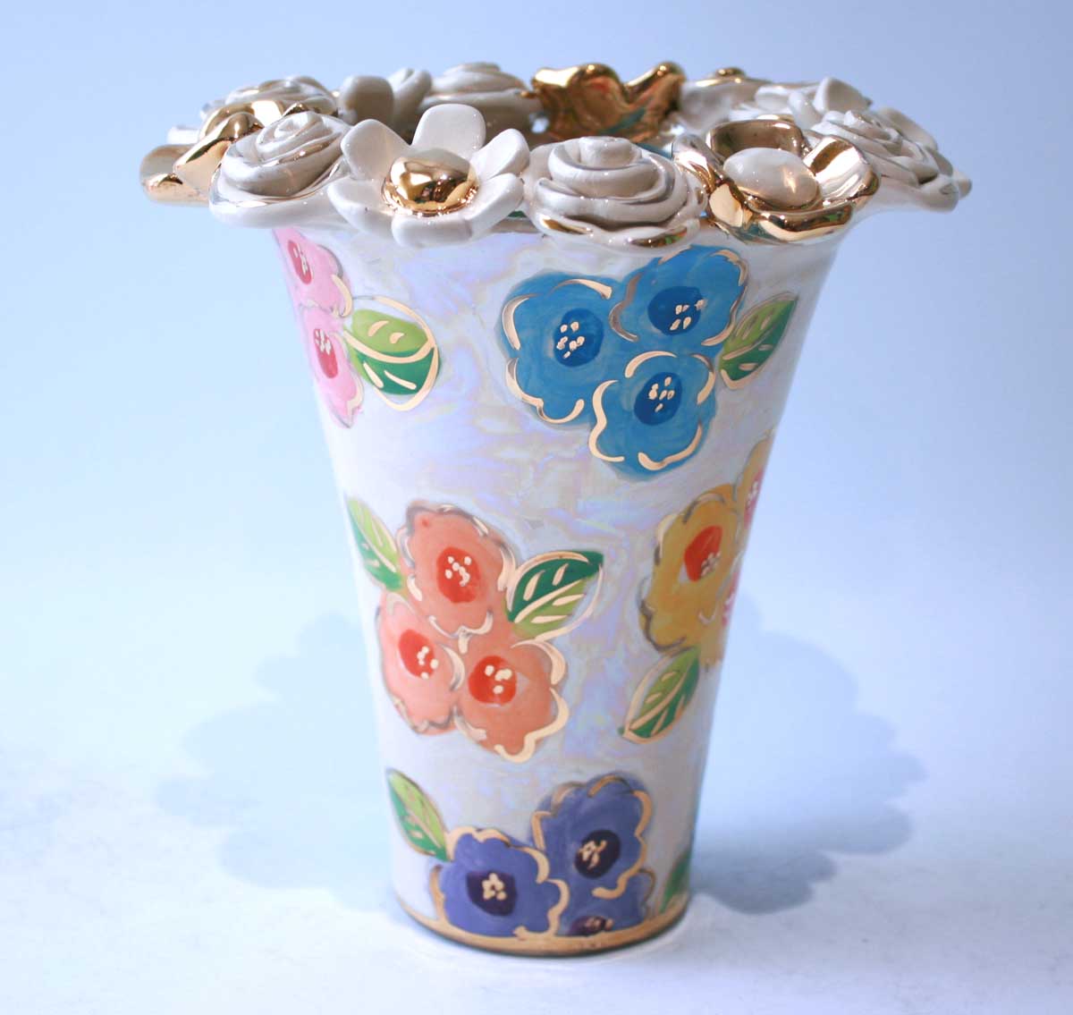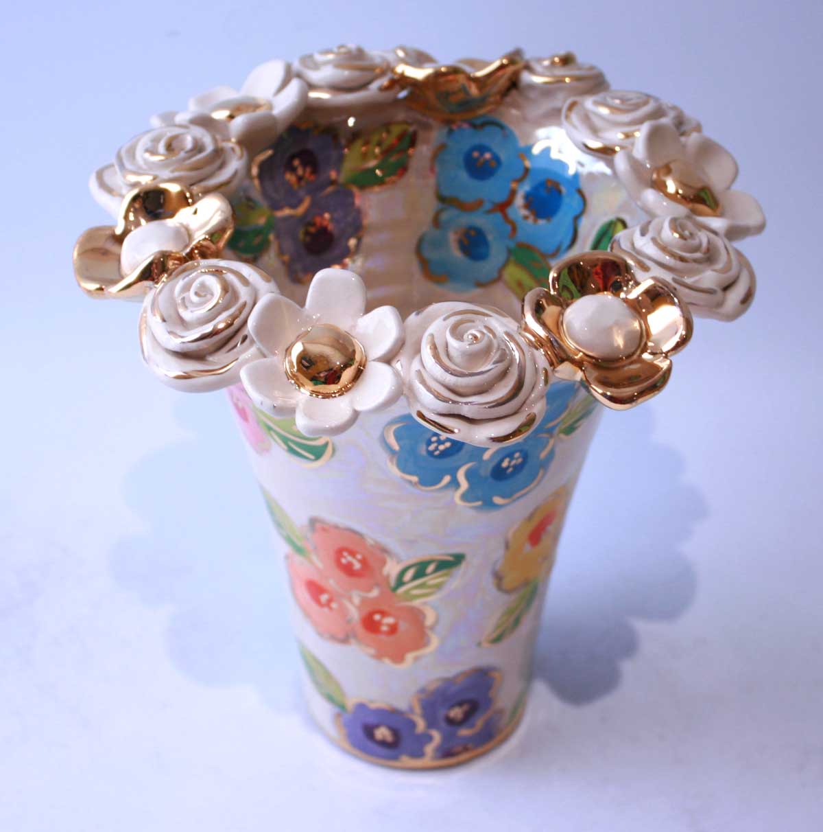A 9 inch high Vase that has been "encrusted" with distinctive gold and white flowers...the design is new for 2020 "Petit Fleur" which features colourful blooms on a beautifully iridescent background...