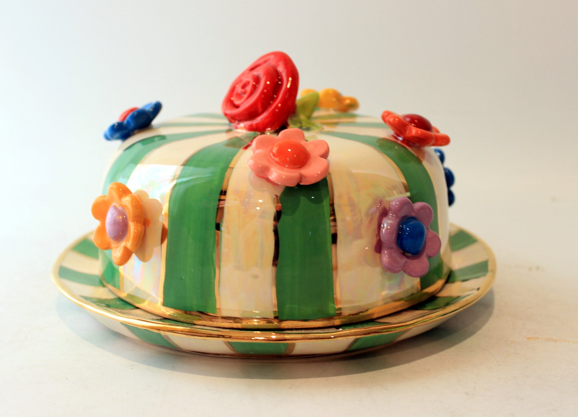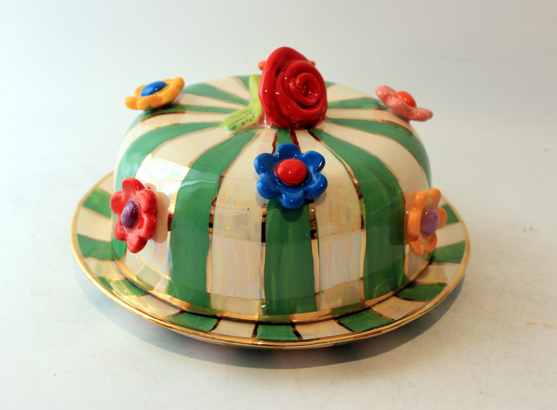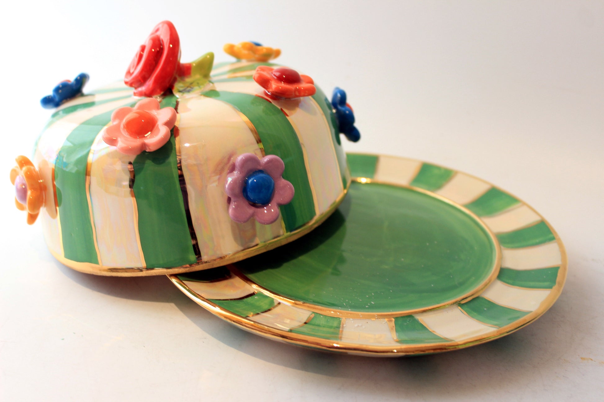Multiflower Studded Butter Dish Green and White Stripe